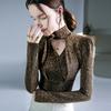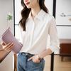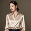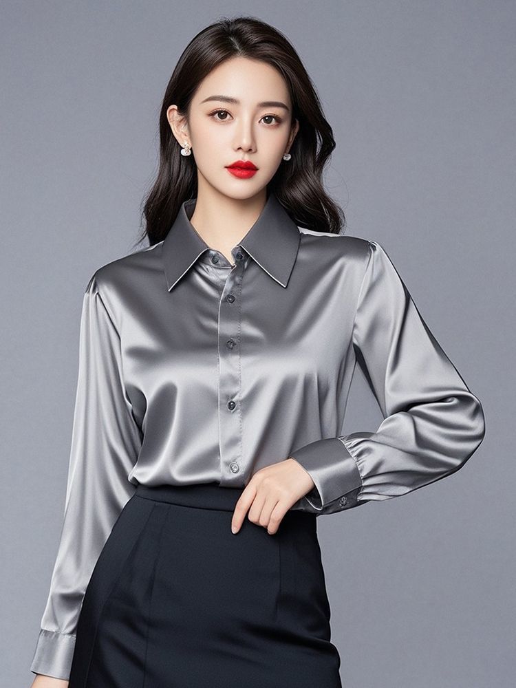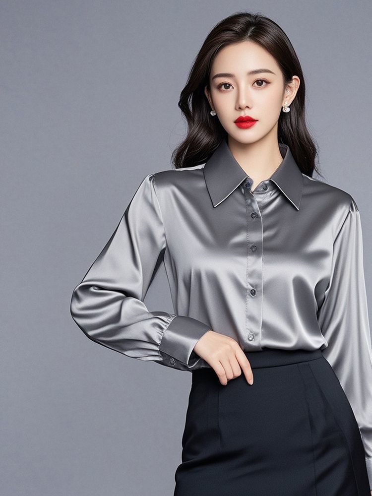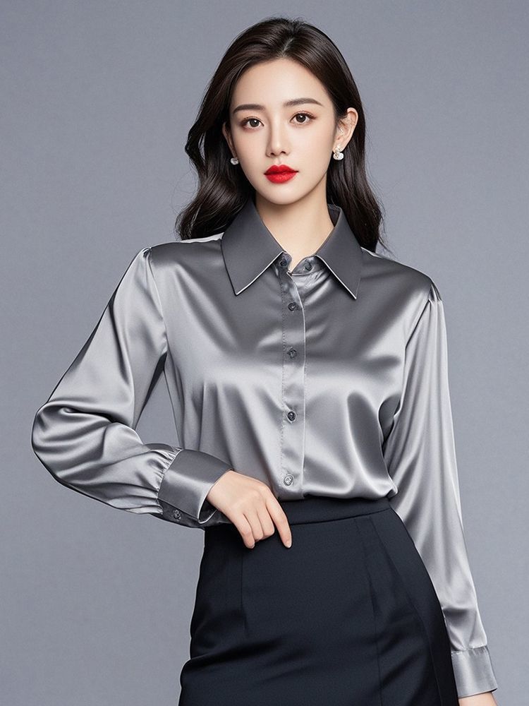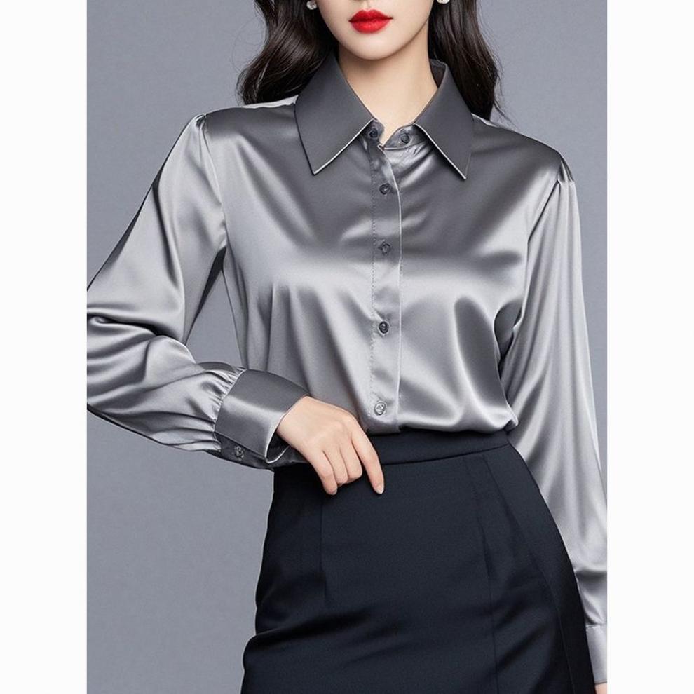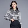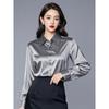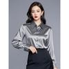 Camisa gris satinada de acetato profesional elegante de alta calidad para mujer, de manga larga, con base drapeada y sedosa para primavera y otoño.