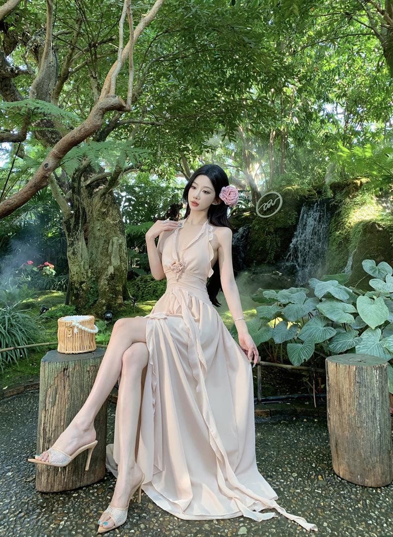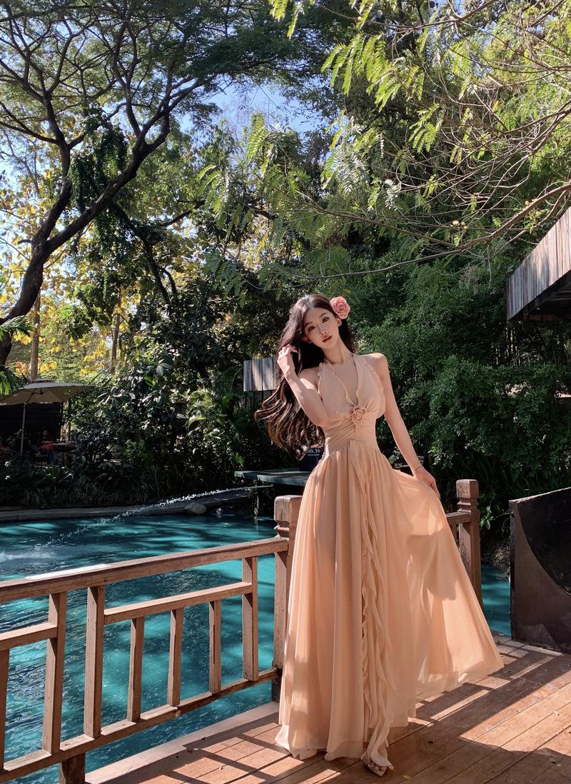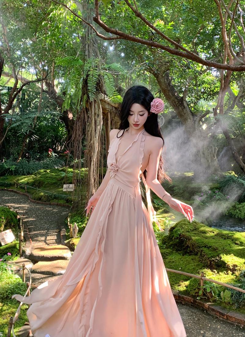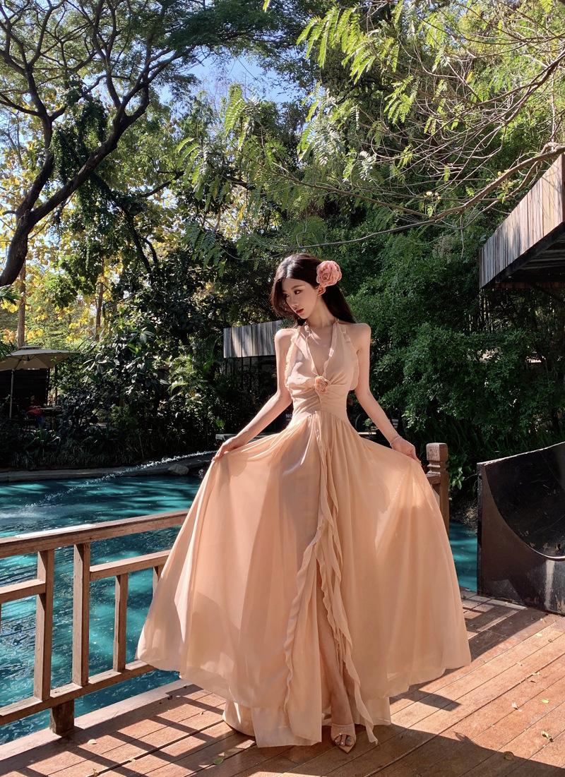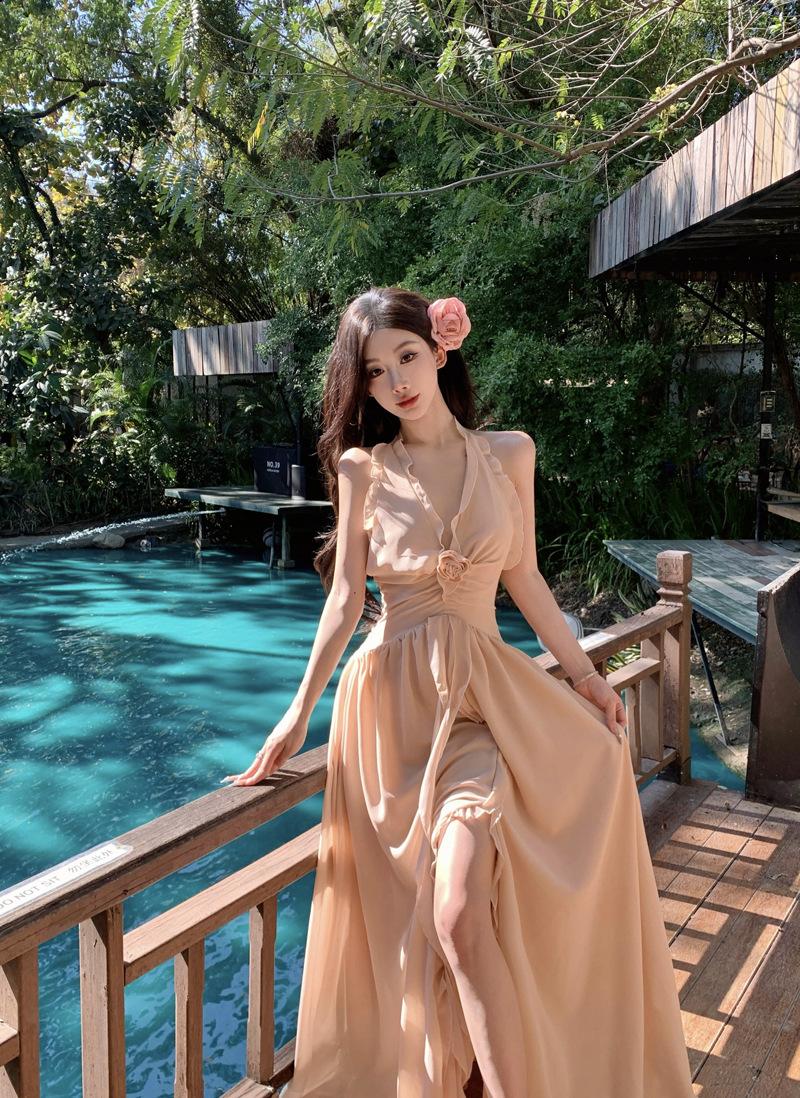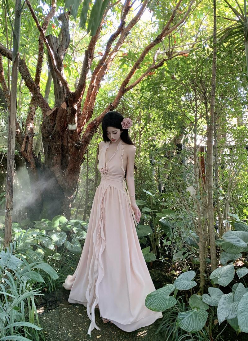 Hermoso vestido estilo francés con escote en V y tirantes tipo halter para mujer, vestido largo playero de verano con espalda descubierta y súper hada sexy para vacaciones en la playa.