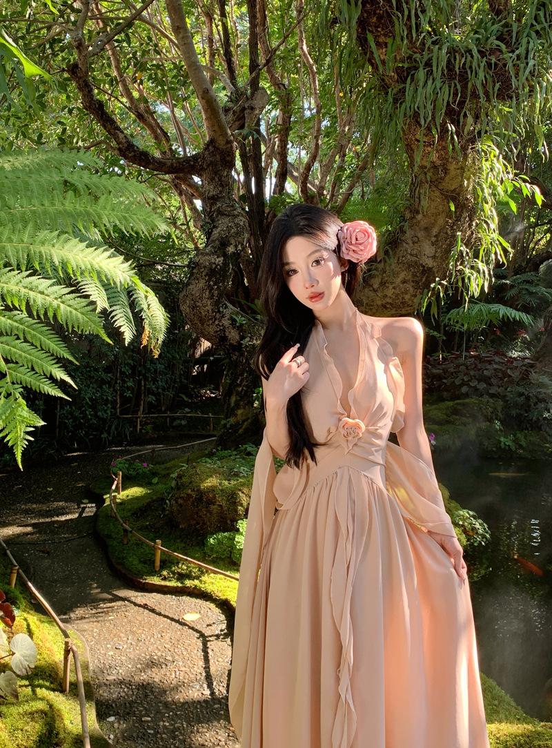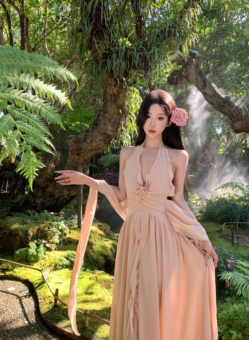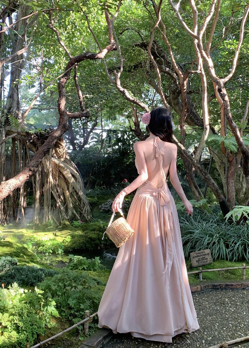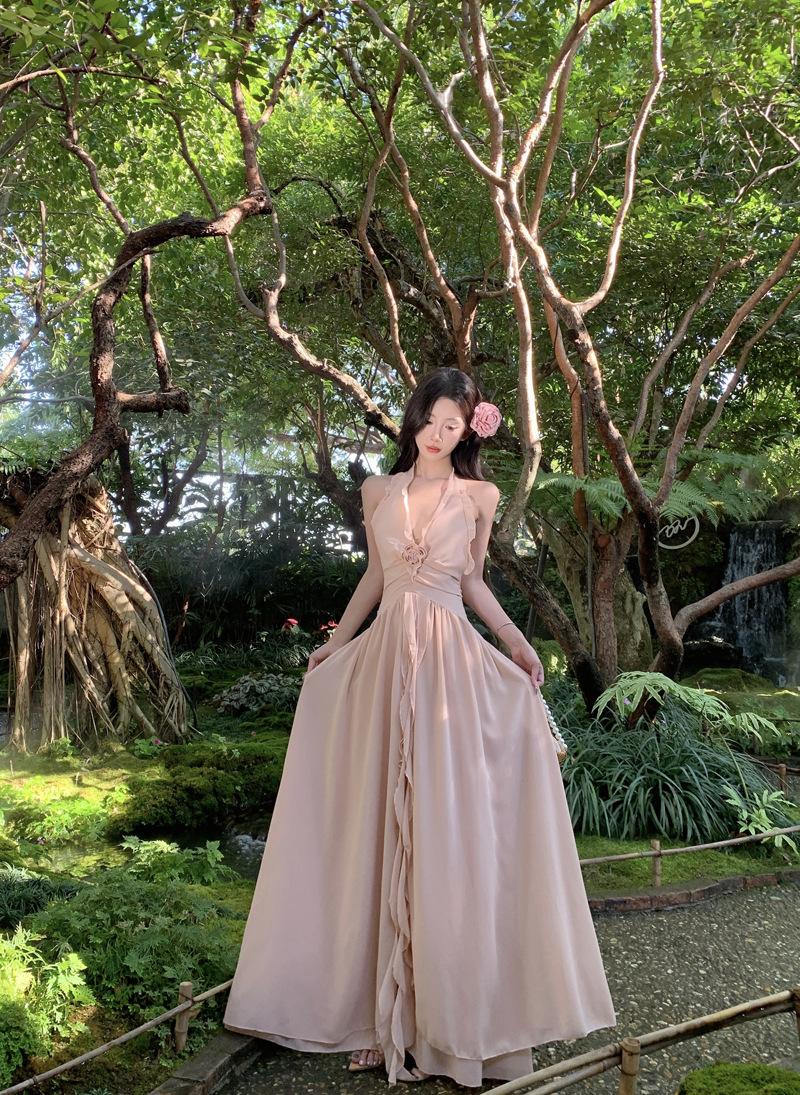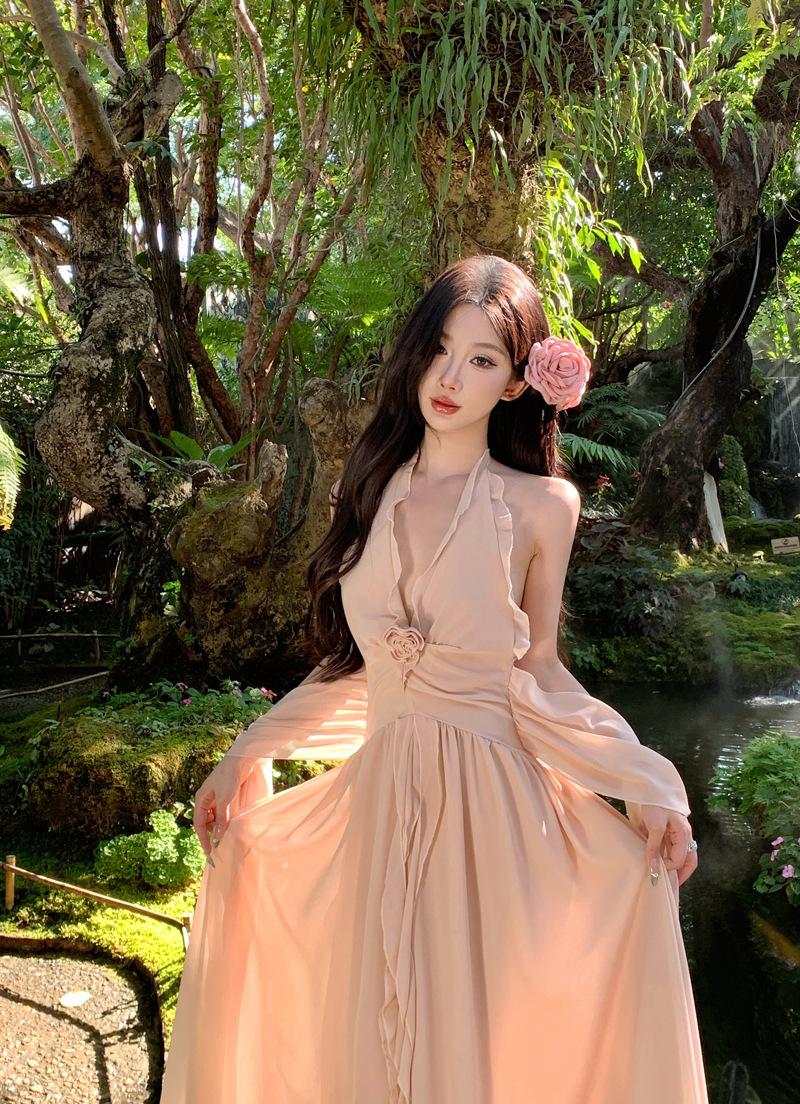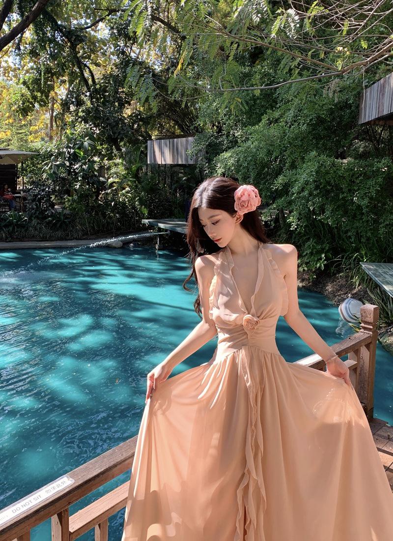 Hermoso vestido estilo francés con escote en V y tirantes tipo halter para mujer, vestido largo playero de verano con espalda descubierta y súper hada sexy para vacaciones en la playa.