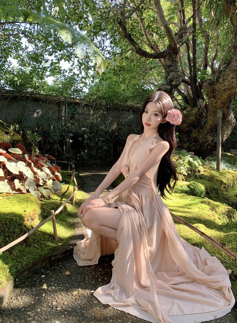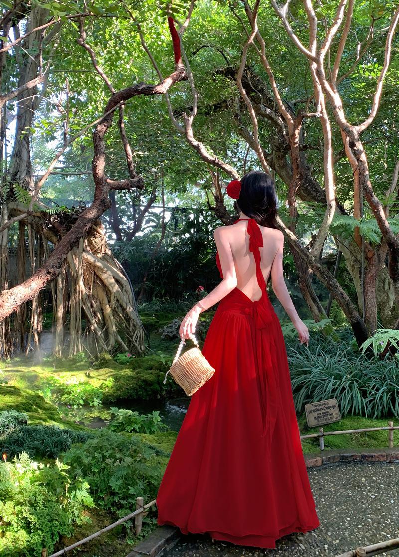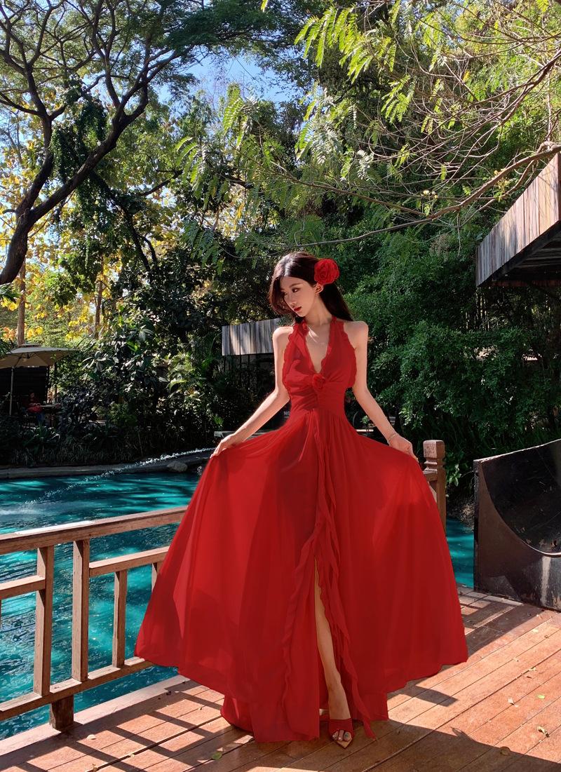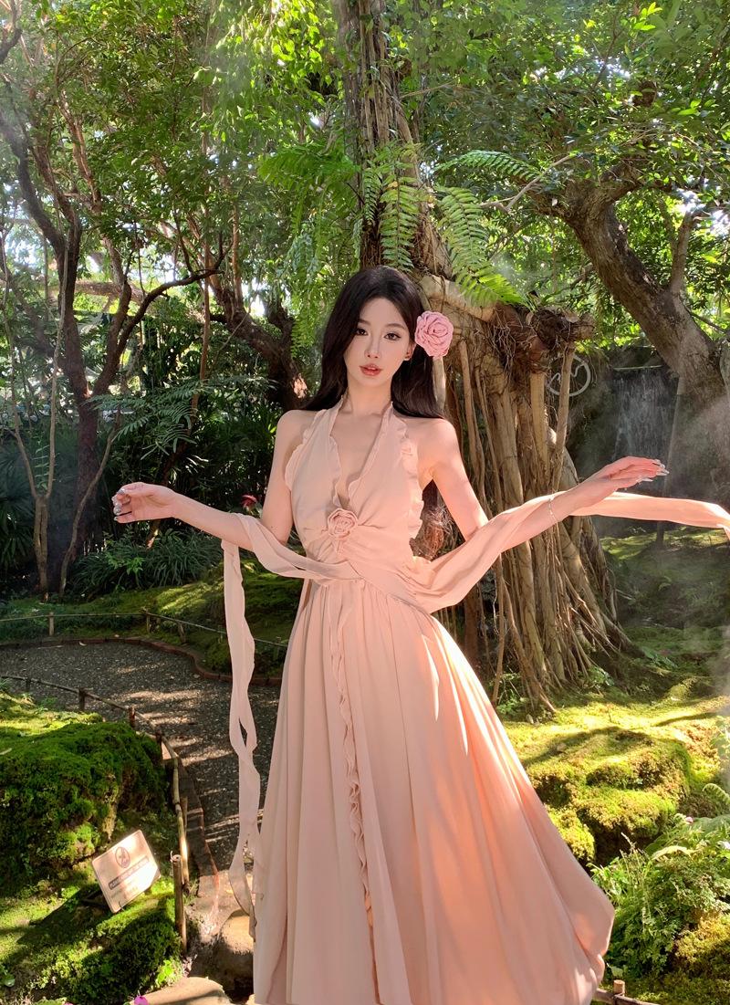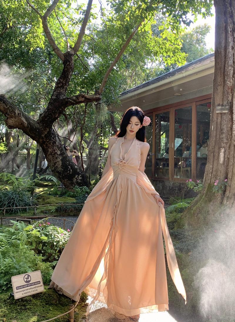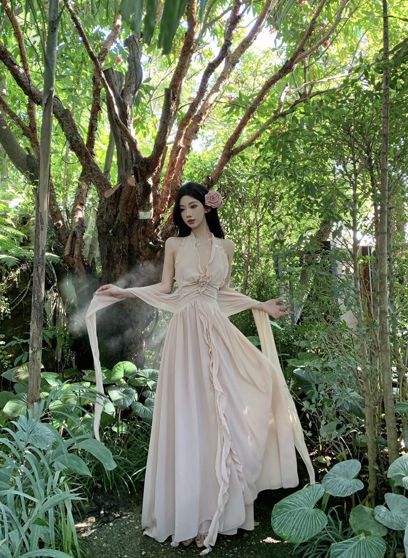 Hermoso vestido estilo francés con escote en V y tirantes tipo halter para mujer, vestido largo playero de verano con espalda descubierta y súper hada sexy para vacaciones en la playa.
