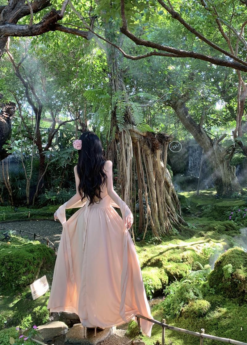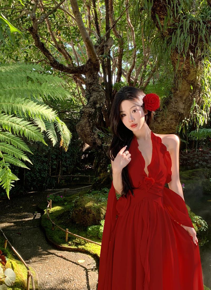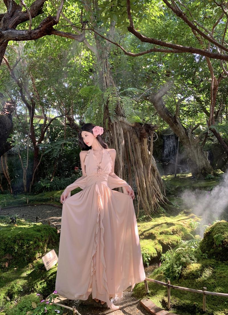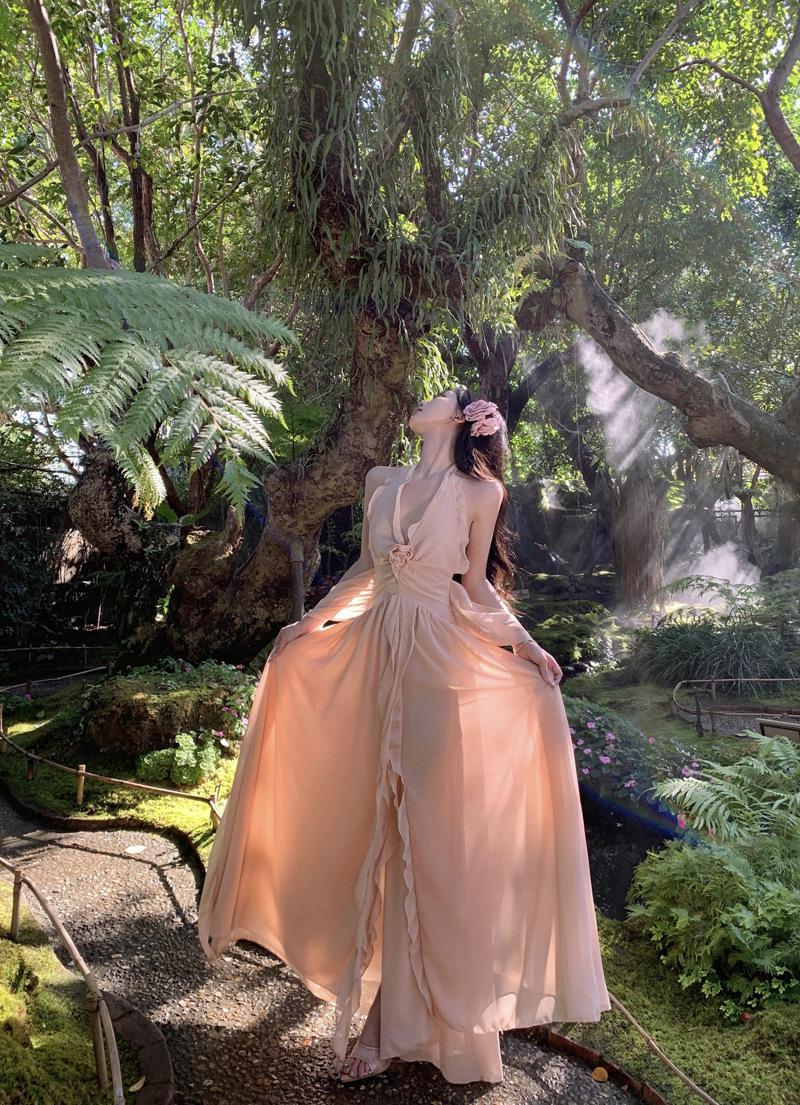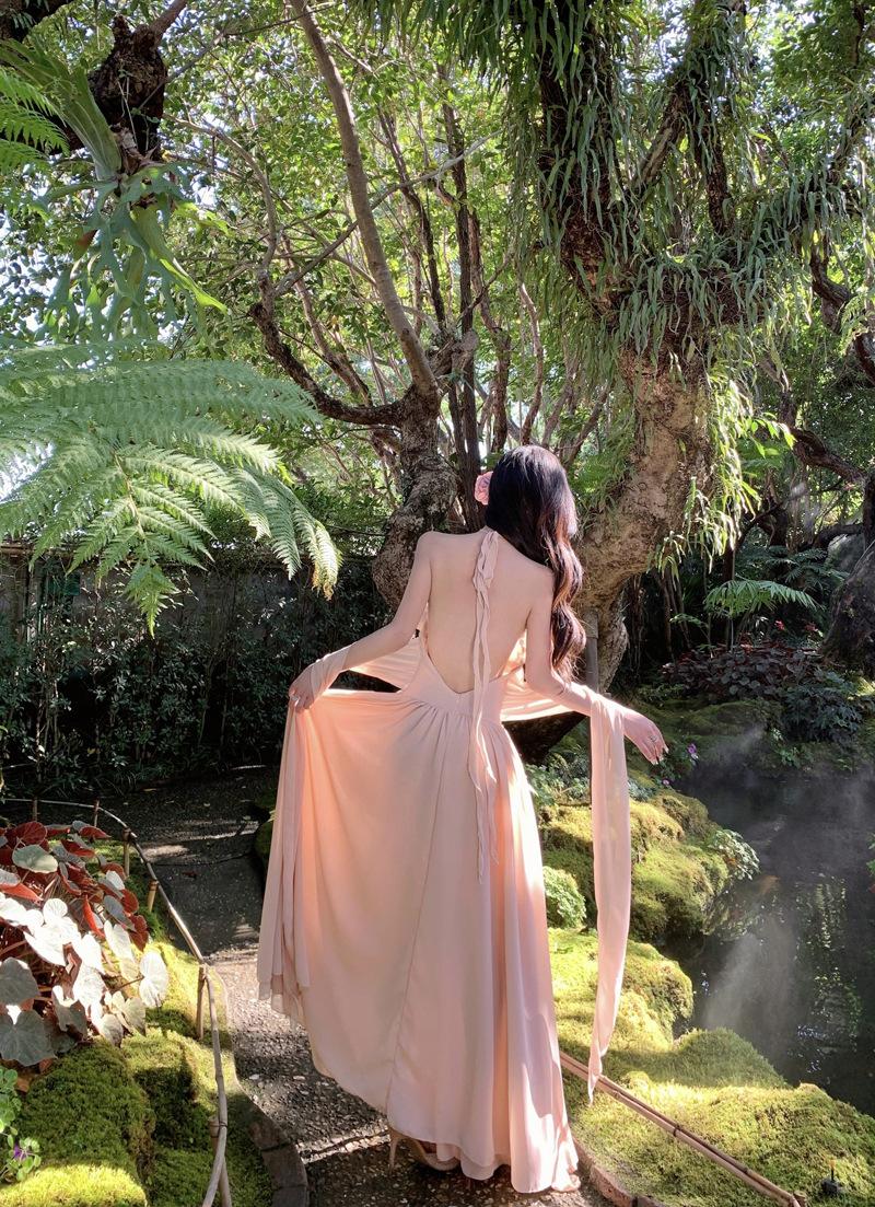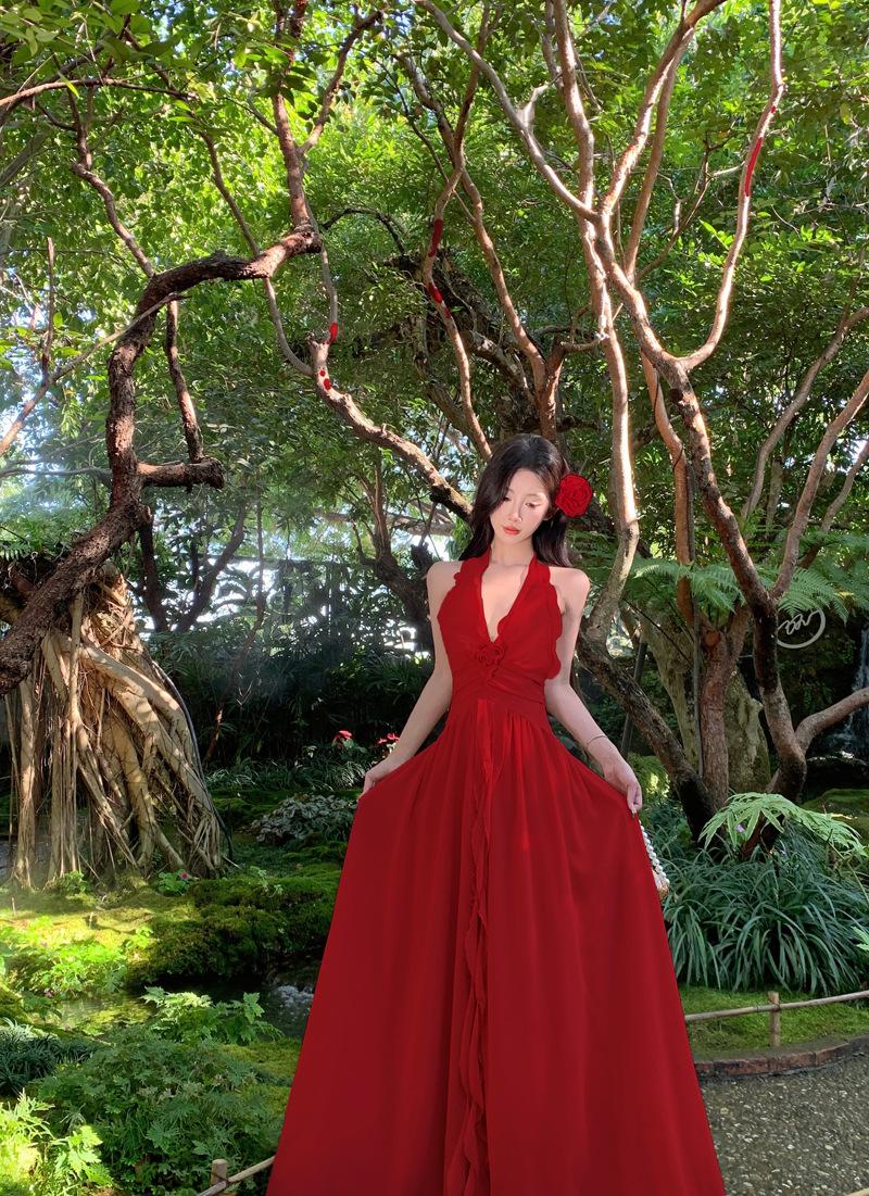 Hermoso vestido estilo francés con escote en V y tirantes tipo halter para mujer, vestido largo playero de verano con espalda descubierta y súper hada sexy para vacaciones en la playa.