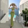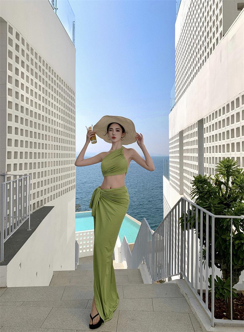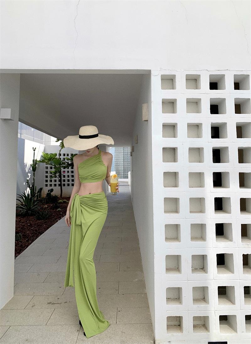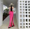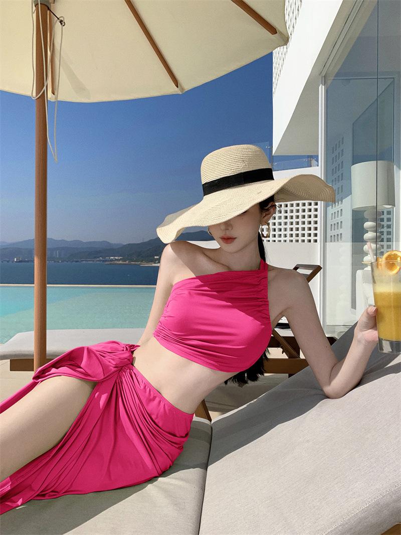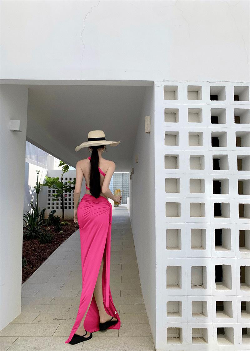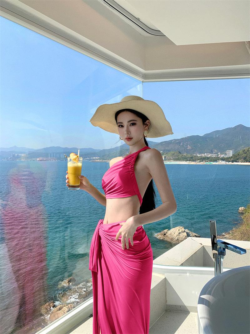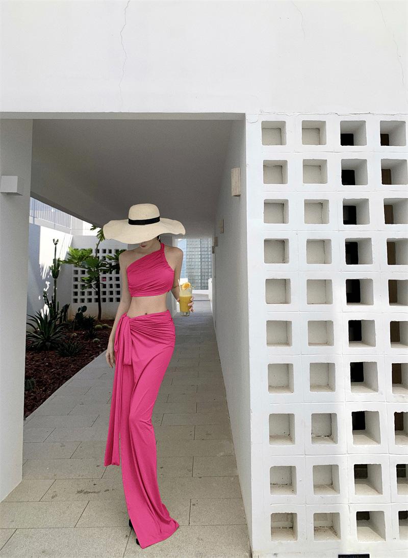 Hermoso traje de verano para vacaciones en la playa, conjunto de dos piezas con top de tubo con hombros inclinados, falda dividida y chaleco pequeño en rojo y rosa