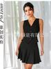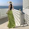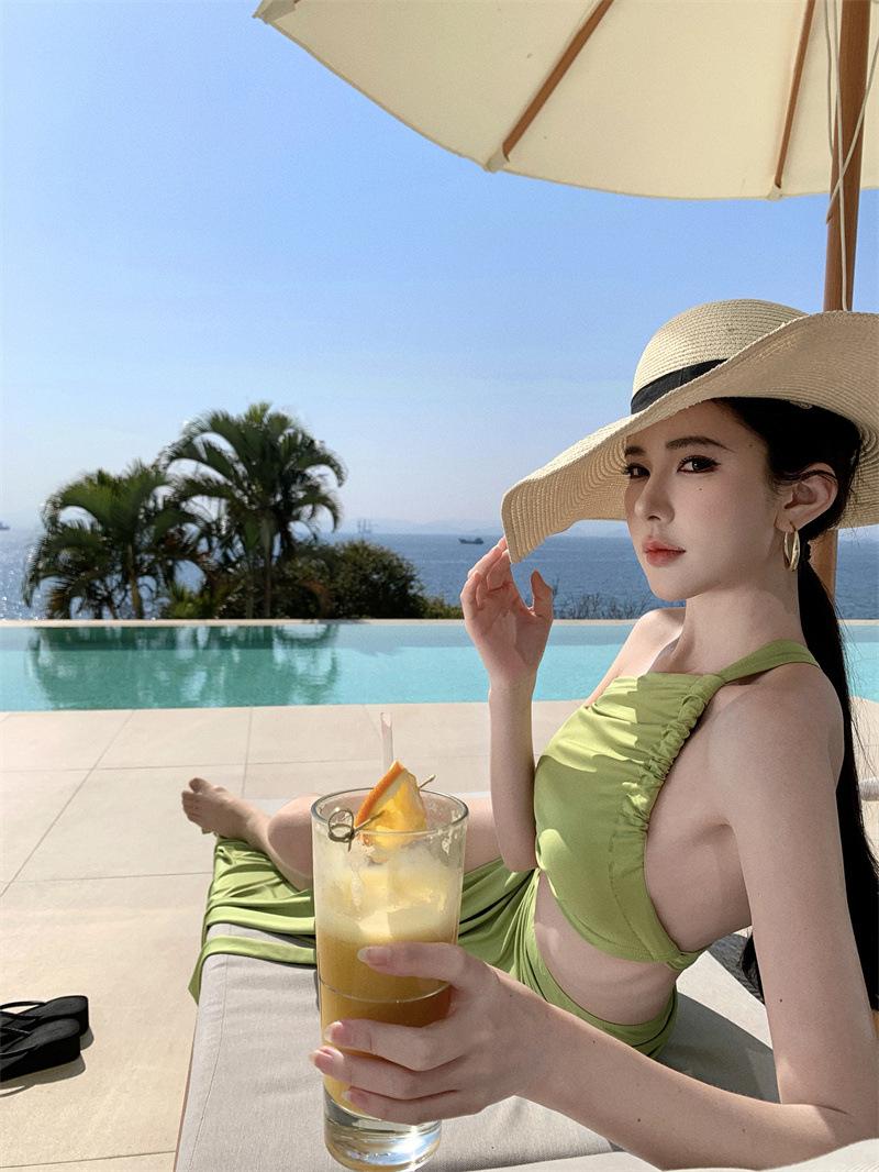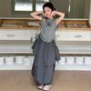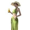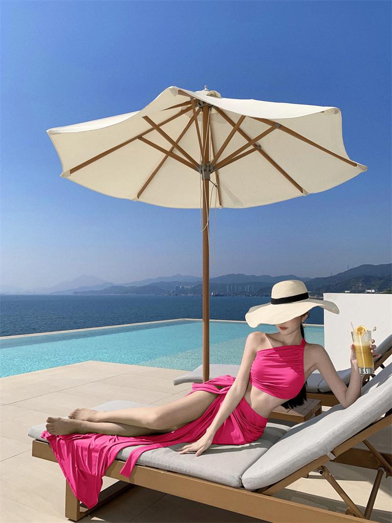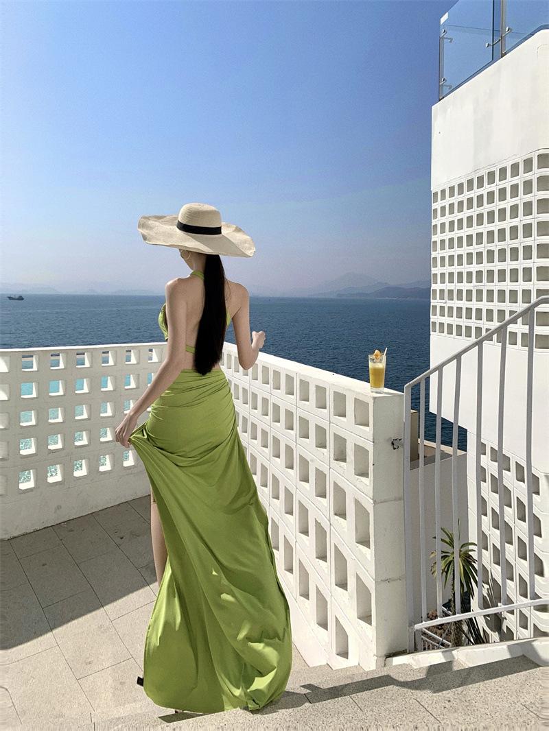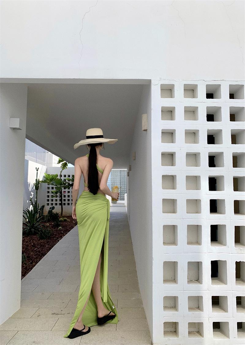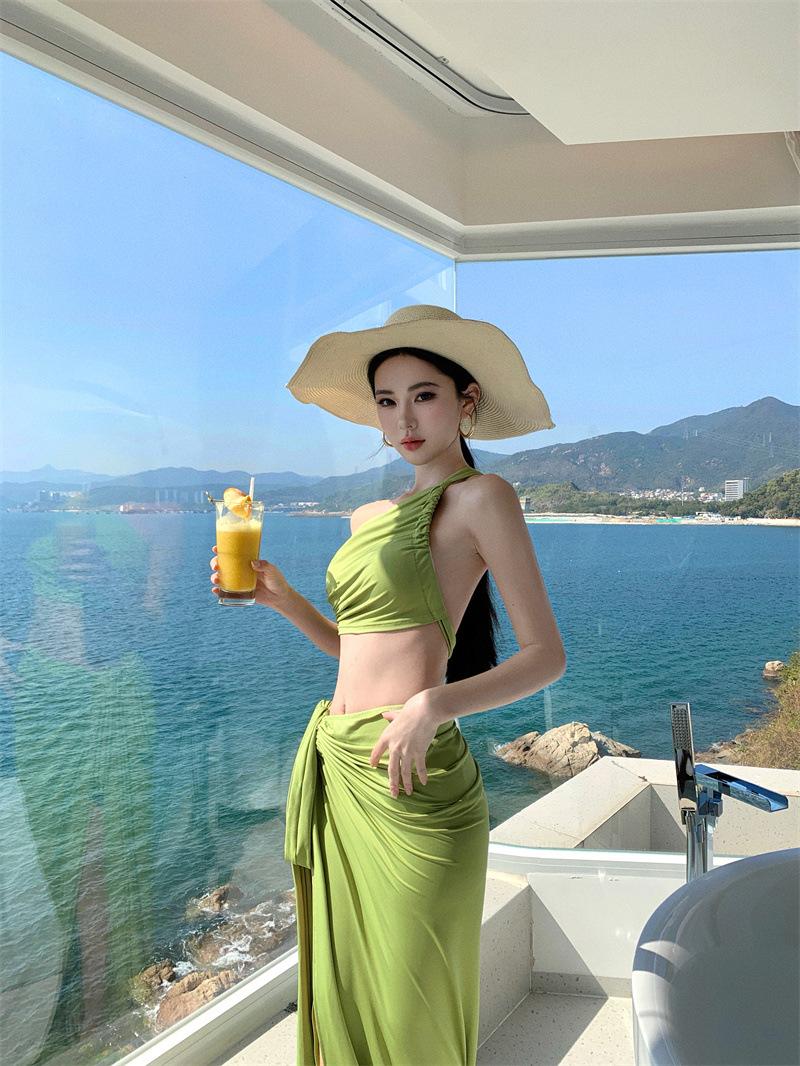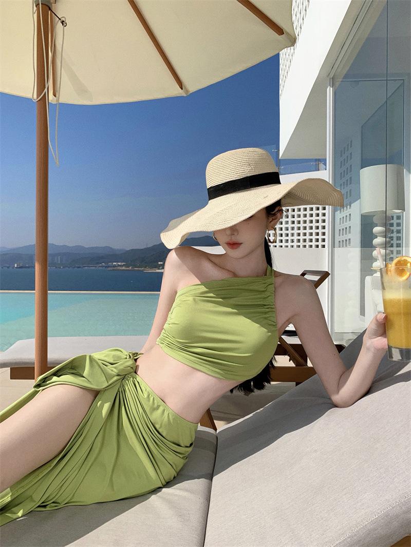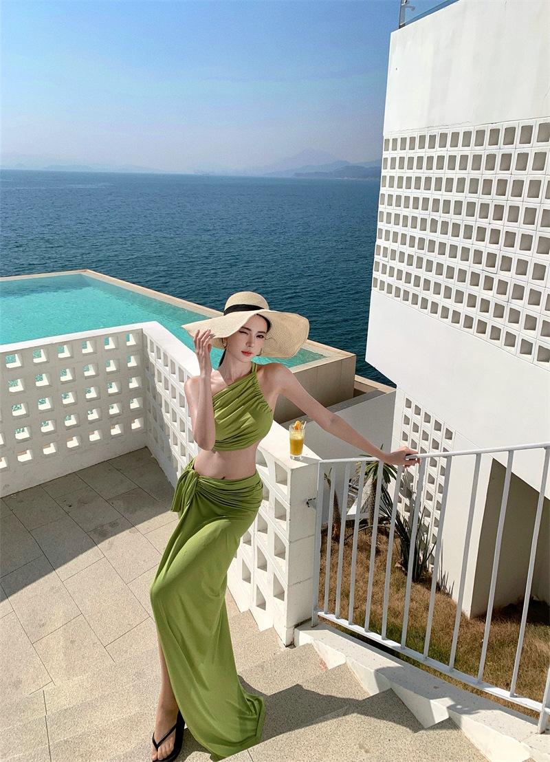 Hermoso traje de verano para vacaciones en la playa, conjunto de dos piezas con top de tubo con hombros inclinados, falda dividida y chaleco pequeño en rojo y rosa