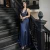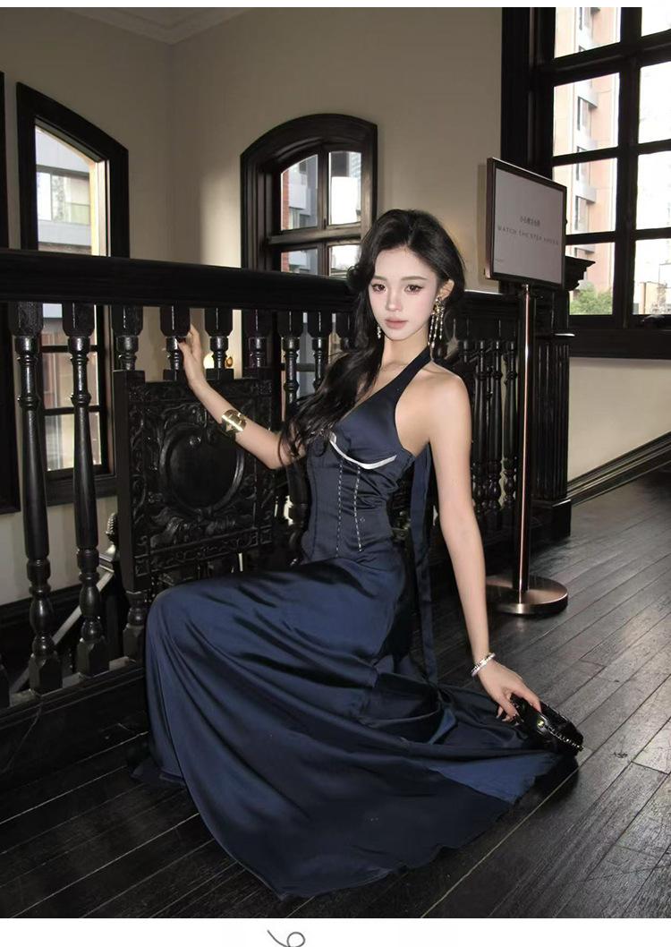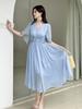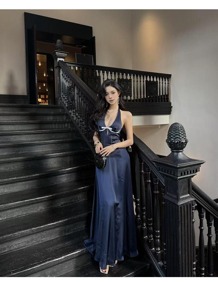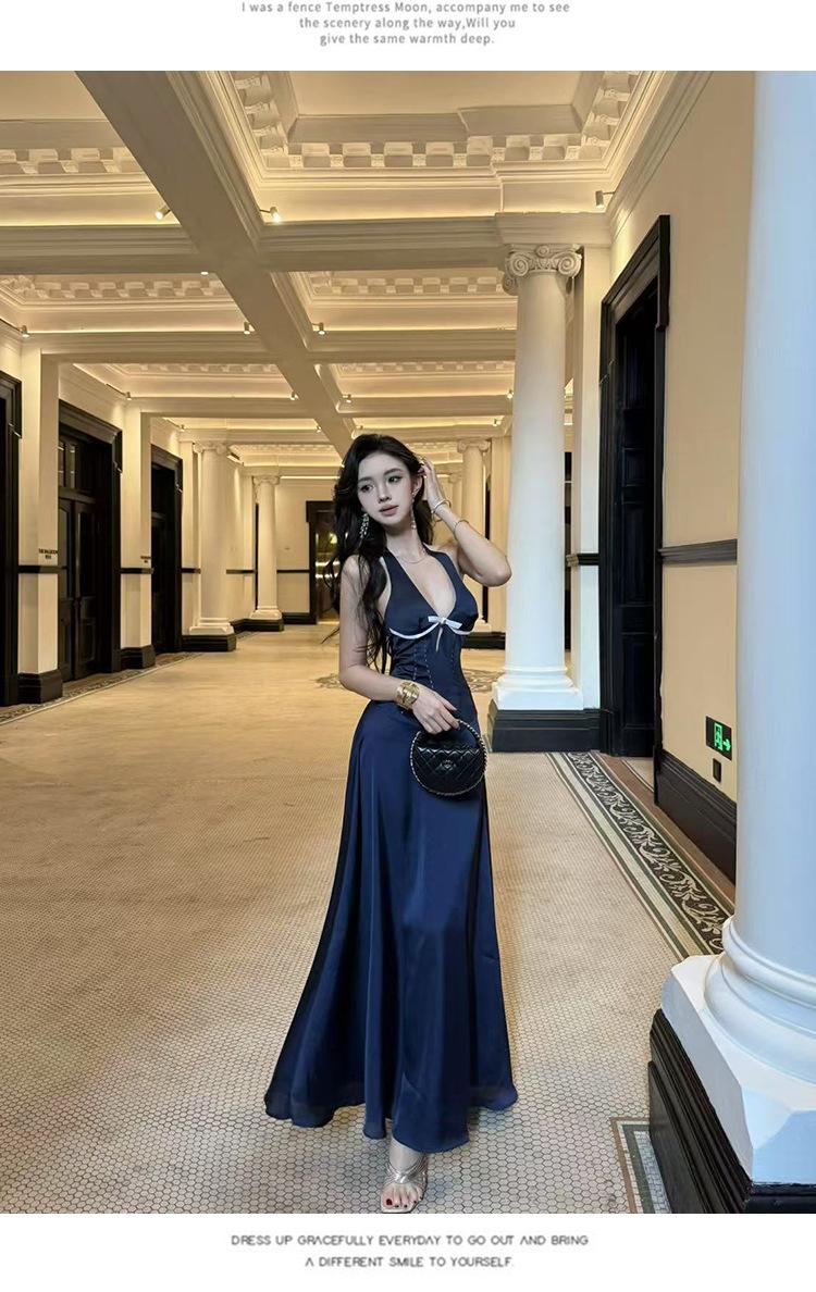 Vestido de fiesta de alta gama para mujer, con escote en V, lazo, diseño hueco, cintura caída y escote azul francés