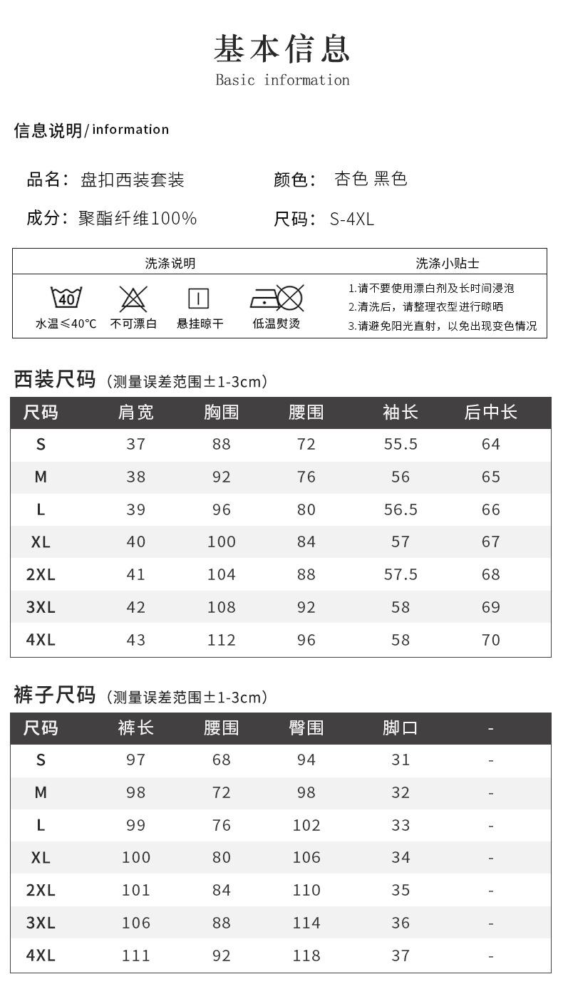 Black one piece suit, Apricot single suit, Black suit + pants, Apricot suit + pants