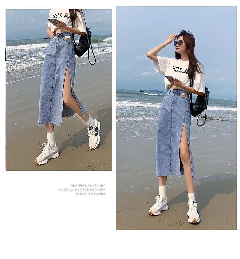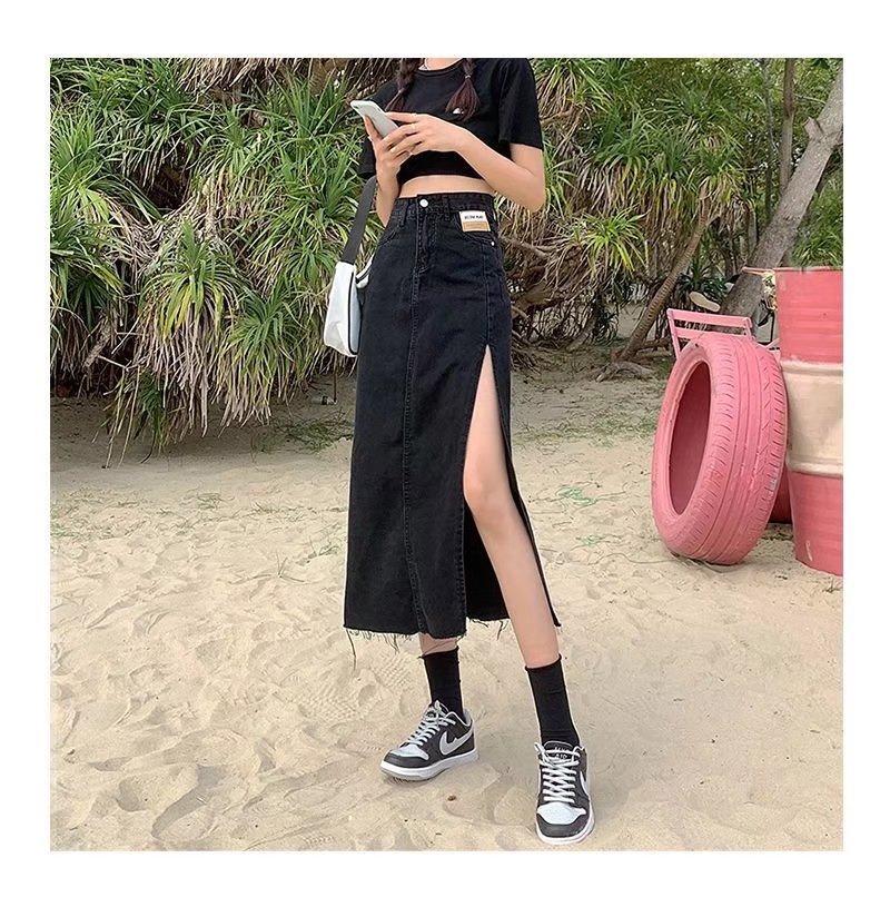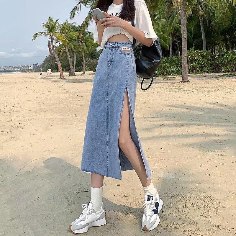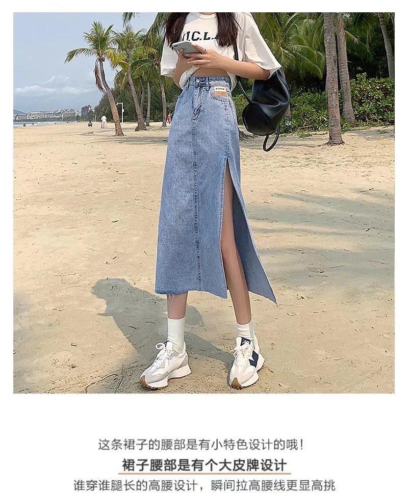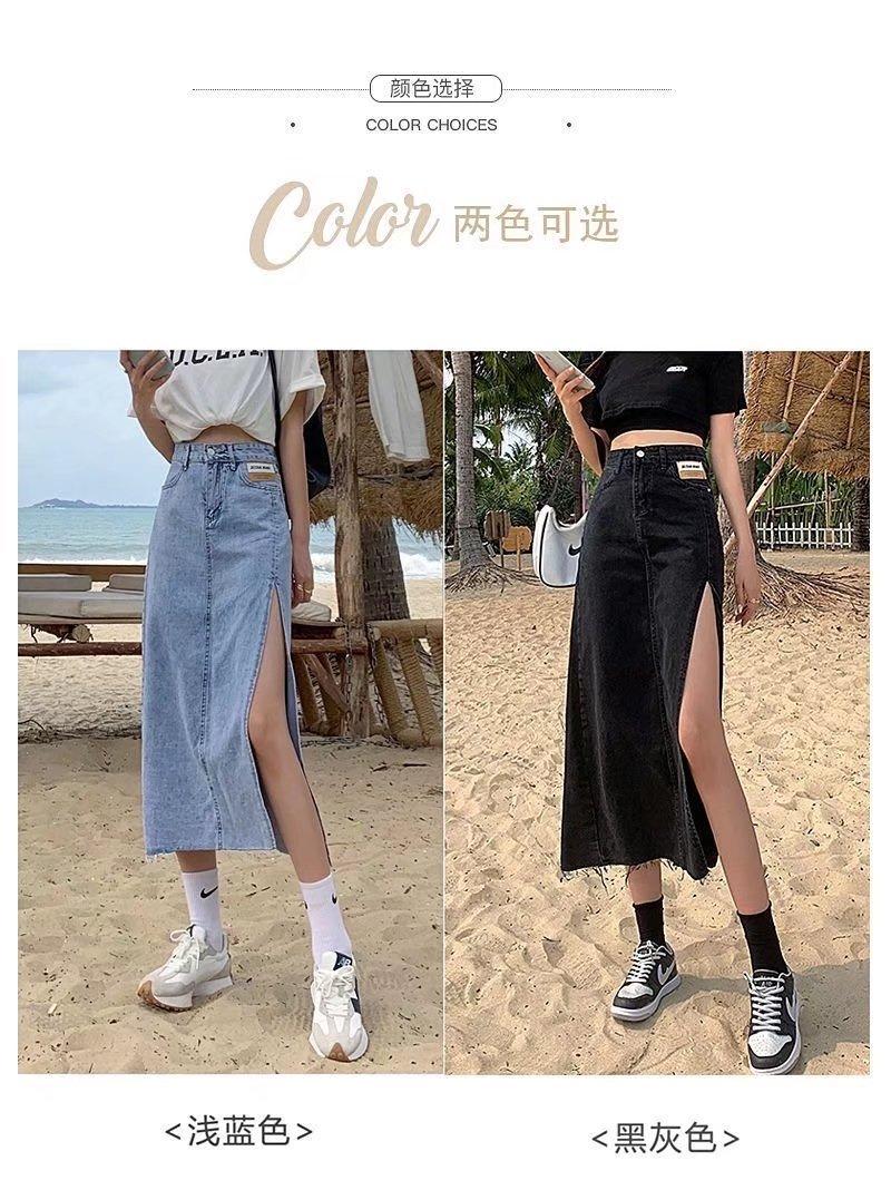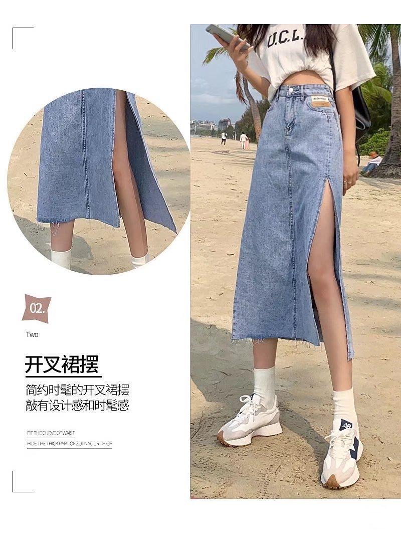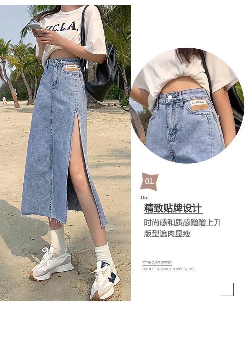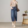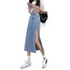 Falda de longitud media para mujer Otoño nueva pequeña cintura alta abertura lateral Denim cadera adelgazamiento falda de línea A ins moda