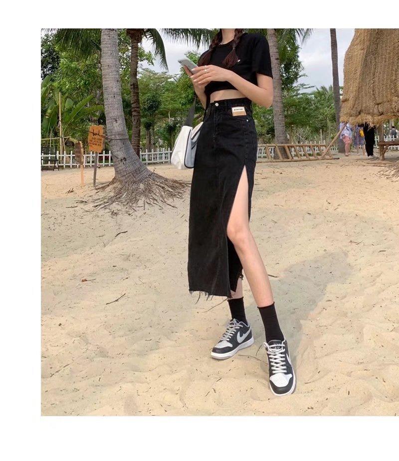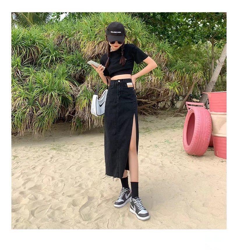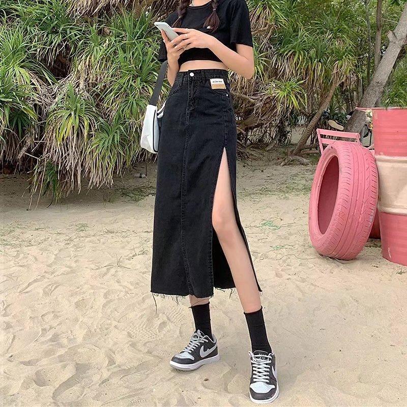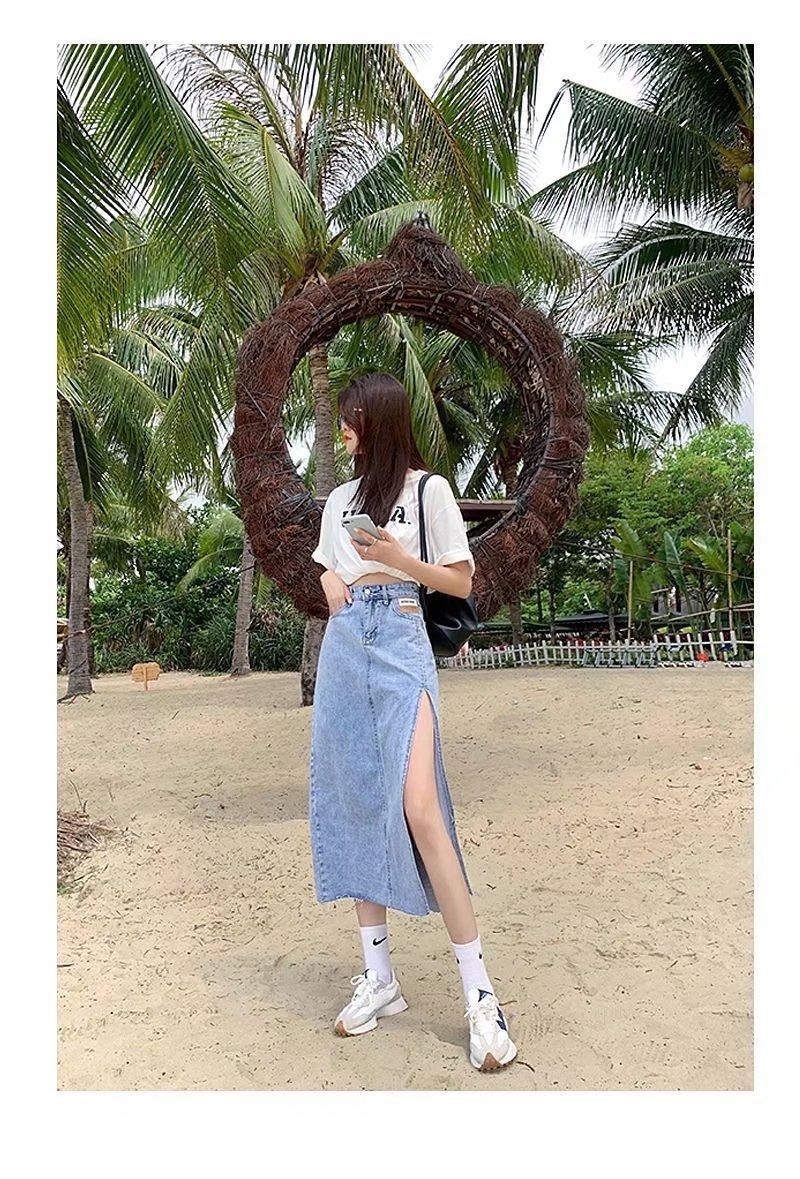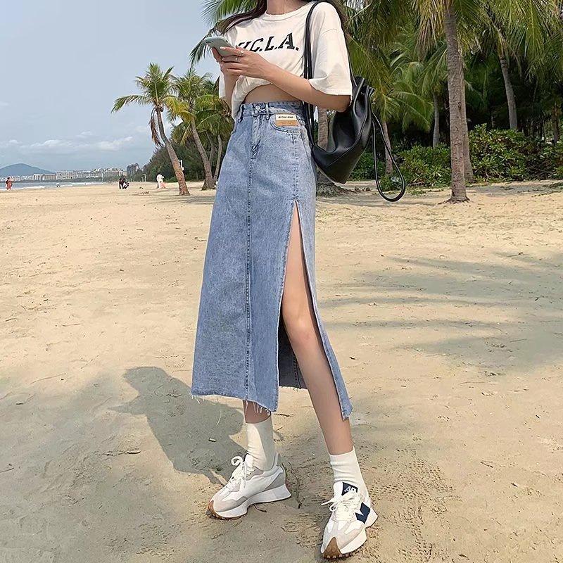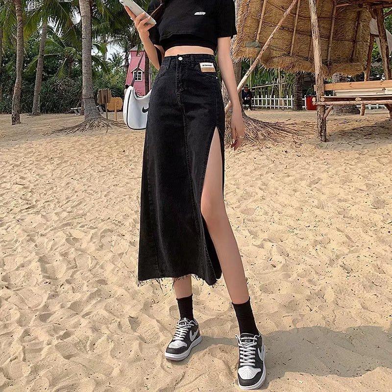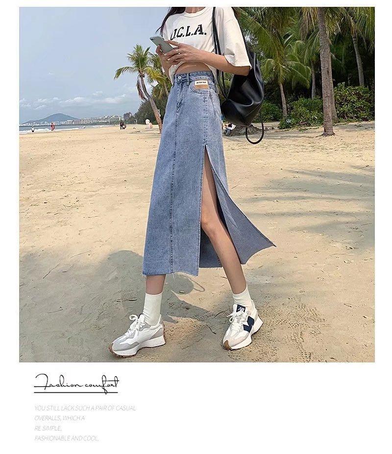 Falda de longitud media para mujer Otoño nueva pequeña cintura alta abertura lateral Denim cadera adelgazamiento falda de línea A ins moda