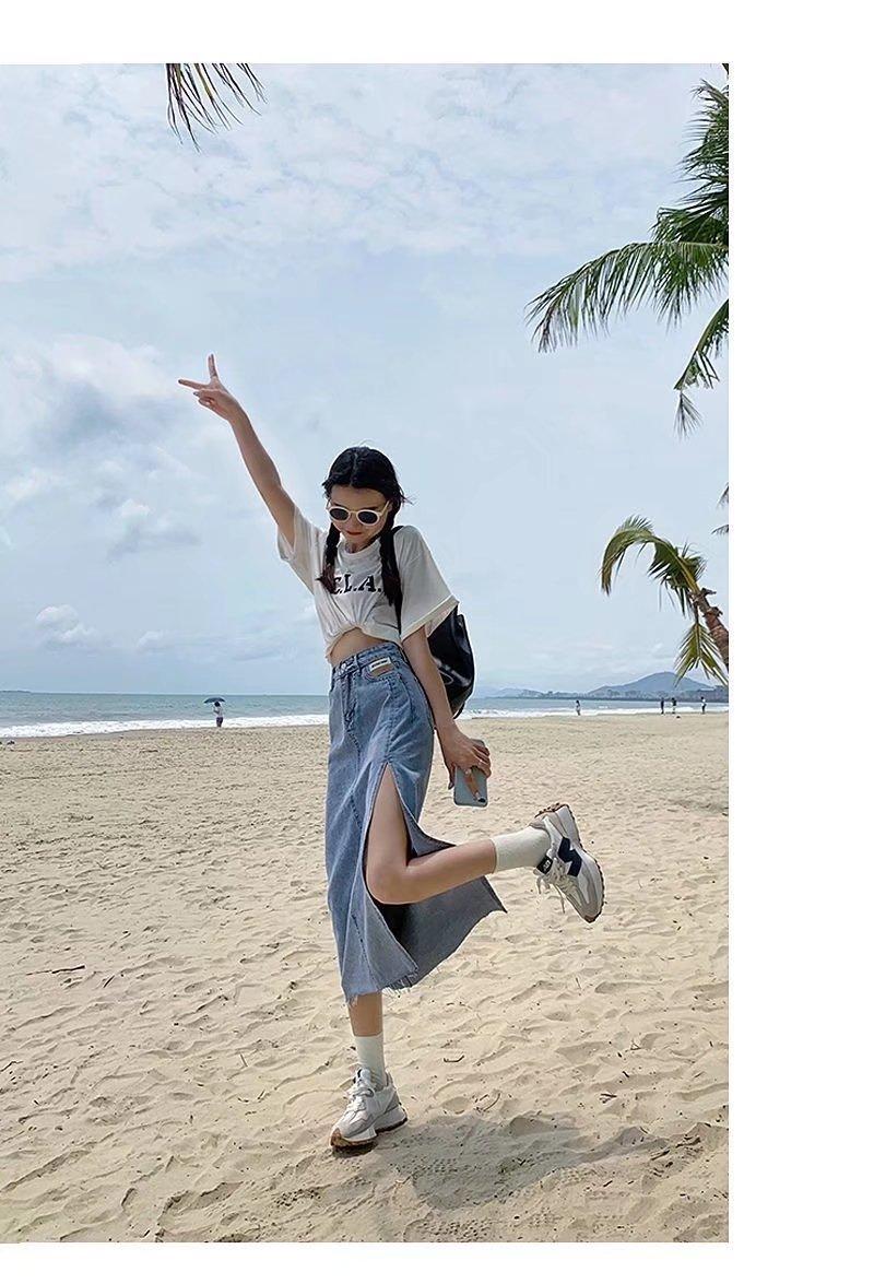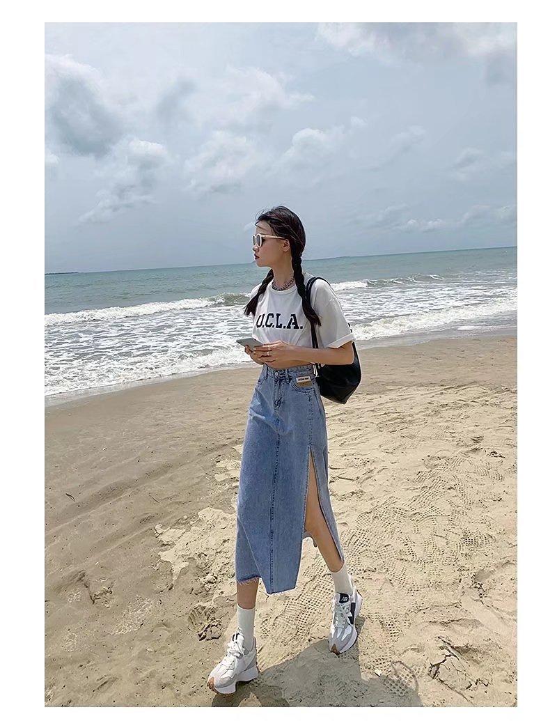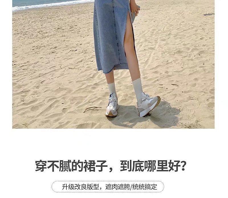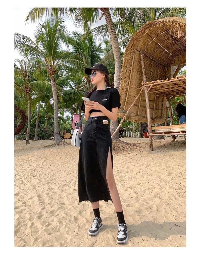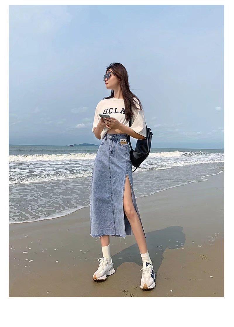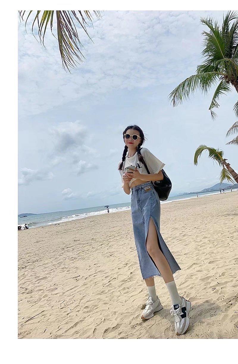 Falda de longitud media para mujer Otoño nueva pequeña cintura alta abertura lateral Denim cadera adelgazamiento falda de línea A ins moda