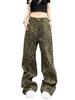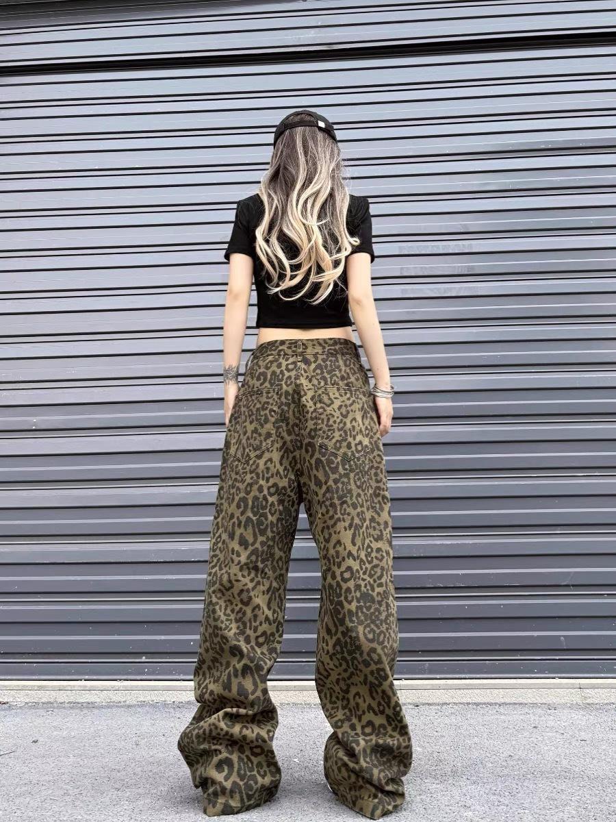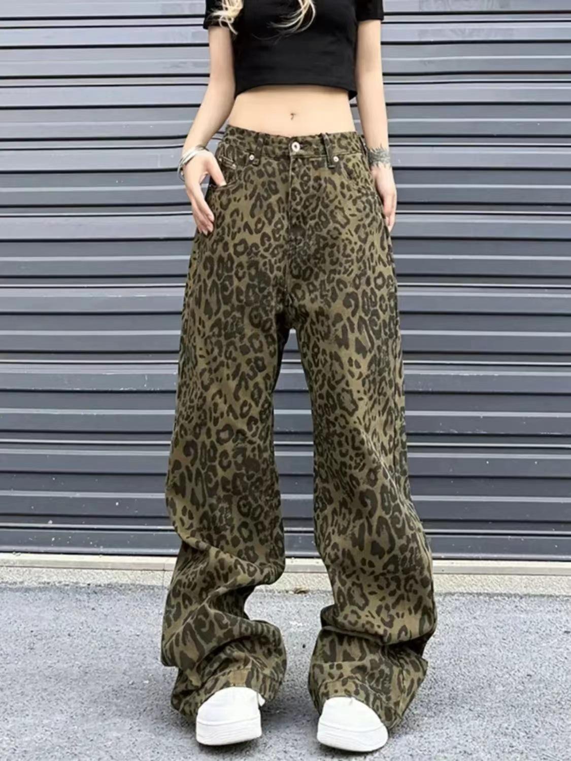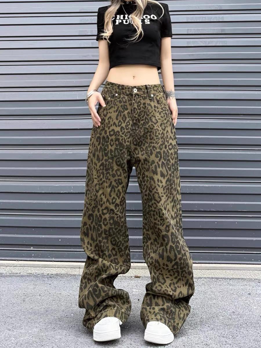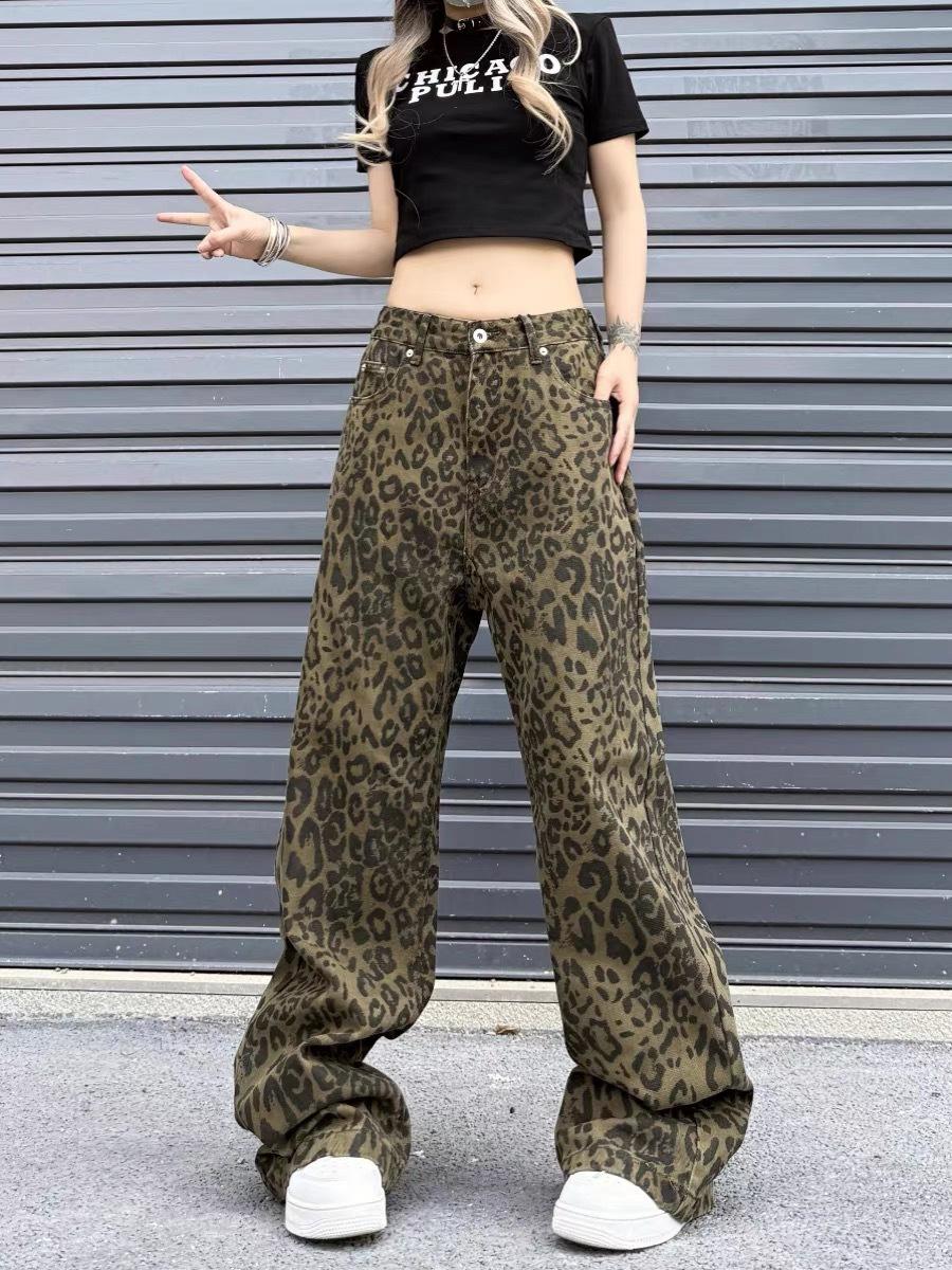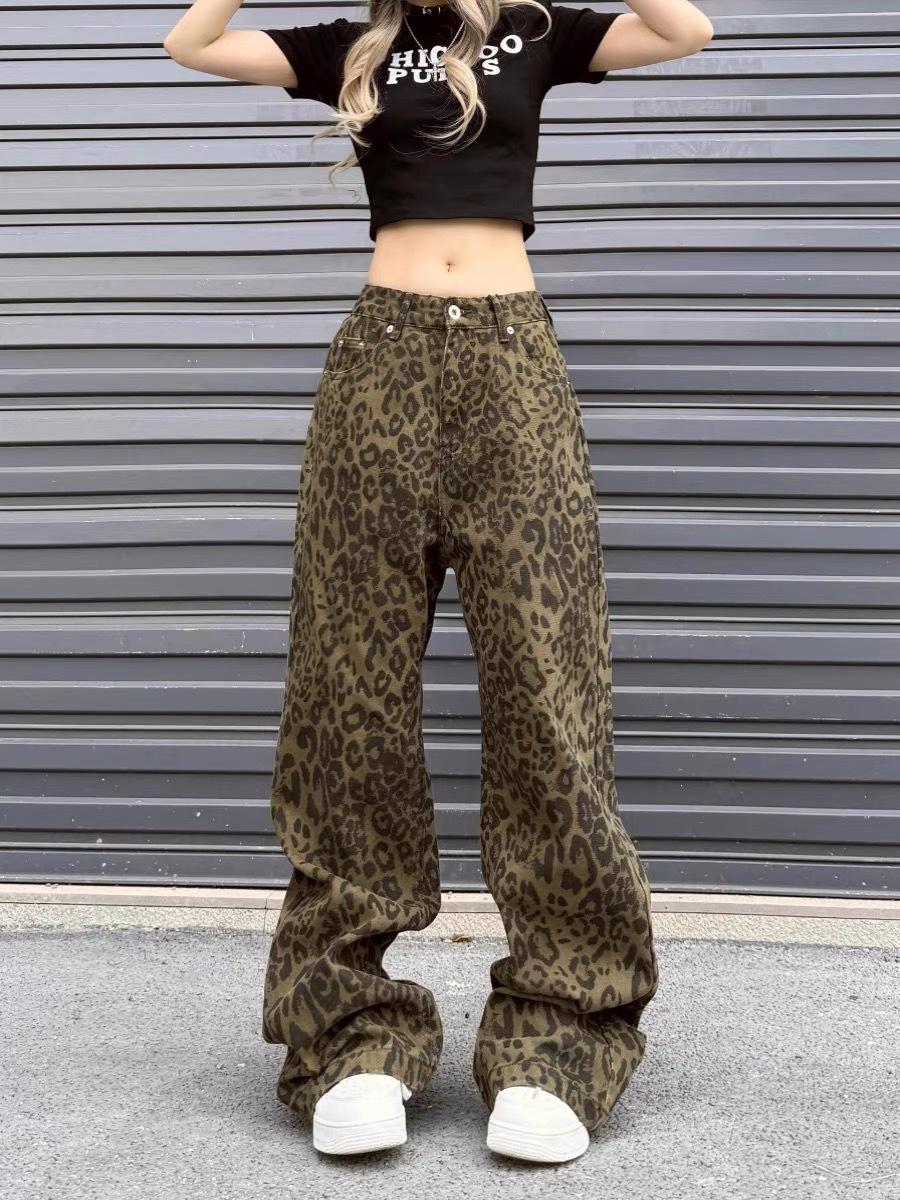Pantalones vaqueros de pierna ancha con estampado de leopardo retro americano de High Street para mujer, otoño e invierno 2025, nuevos pantalones casuales rectos y sueltos