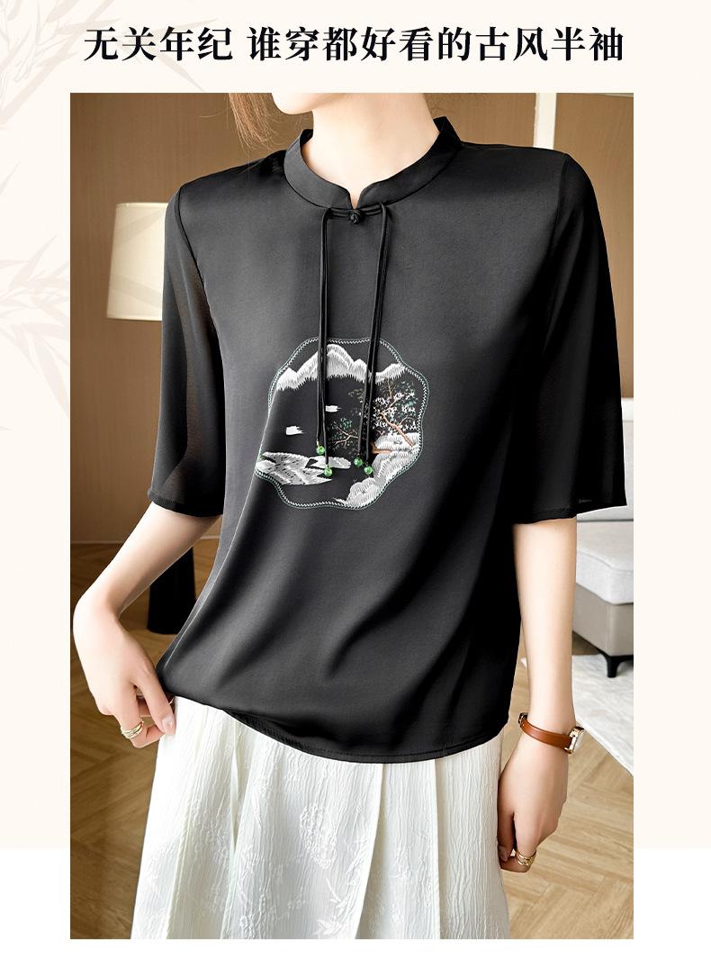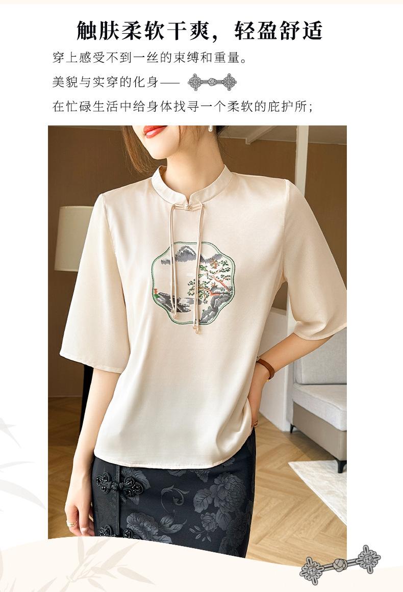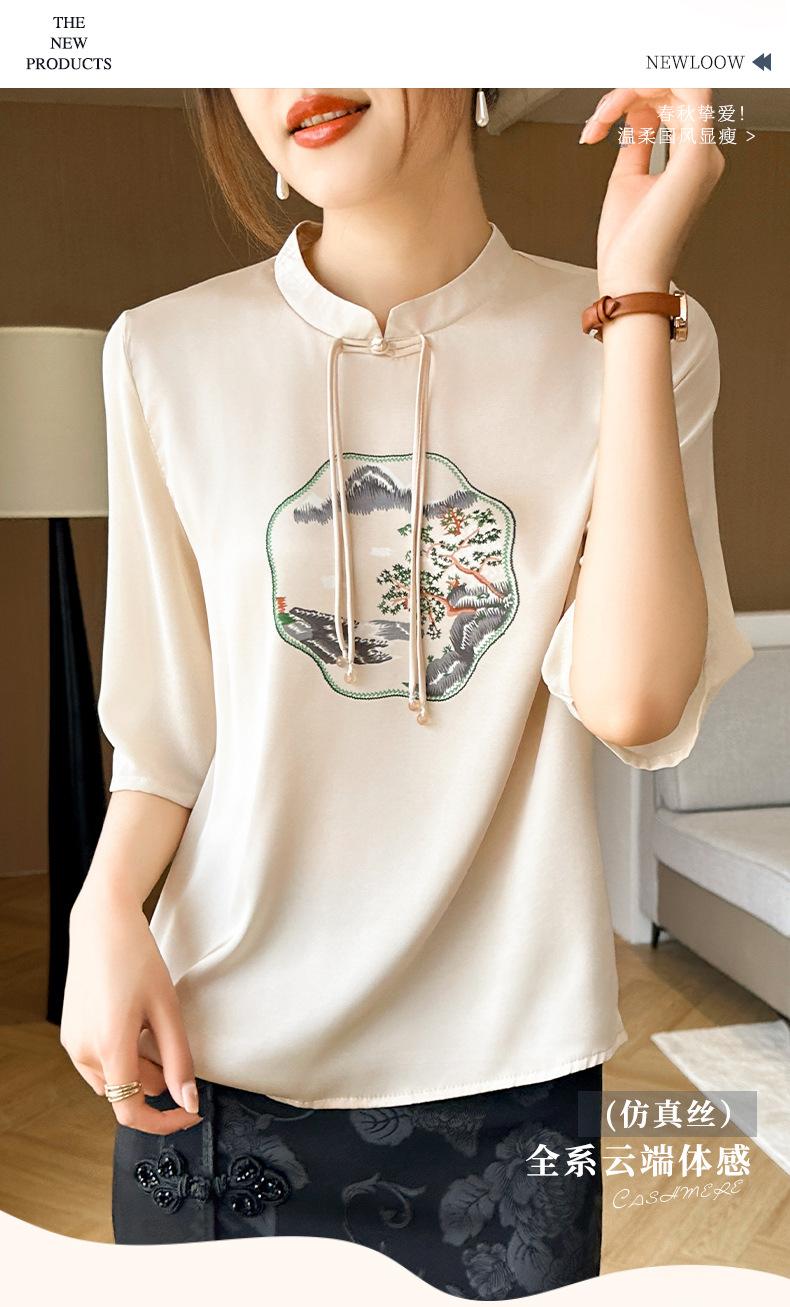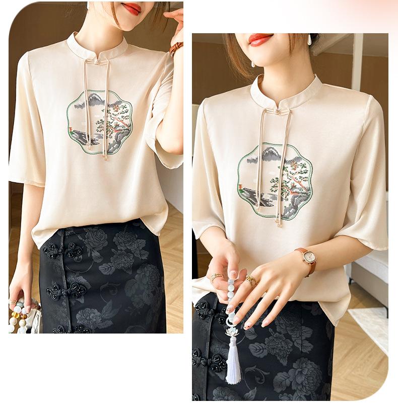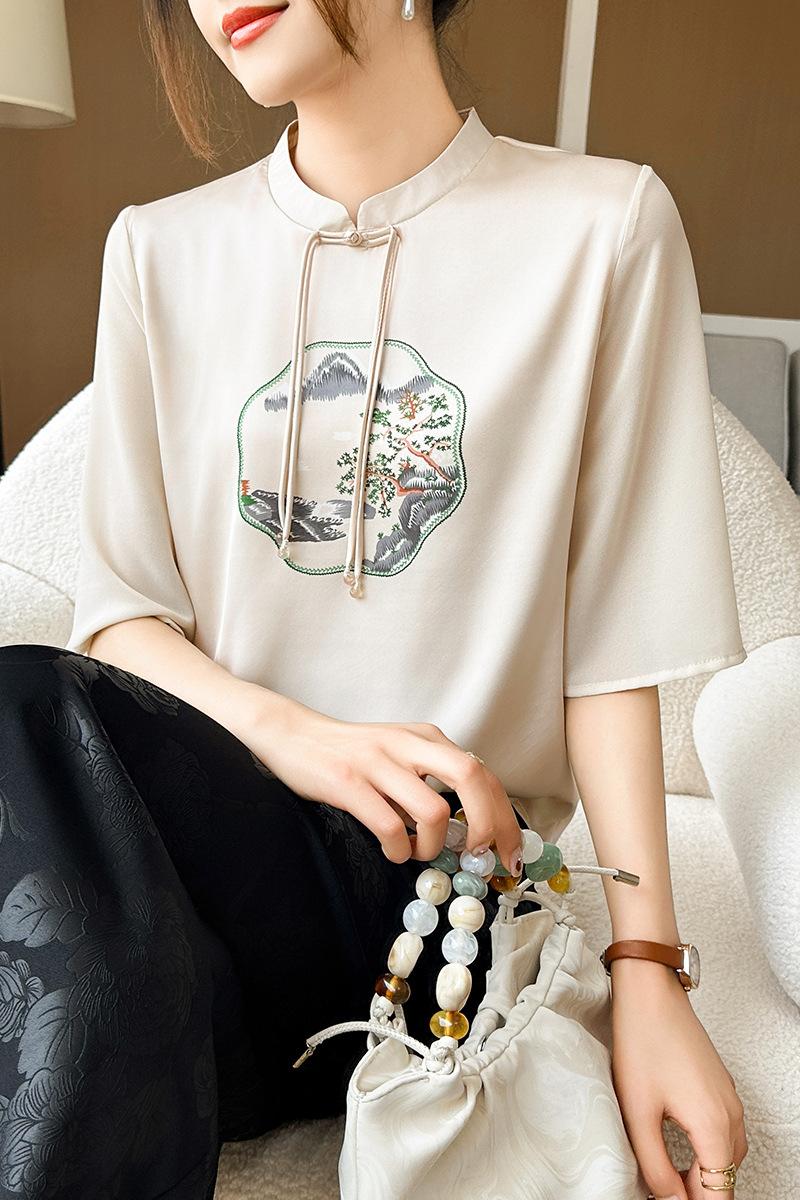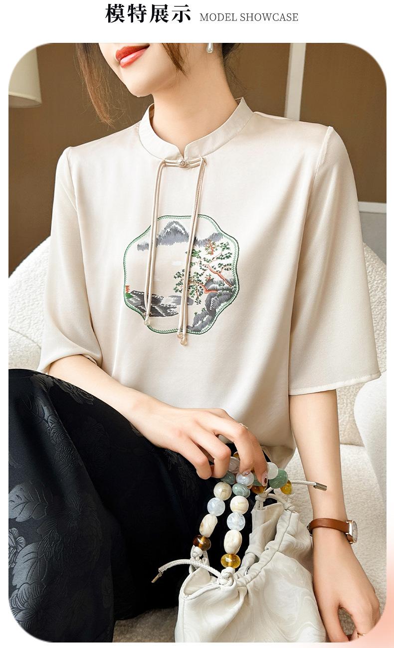 25. Camiseta de manga corta nueva de primavera y verano para mujer, de satén de imitación de seda, estilo nacional, de manga corta, holgada y adelgazante, de moda para mujer.