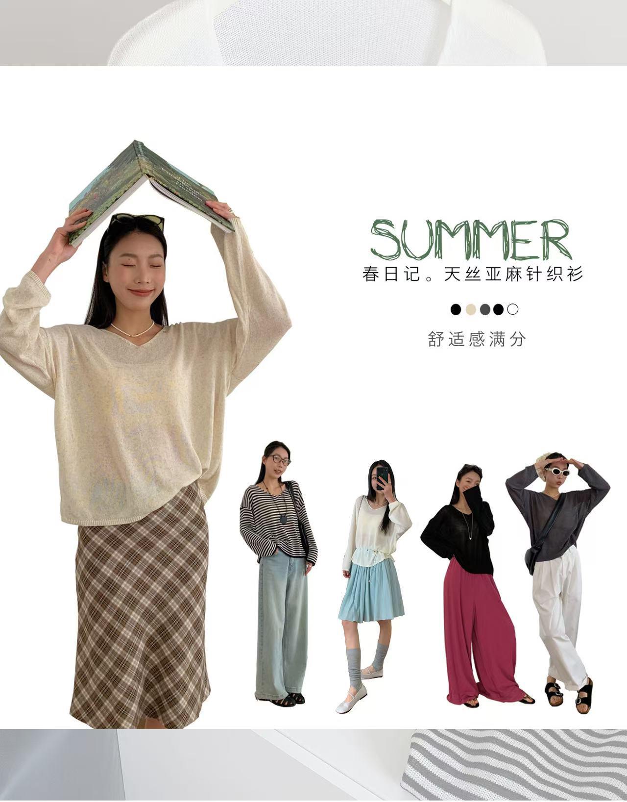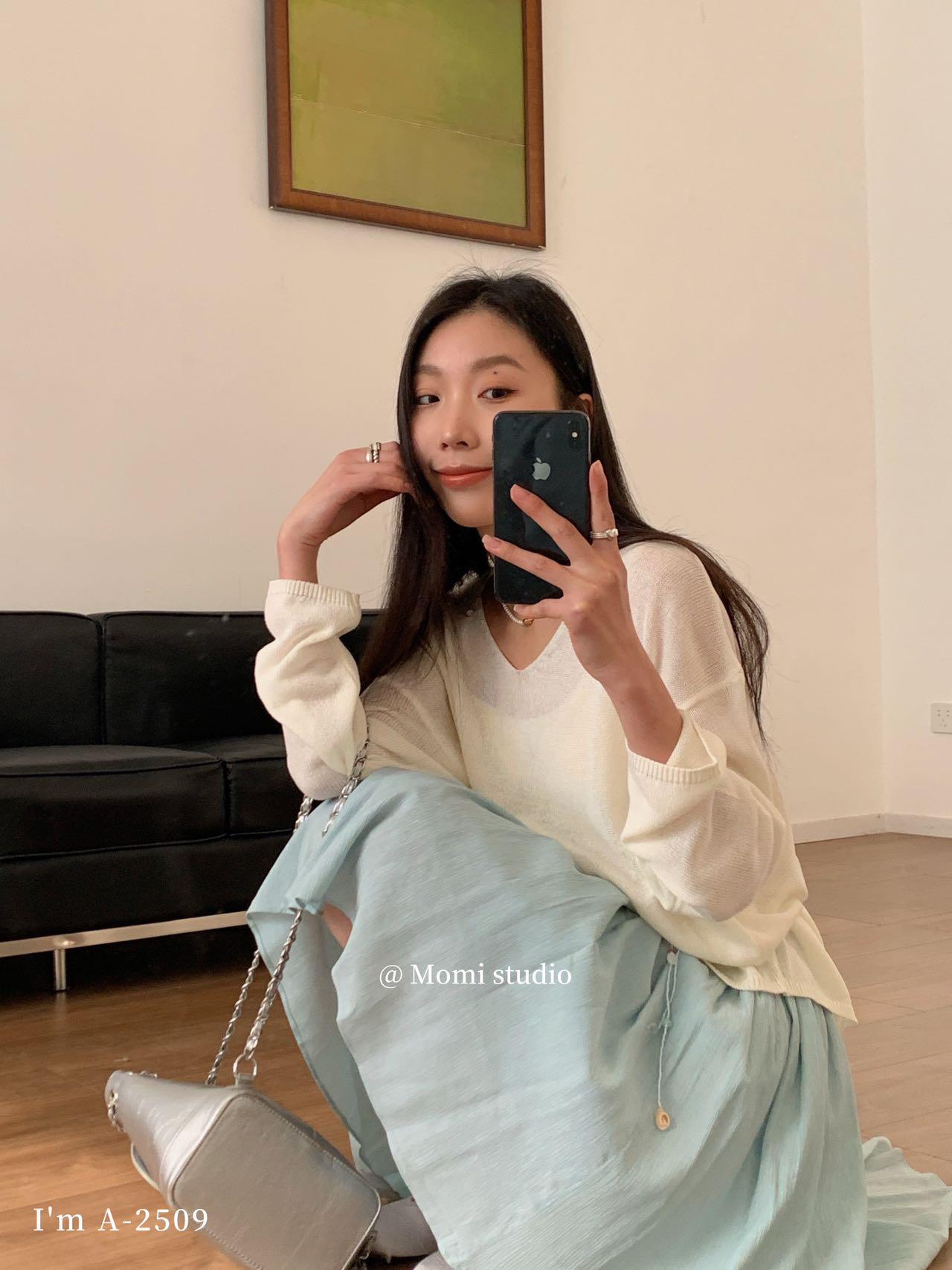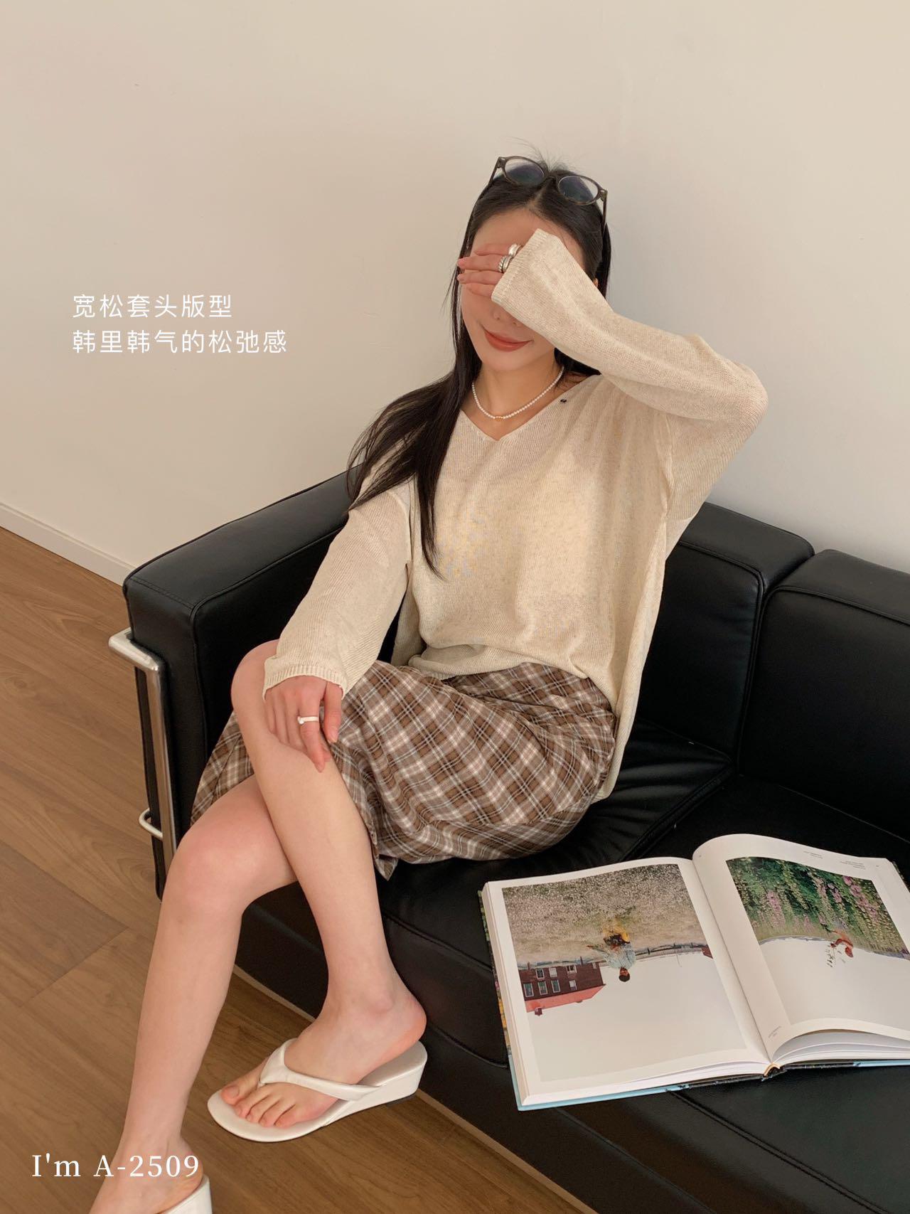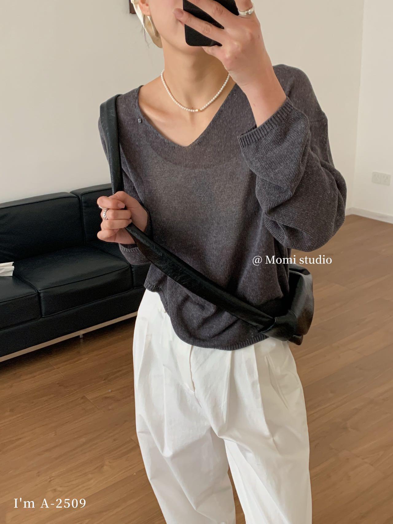 2025 Nuevo Tejido de Punto de Color Puro Coreano con Cuello en V y Manga Larga para Mujer, Estilo Lazy, Suéter Holgado que Adelgaza con Camiseta Interior