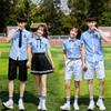 Women's Blue T + white striped skirt + badge, Men's Blue T + white shorts + badge, Women's Blue T + black stri...