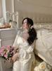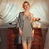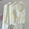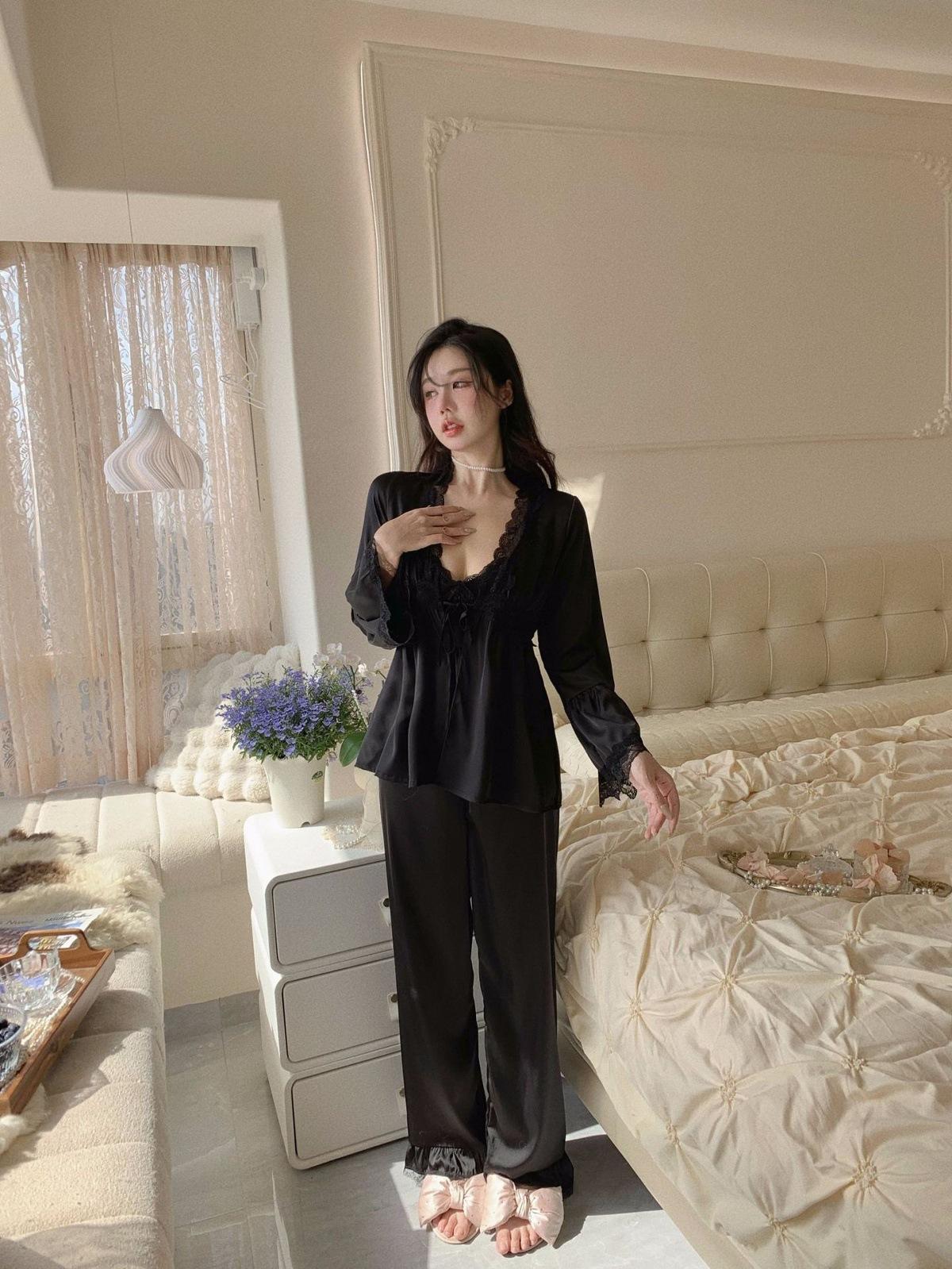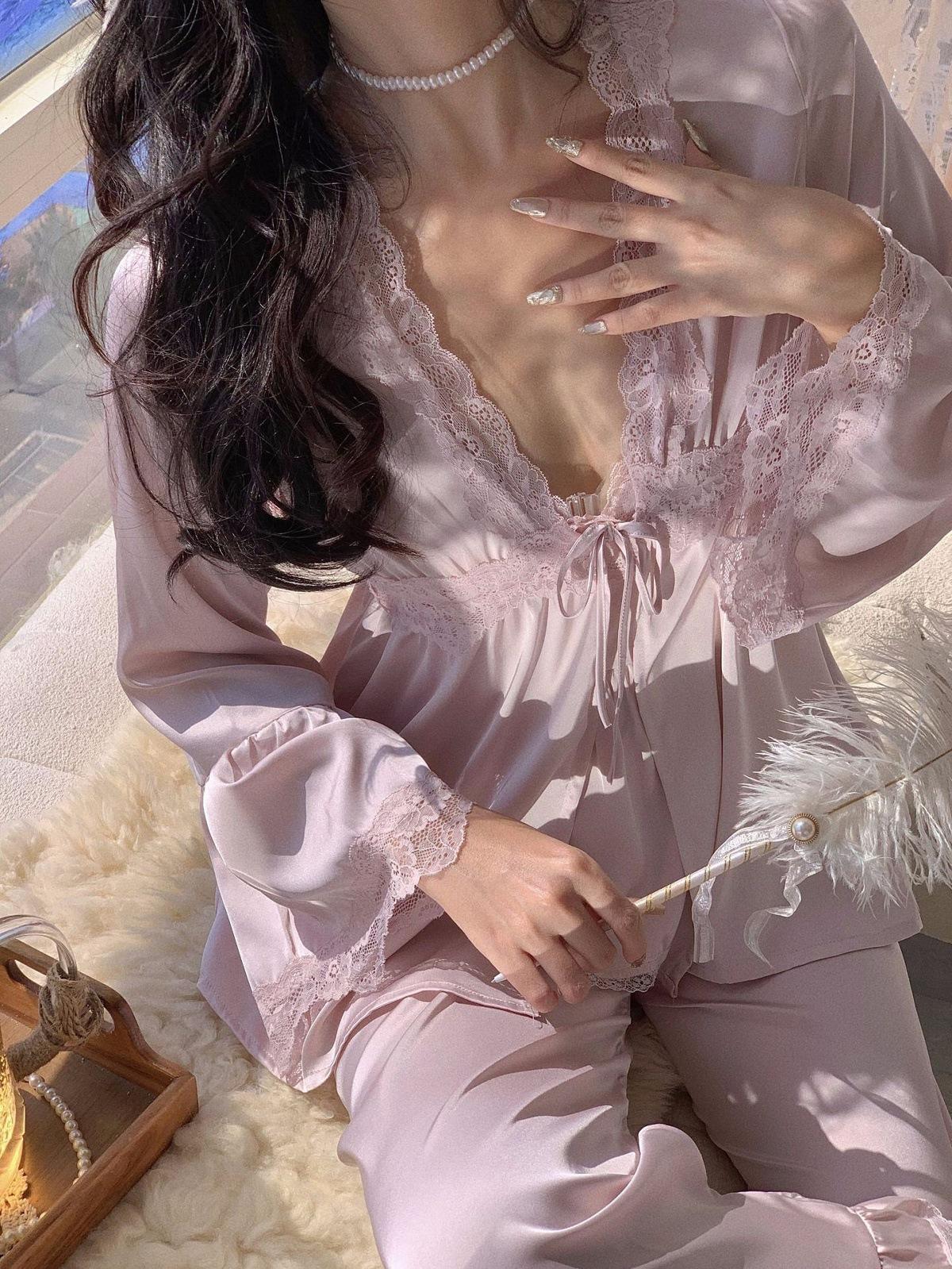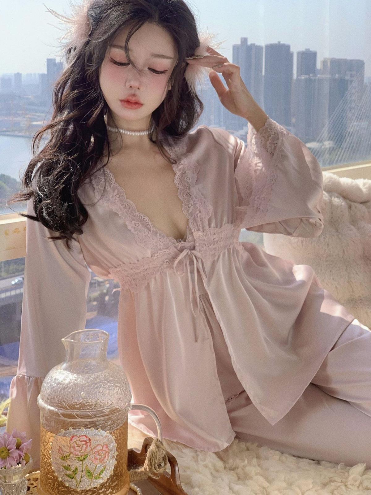 Pijama de Tres Piezas de Encaje Sexy Francés de Otoño Nuevo de Zhao Lusi, Pantalones de Tirantes, Ropa para el Hogar de Seda de Hielo Y