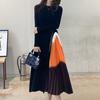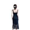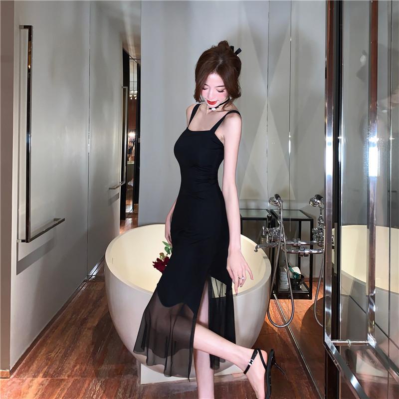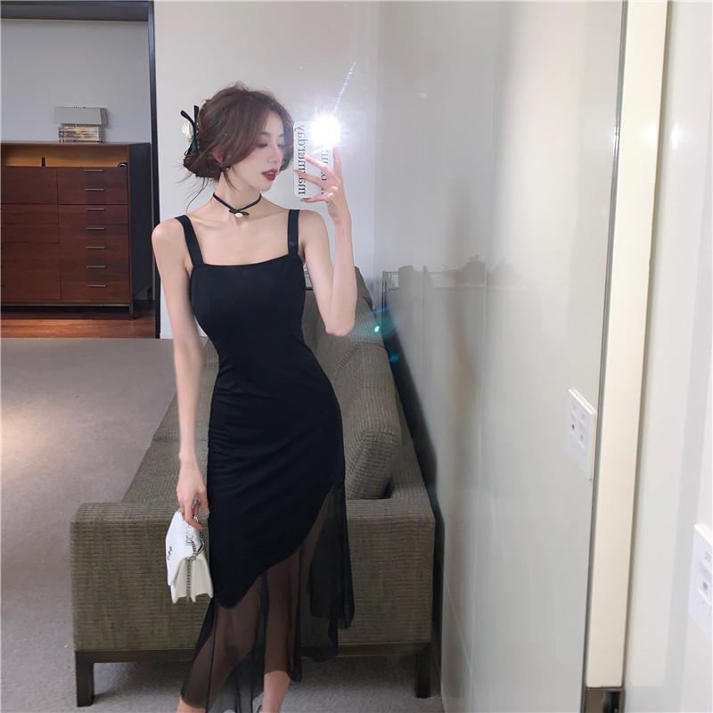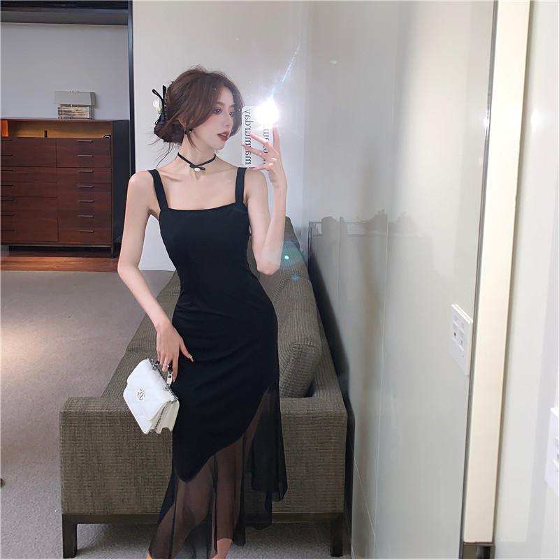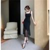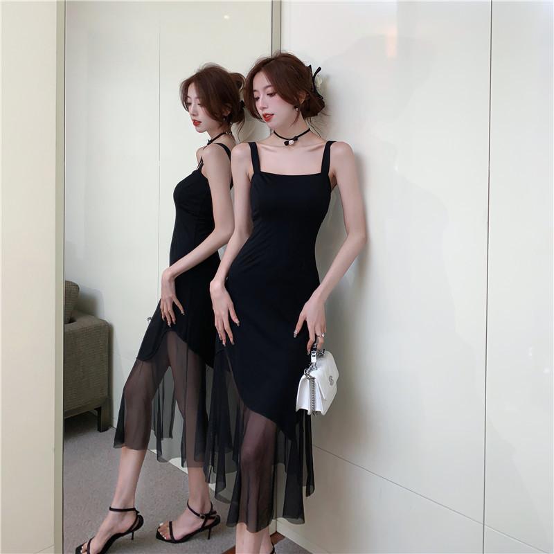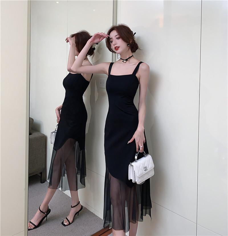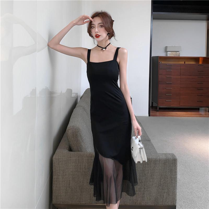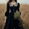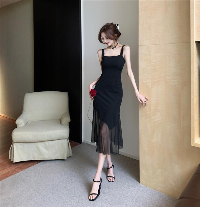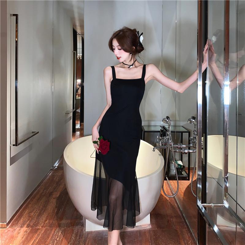 Vestido negro de estilo socialité francés de 2025 con falda estilo Hepburn, costuras, cintura ancha, cuello alto y espalda descubierta.