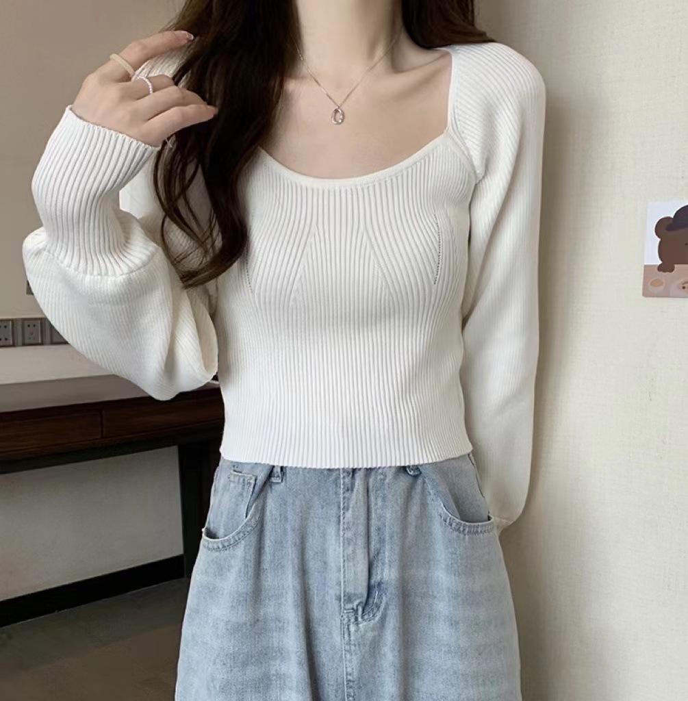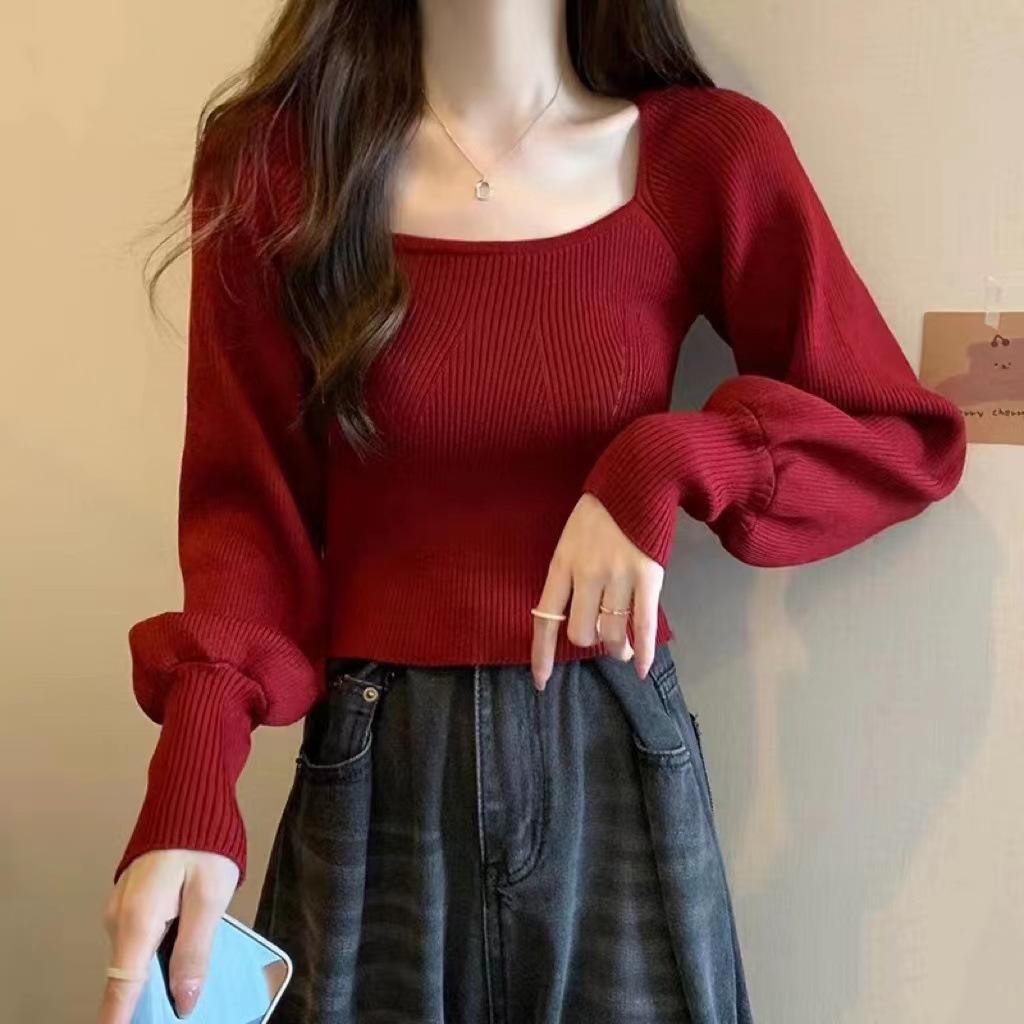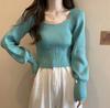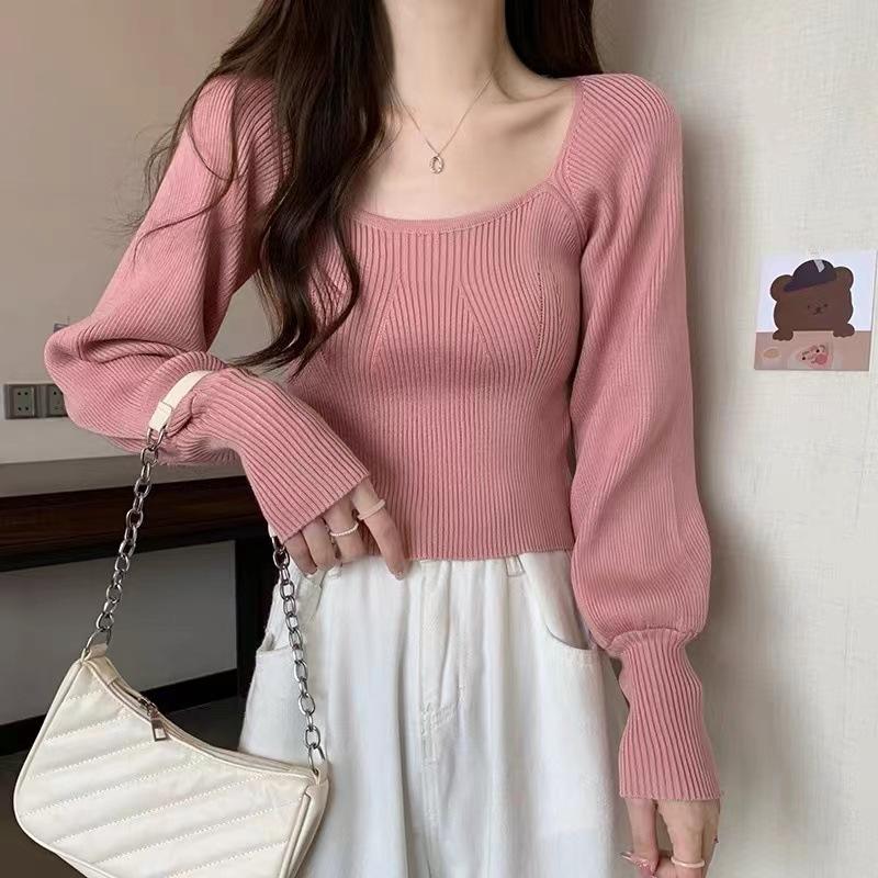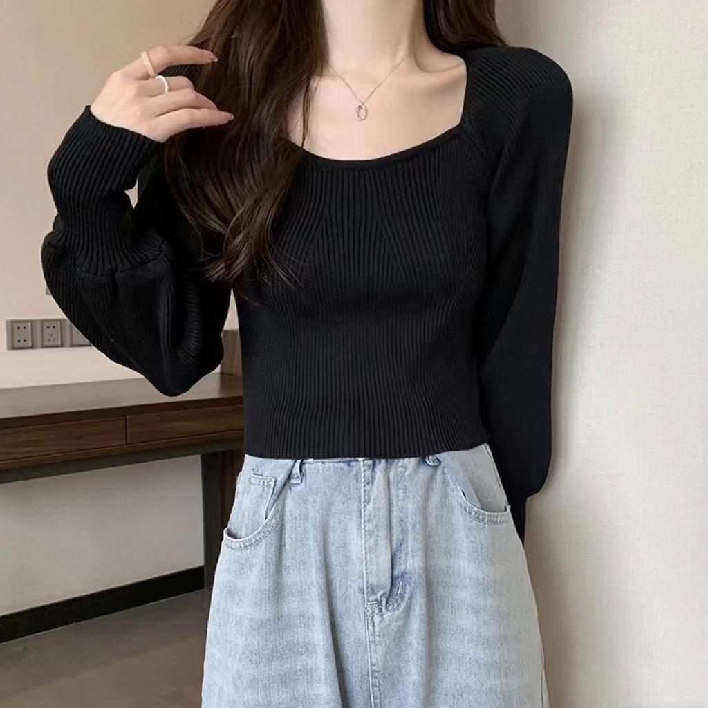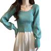 Diseño suéter de punto de cuello cuadrado para mujer otoño pequeño corto ajustado chic suéter de manga larga