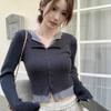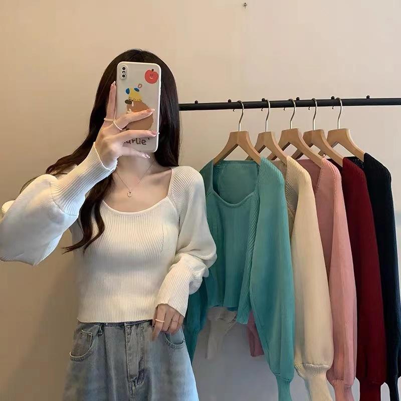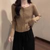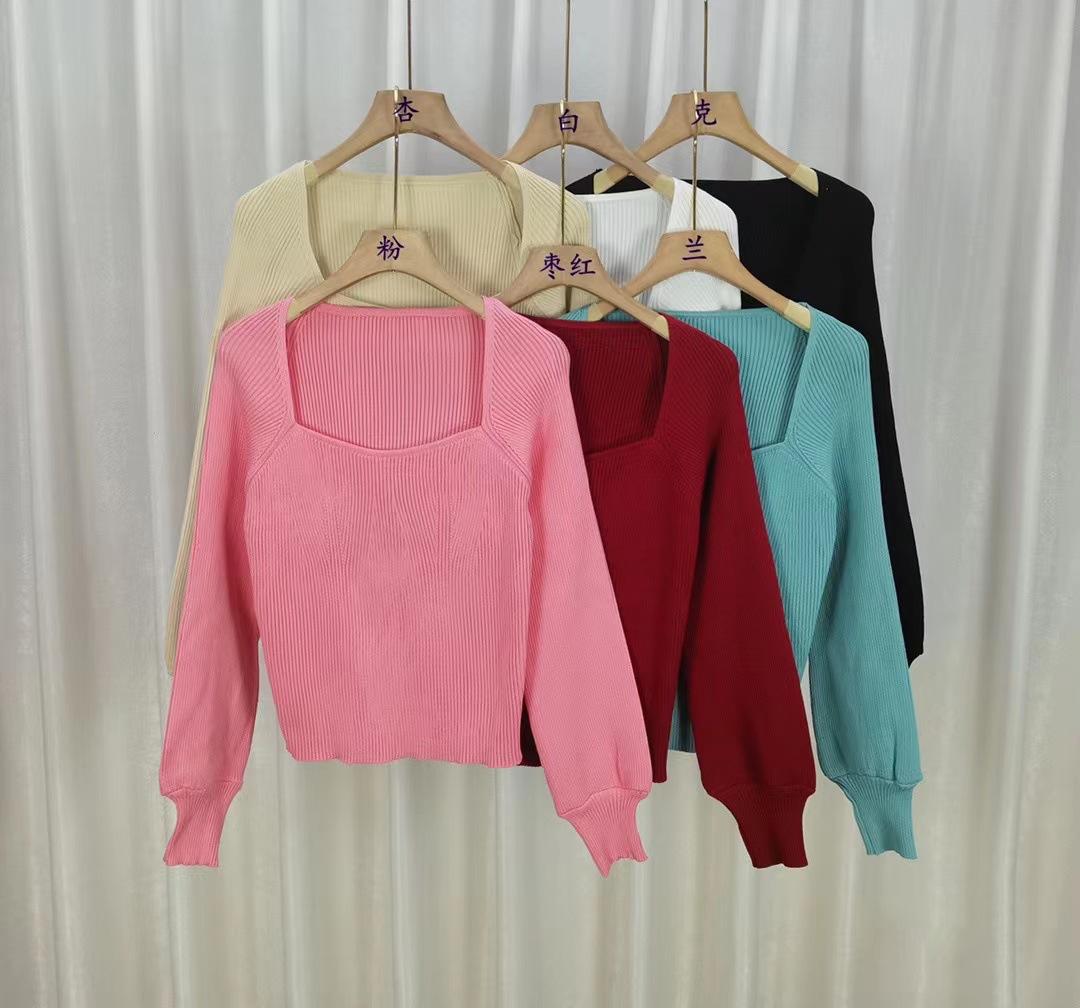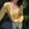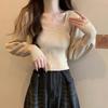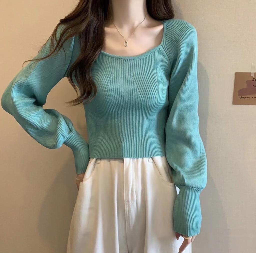 Diseño suéter de punto de cuello cuadrado para mujer otoño pequeño corto ajustado chic suéter de manga larga