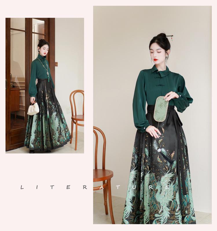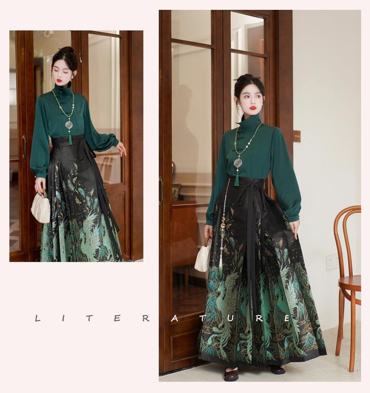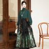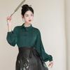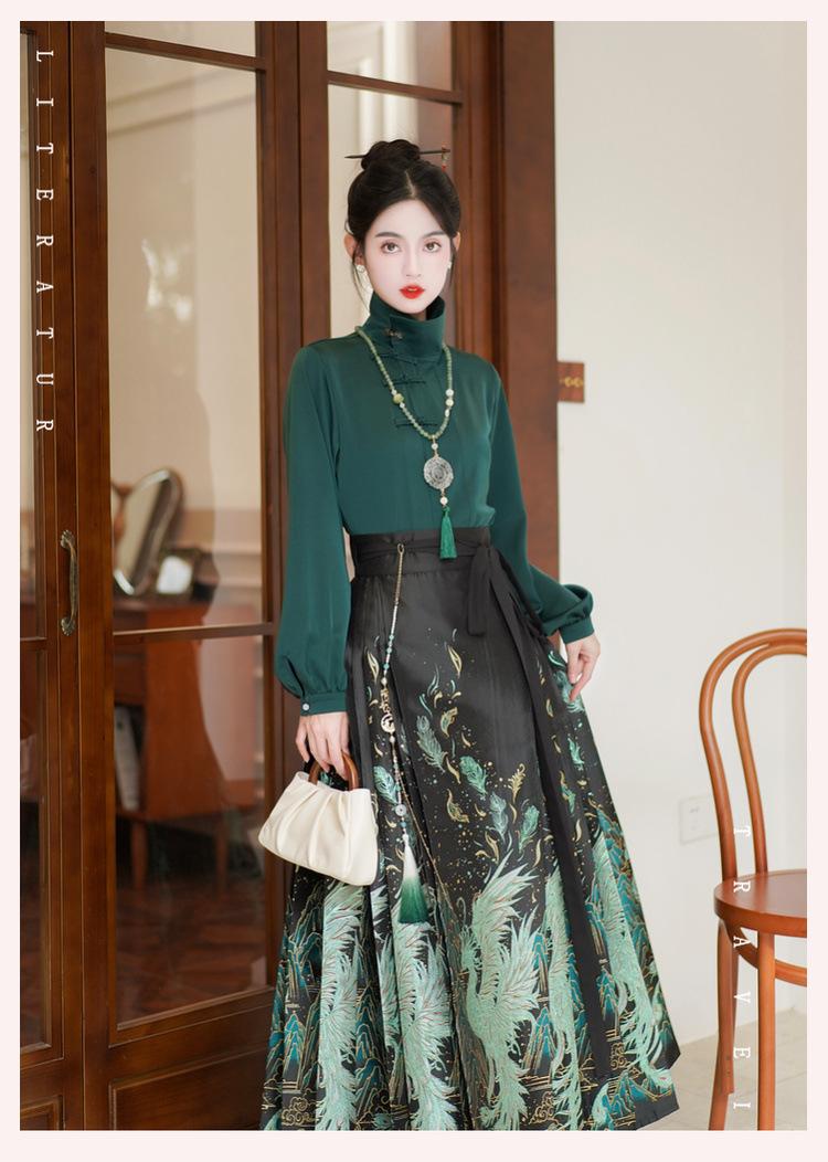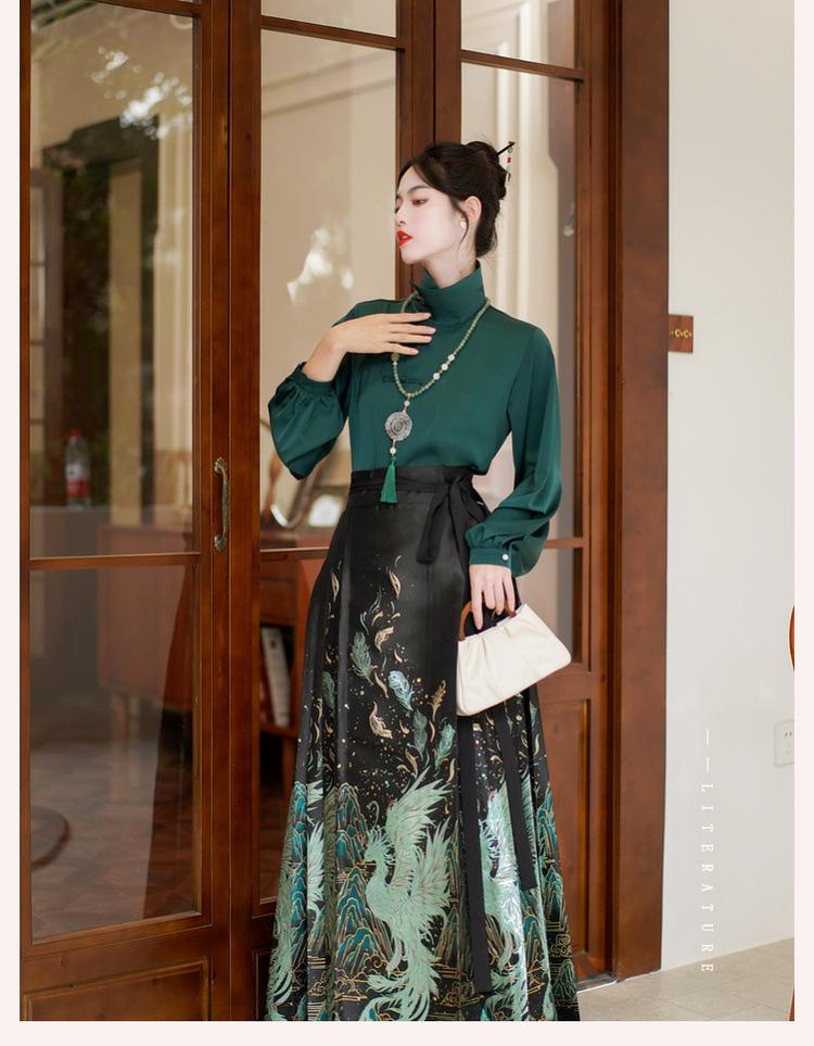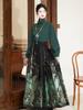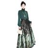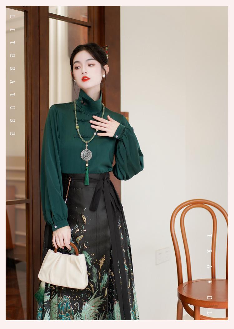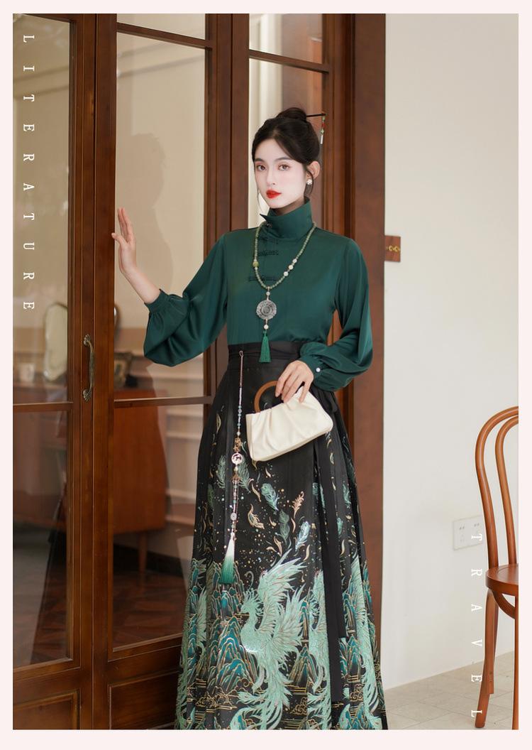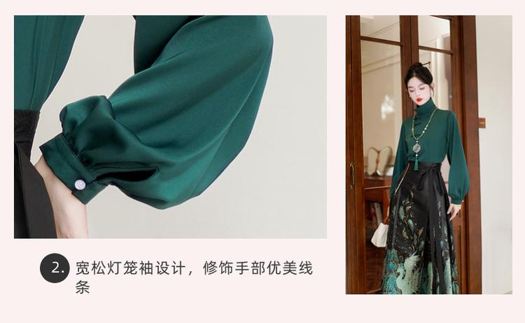 Nuevo traje de ropa Ming Han china 2024 Primavera cuello alto camisa de dos vías top verde pluma tejida flor de maquillaje dorado chaleco falda