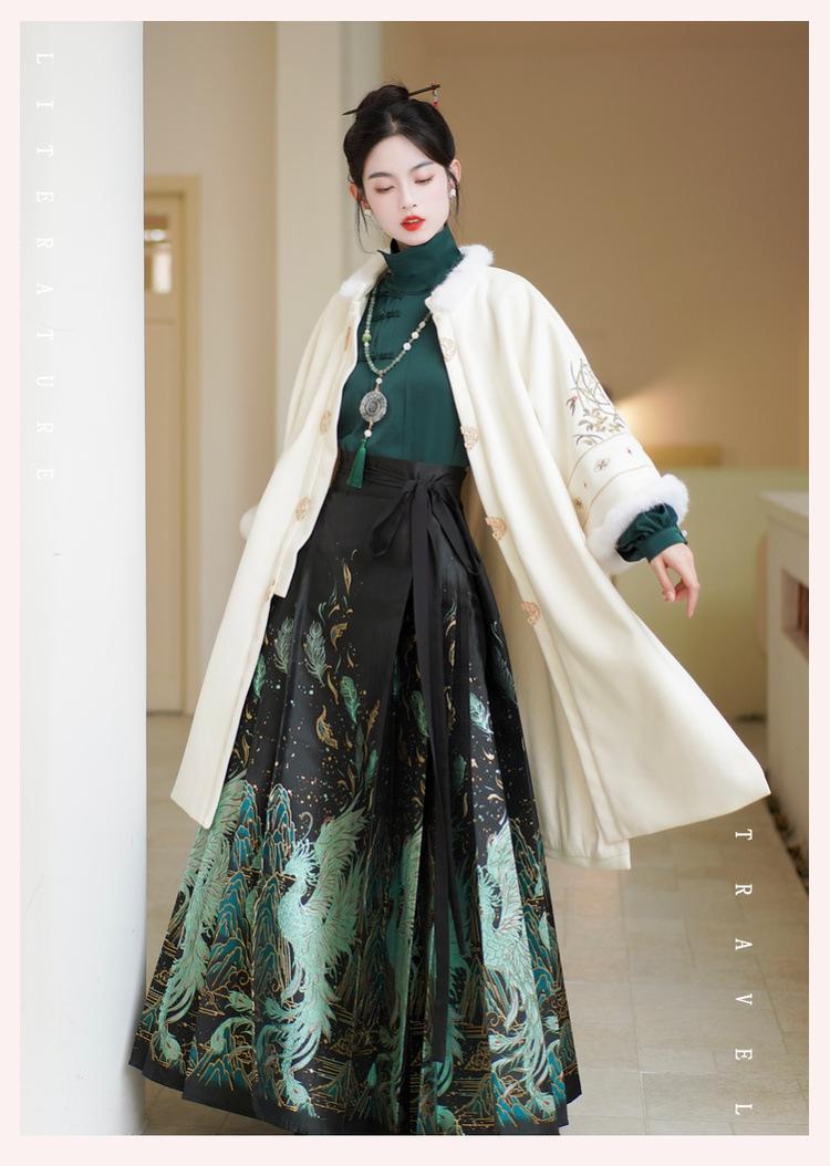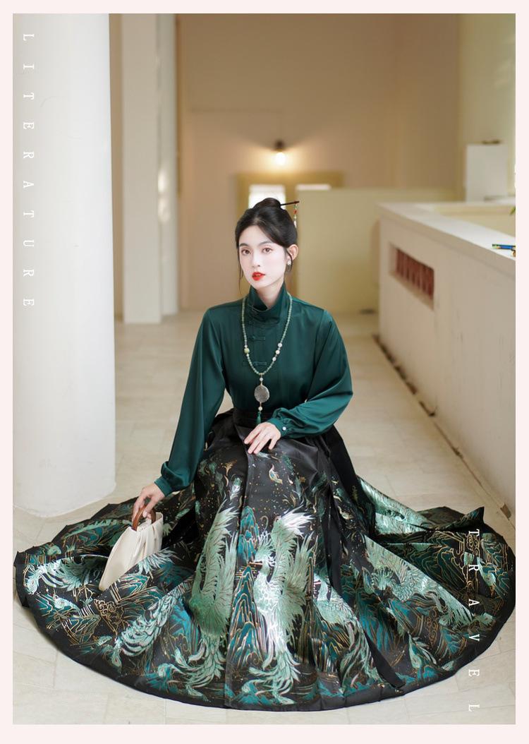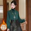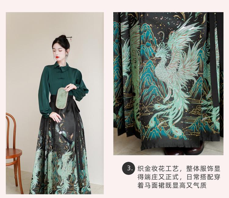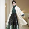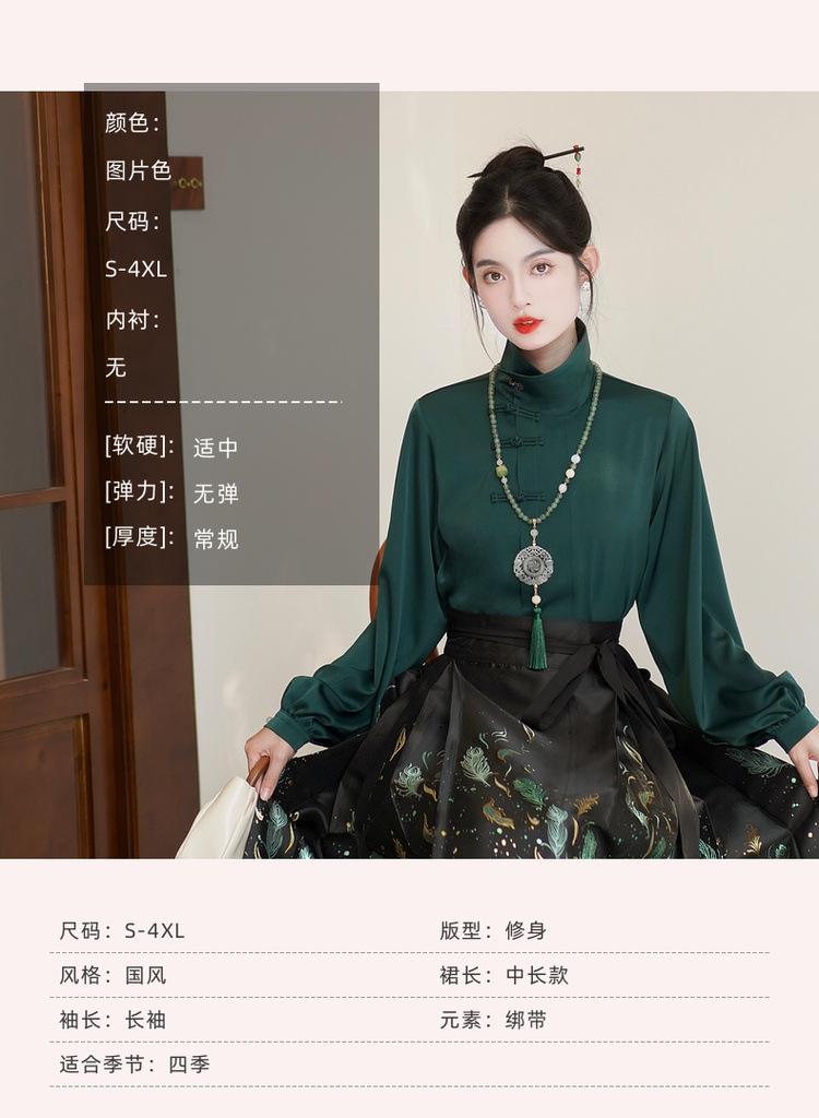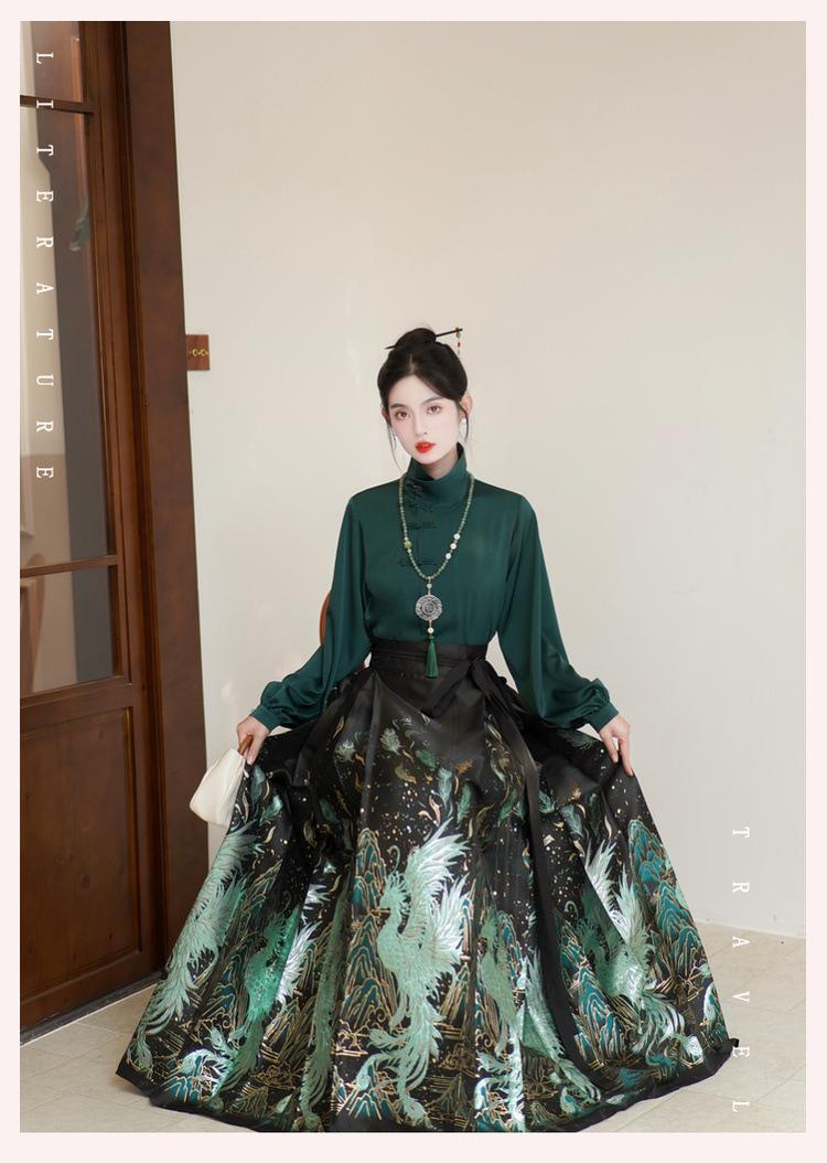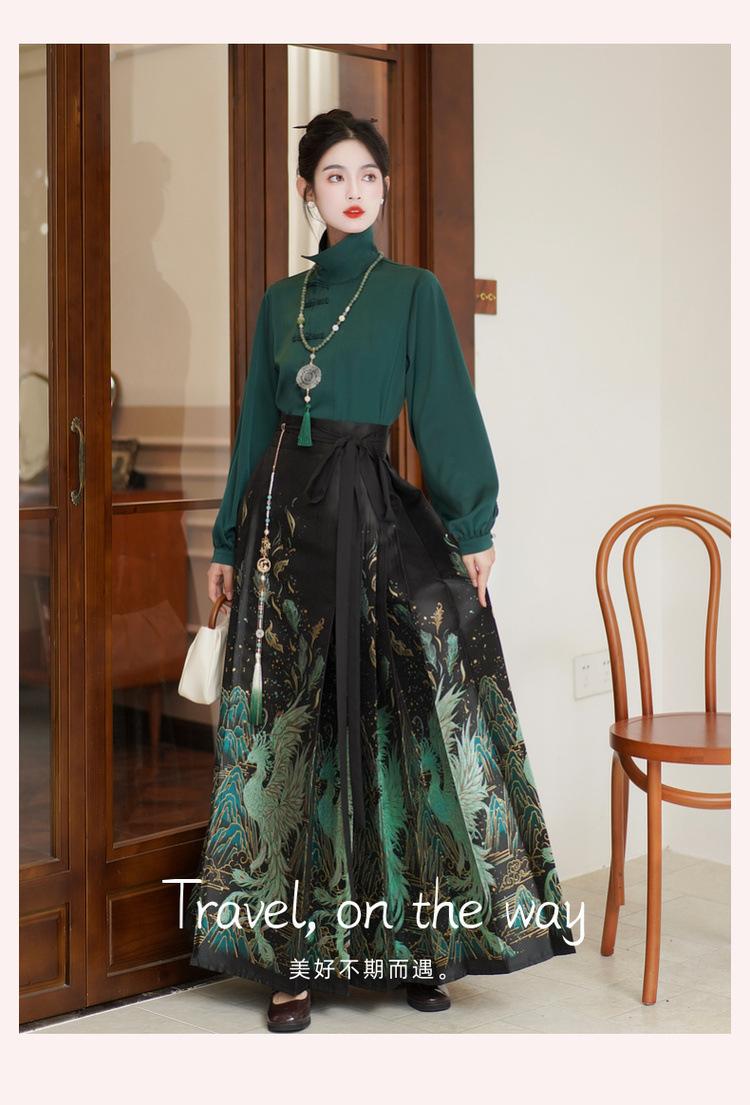 Nuevo traje de ropa Ming Han china 2024 Primavera cuello alto camisa de dos vías top verde pluma tejida flor de maquillaje dorado chaleco falda