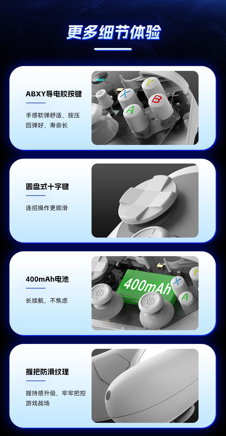 4. Botones de goma conductiva ABXY, buen rebote al presionar; cruceta tipo disco, operación combo más fluida; textura antideslizante en el agarre, sujeta firmemente el campo de batalla.