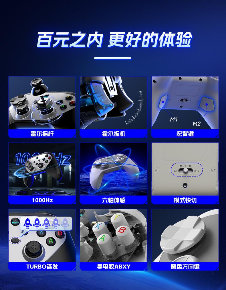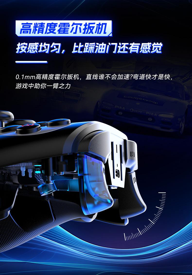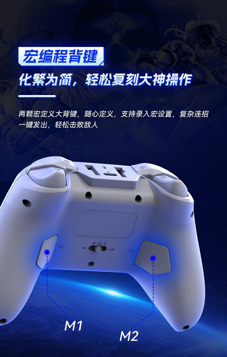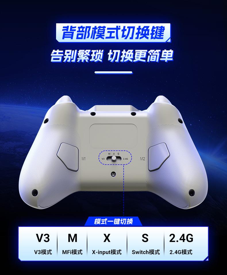6. Botón de cambio de modo en la parte posterior, cambio de un clic entre cinco modos (modo V3, modo MFI, modo de entrada X, modo Switch, modo 2.4G).