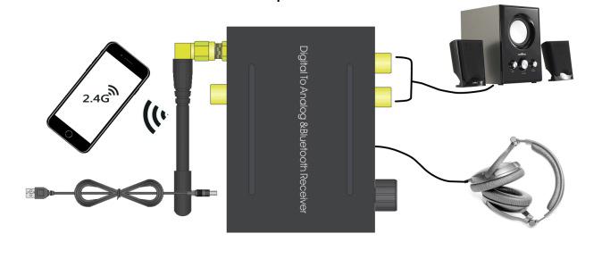 1. Si Bluetooth está conectado actualmente al usar entrada de fibra o coaxial, el convertidor cambiará automáticamente al modo Bluetooth. Al conectarse a Bluetooth, necesita desconectar el Bluetooth del dispositivo móvil cuando necesite usar entrada de fibra o coaxial.