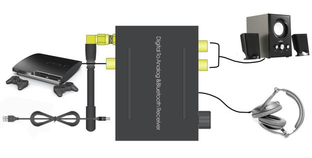 2. Conecte el conector de salida del convertidor a la entrada del amplificador AV usando el cable RCA o conéctelo al puerto de audio de 3.5 mm del convertidor usando el cable de los auriculares.