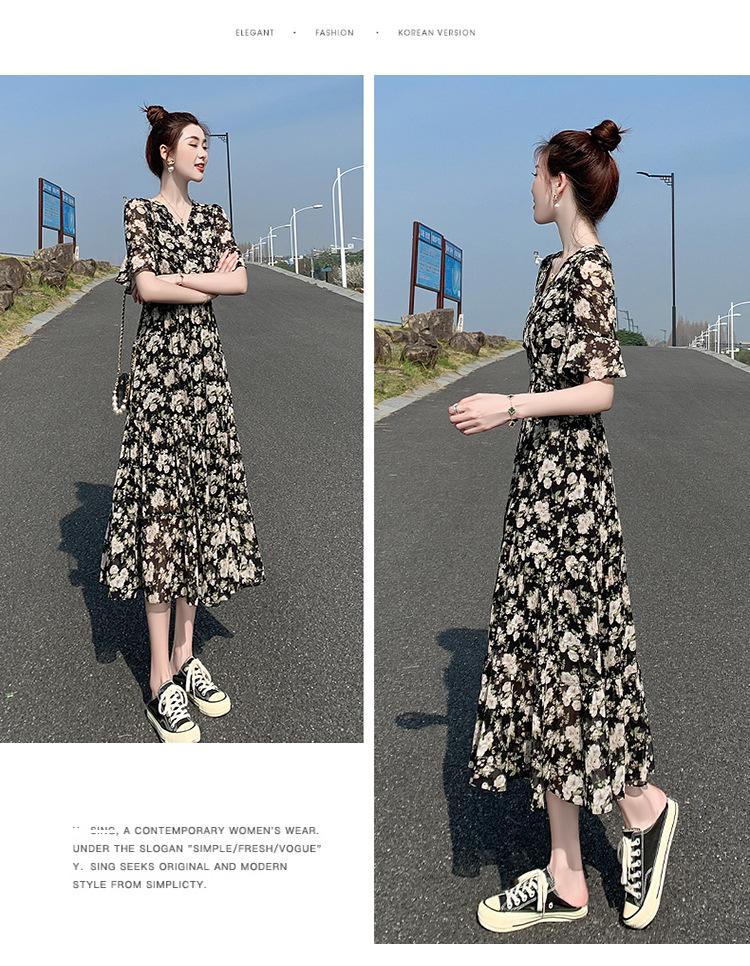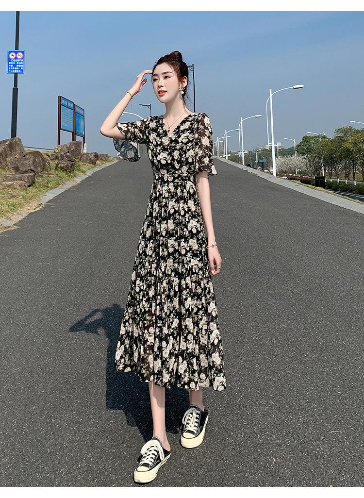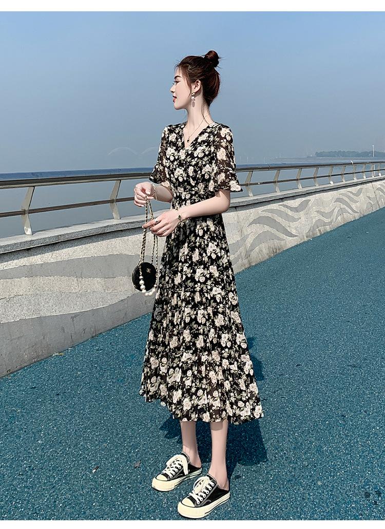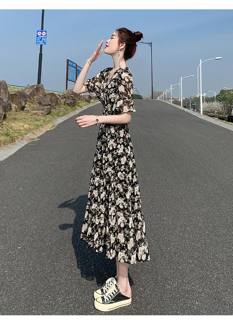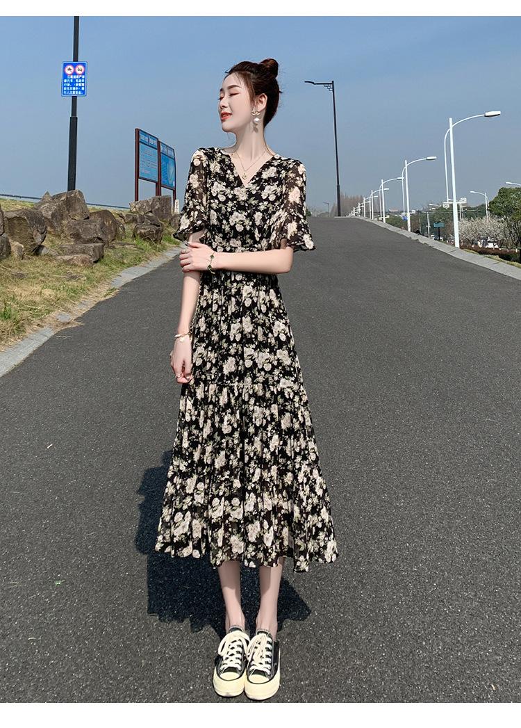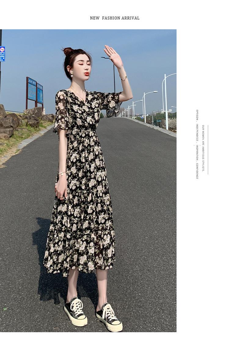 Vestido floral de cuello en V de longitud media para mujer, vestido de corte A con volantes y cintura adelgazante, novedad de verano de 2023