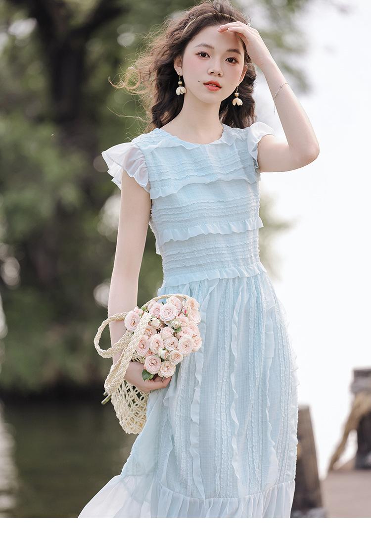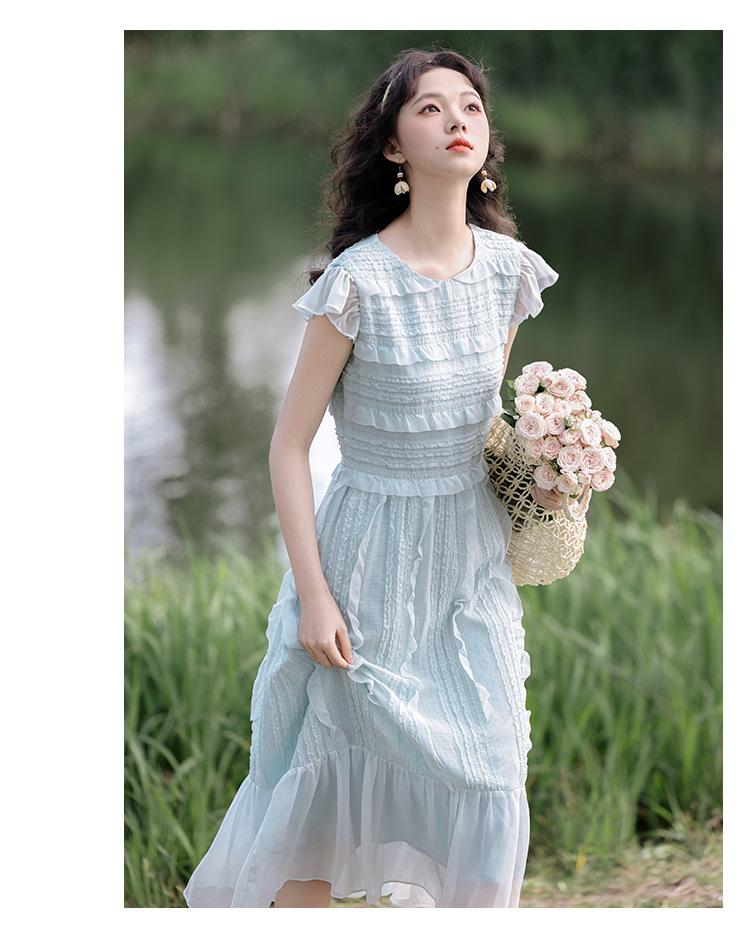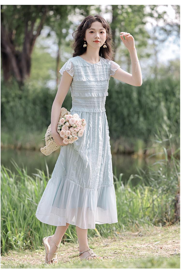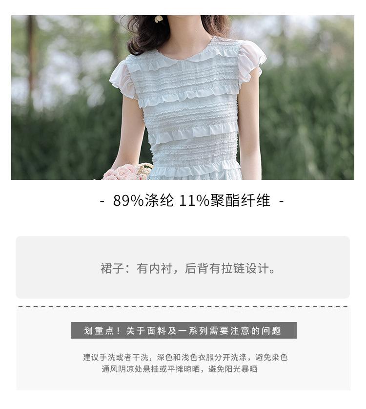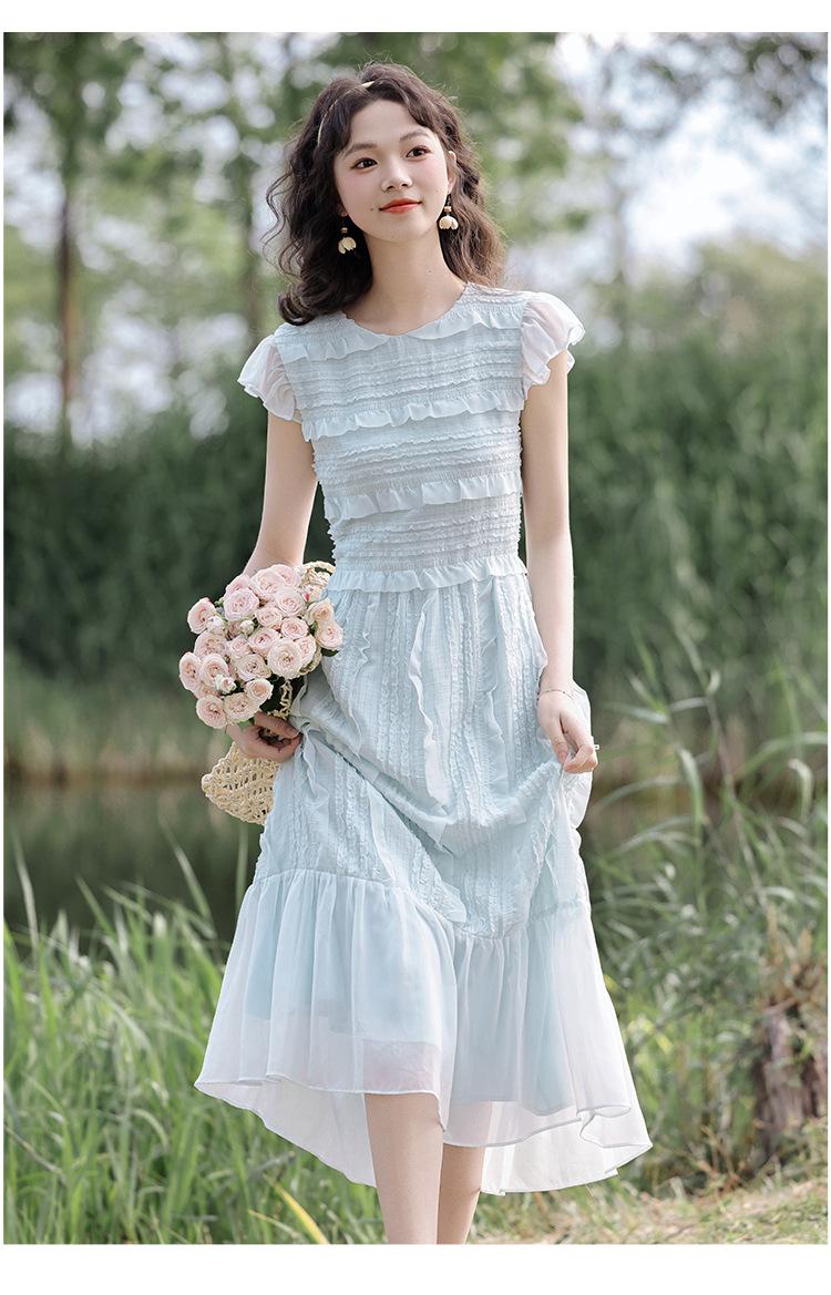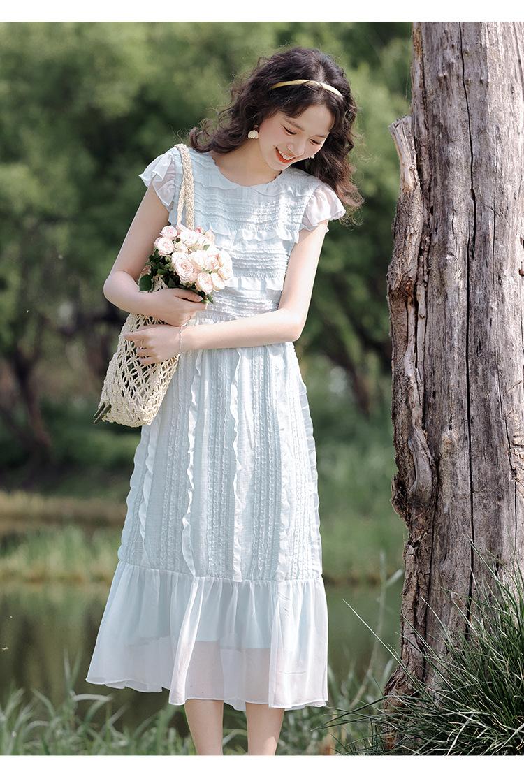 Vestido de verano 2025 para mujer, estilo francés, suave, con costuras plisadas y borde en las orejas, cintura adelgazante, manga corta y cuello redondo.