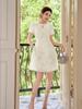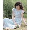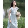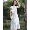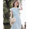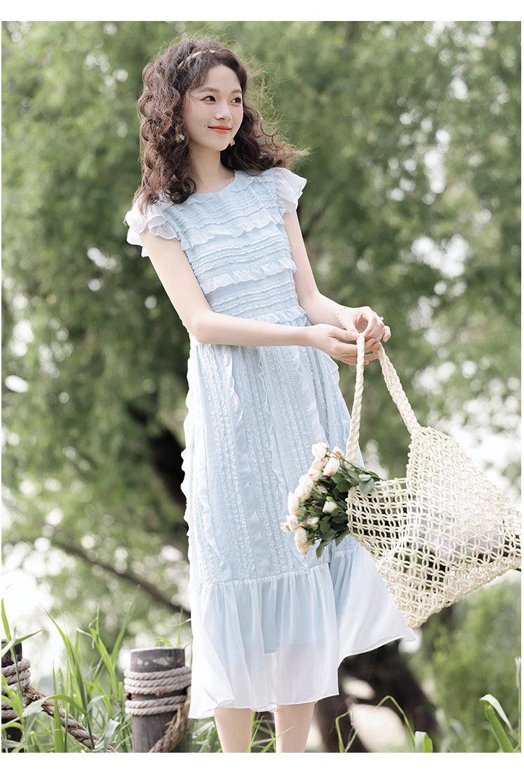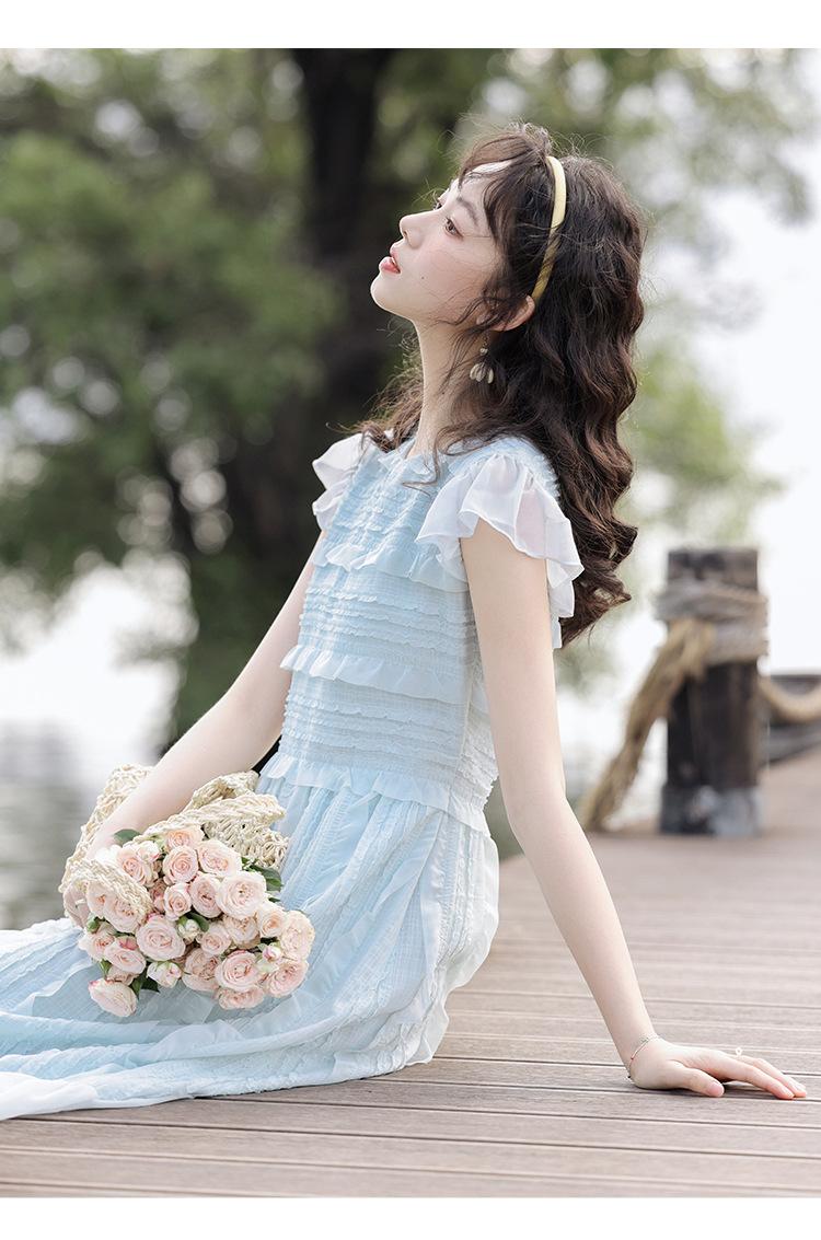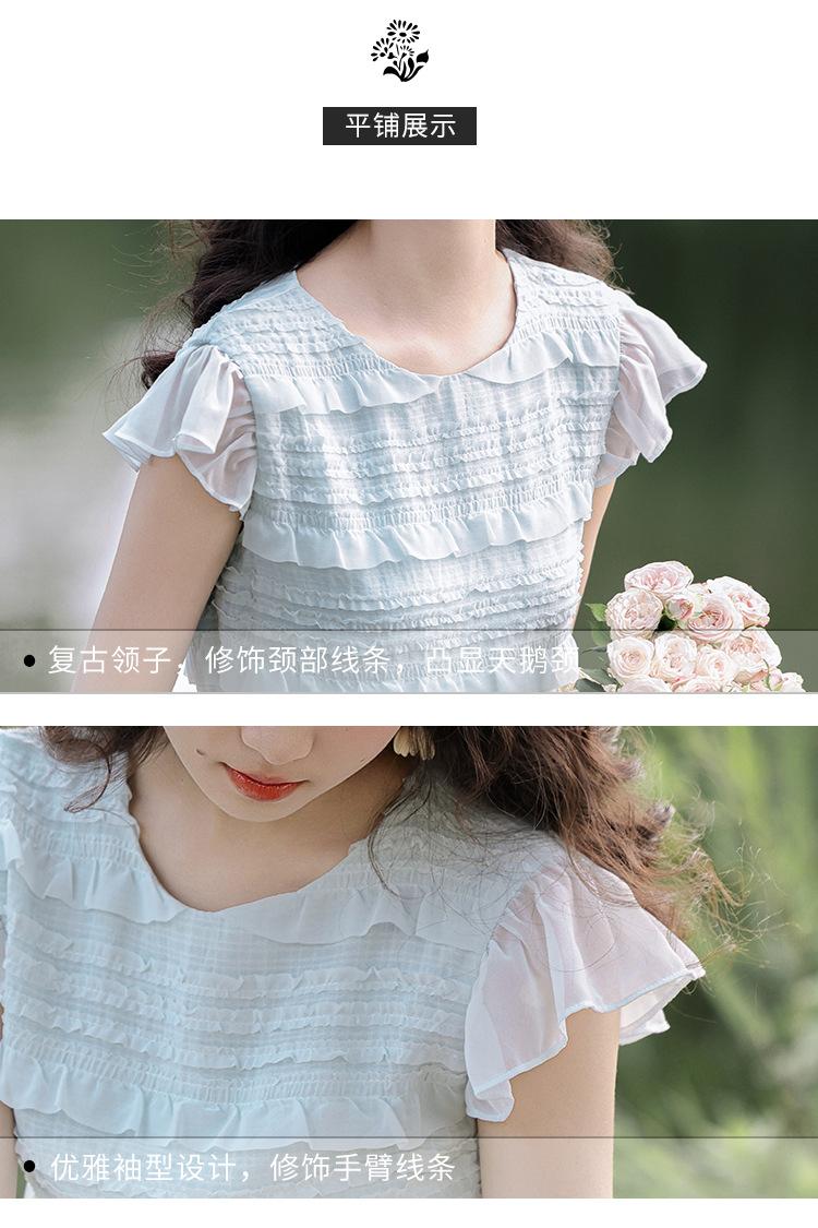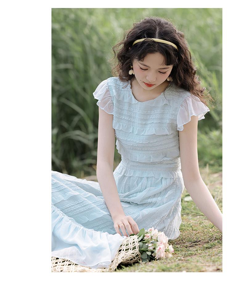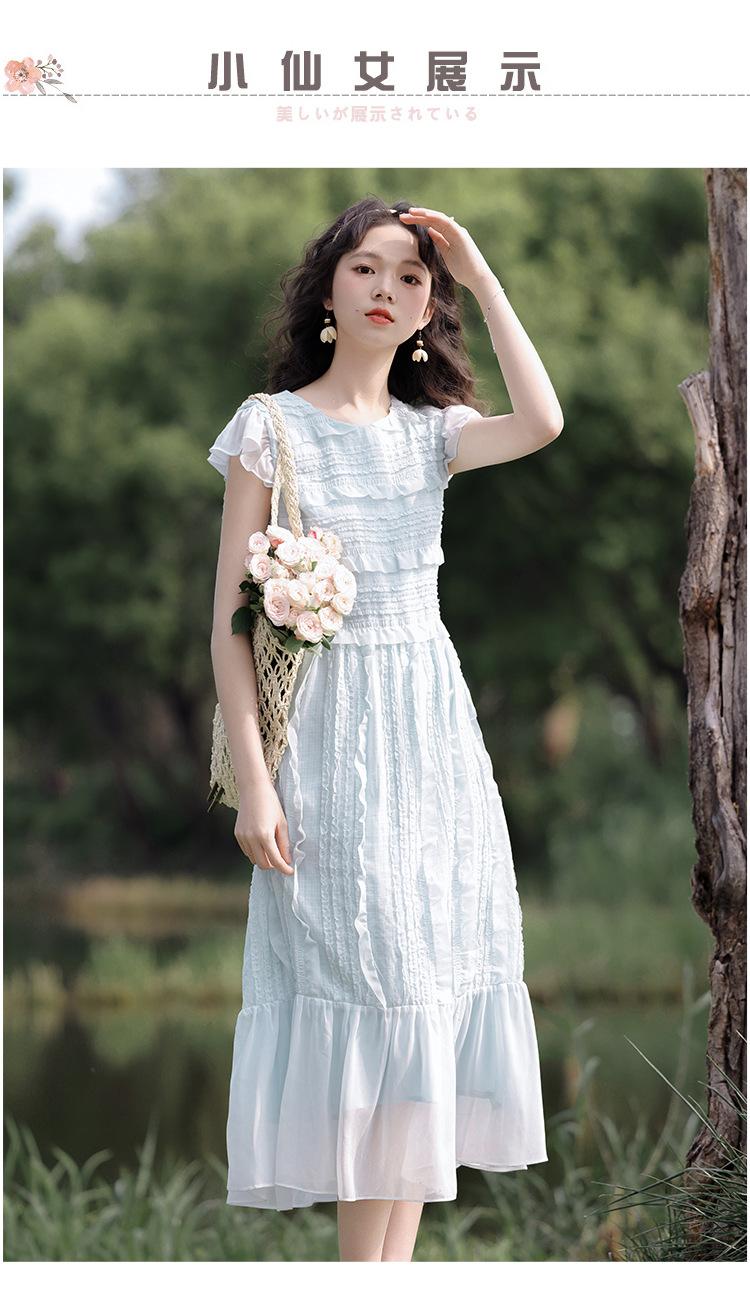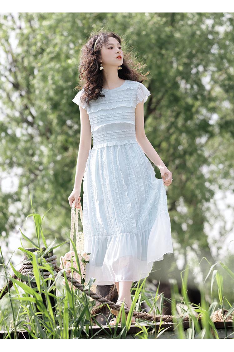 Vestido de verano 2025 para mujer, estilo francés, suave, con costuras plisadas y borde en las orejas, cintura adelgazante, manga corta y cuello redondo.