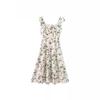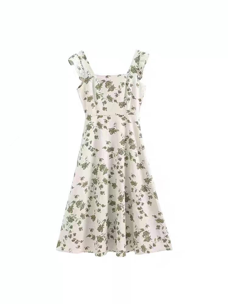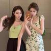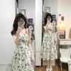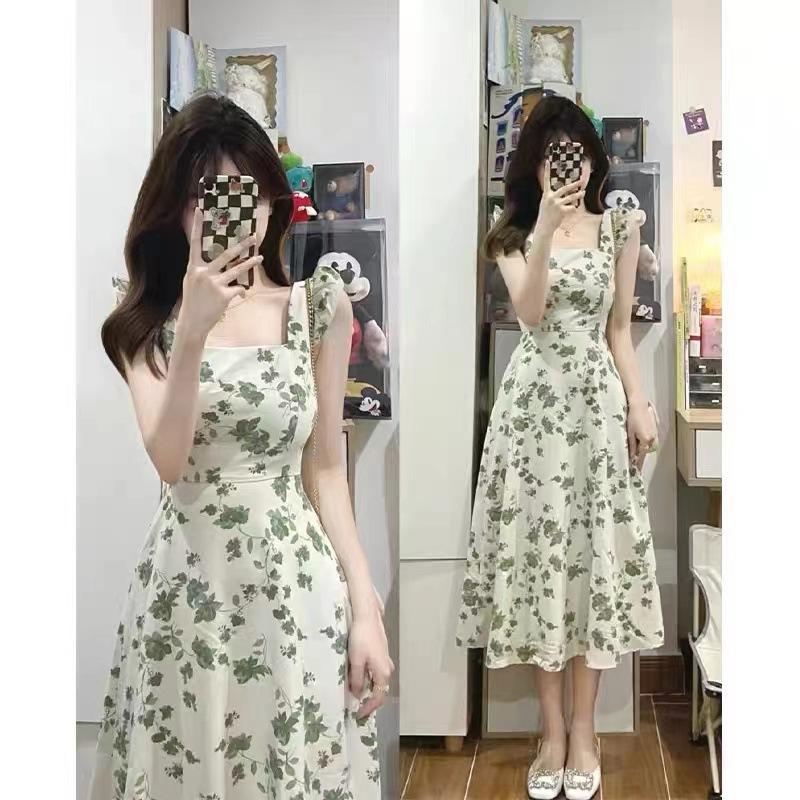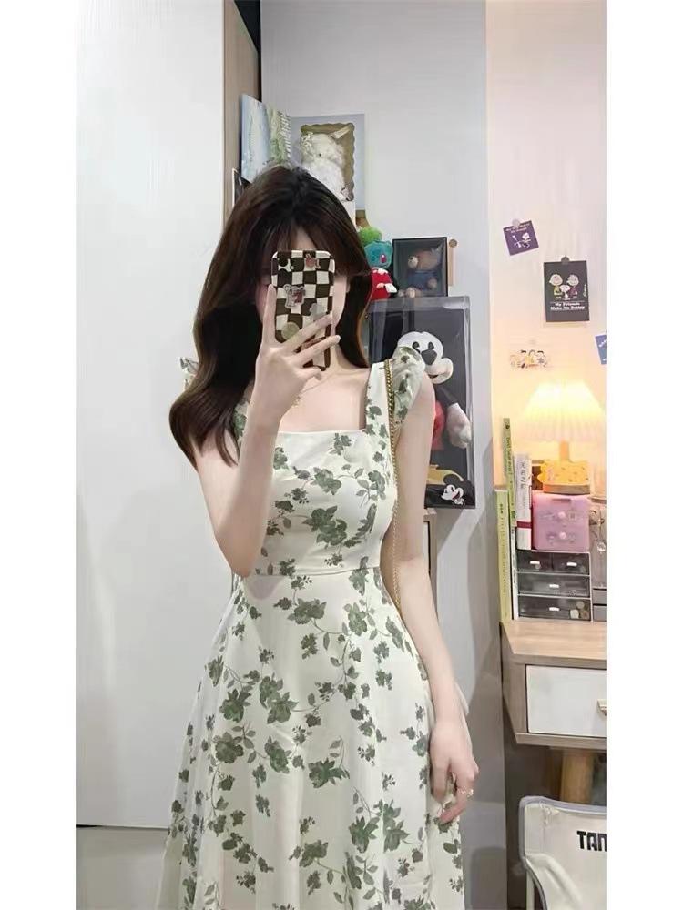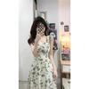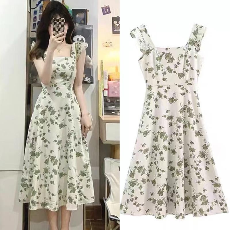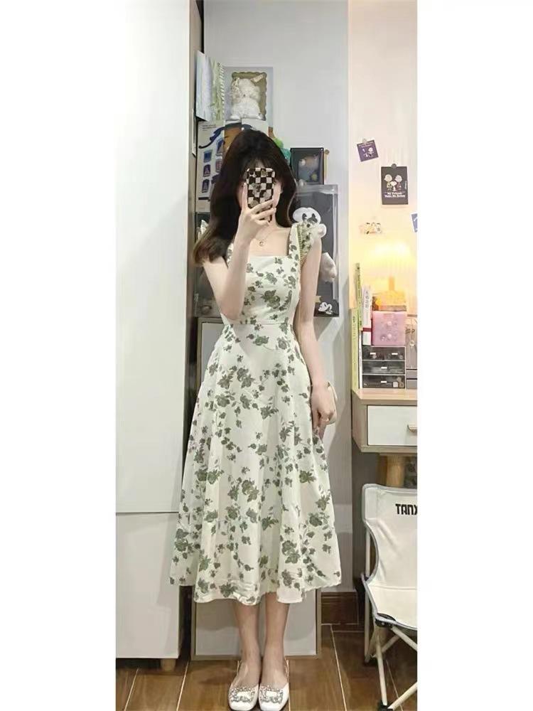 Verano 2025 Nuevo Vestido Floral Verde para Mujer Francés Línea A Falda de Tirantes Diseño Nicho Falda de Cintura para Mujer