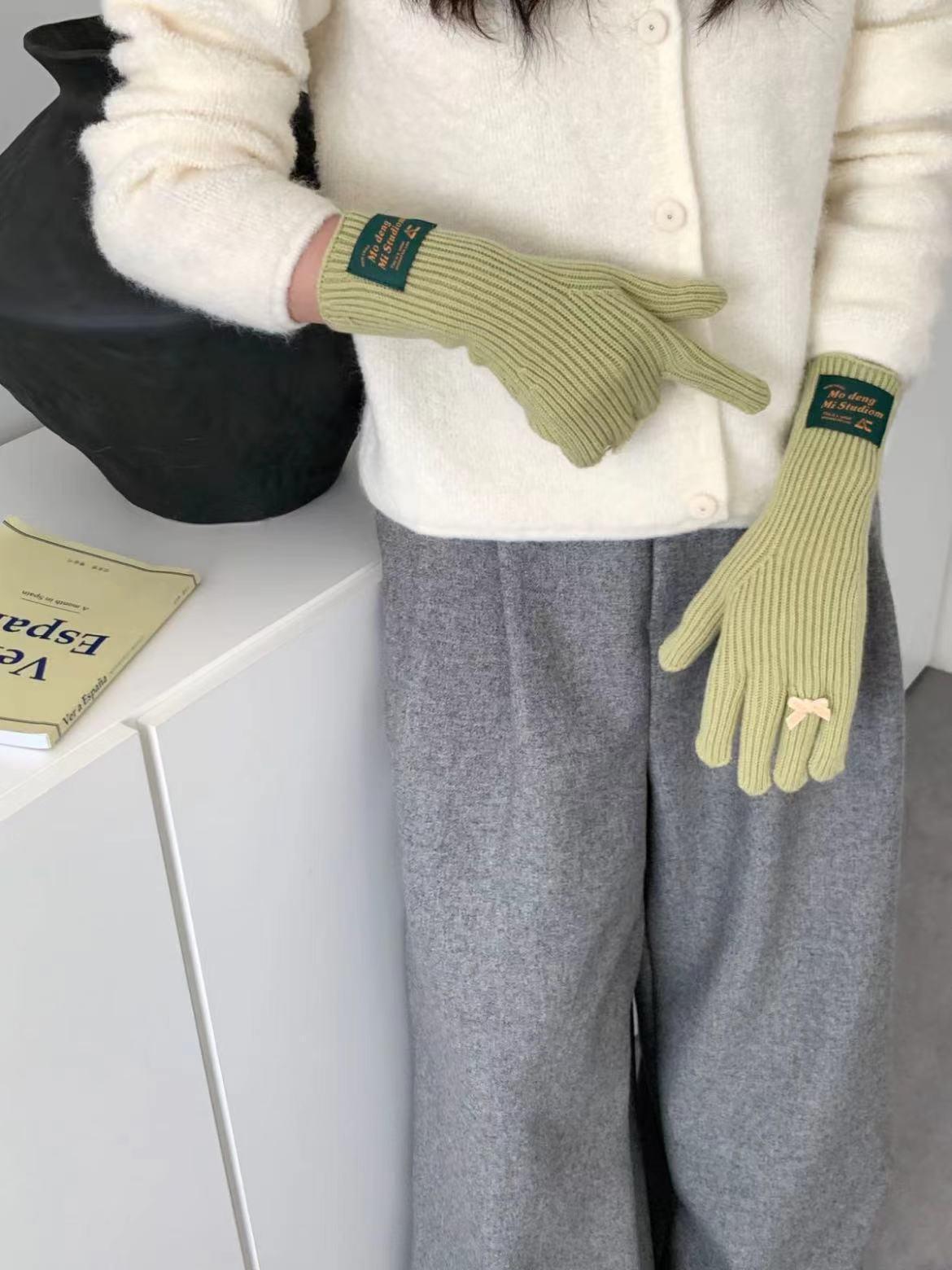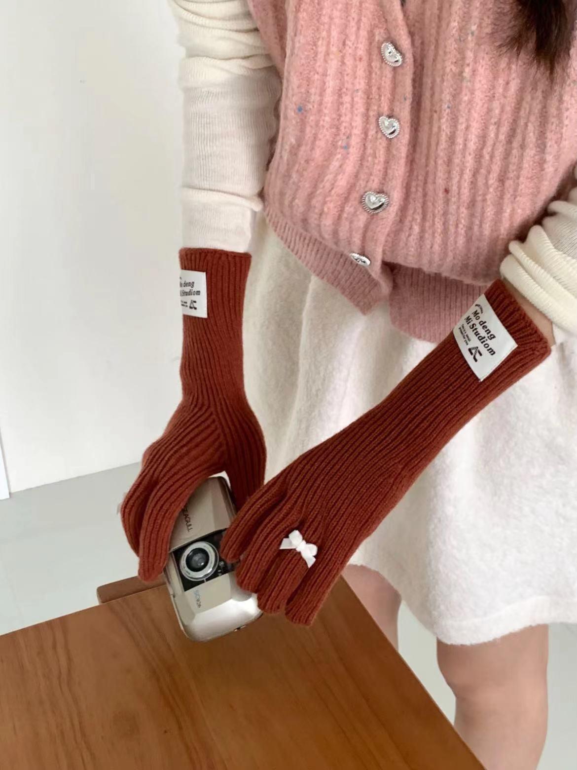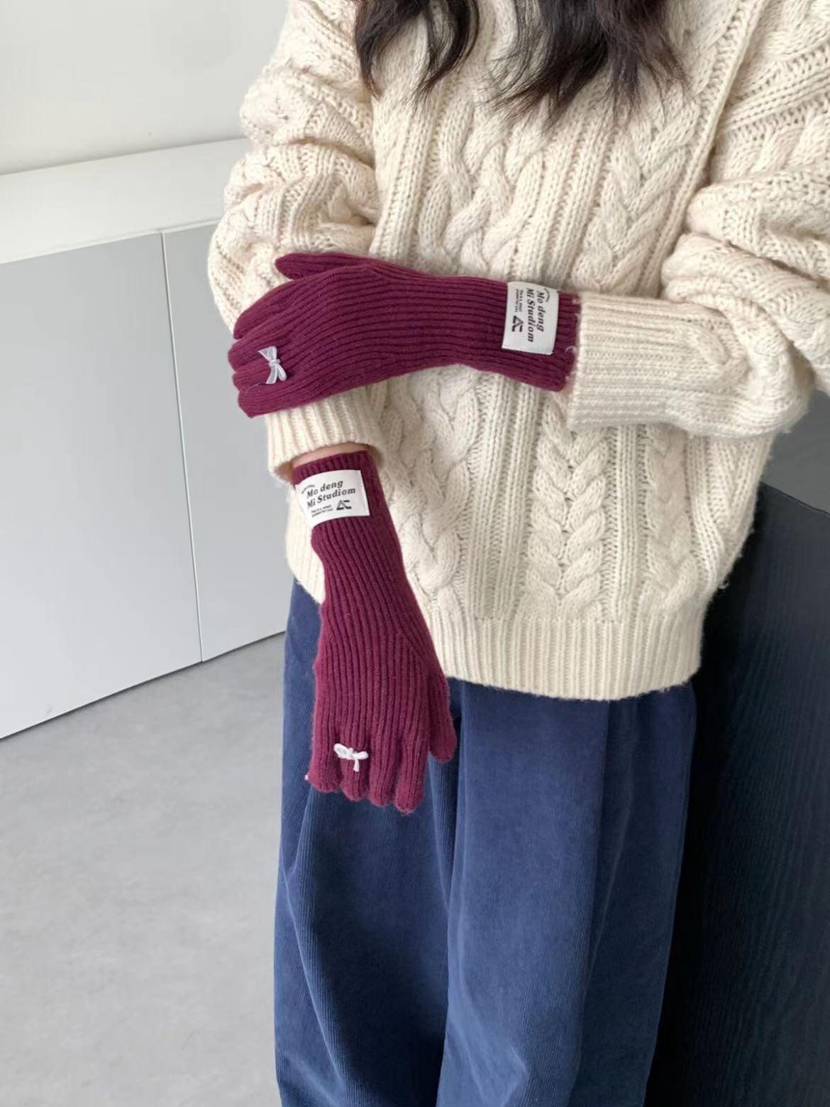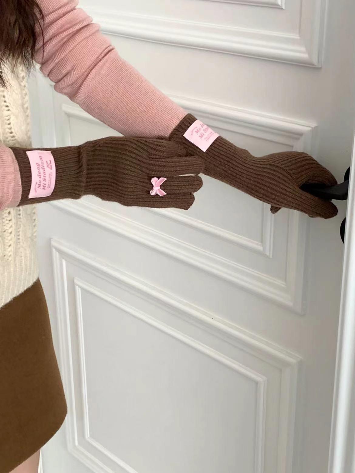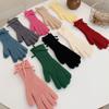 Guantes de lana de punto cálidos con cinco dedos, estilo coreano Miu, estilo dulce, con lazo largo y resistente al frío y pantalla táctil para mujer