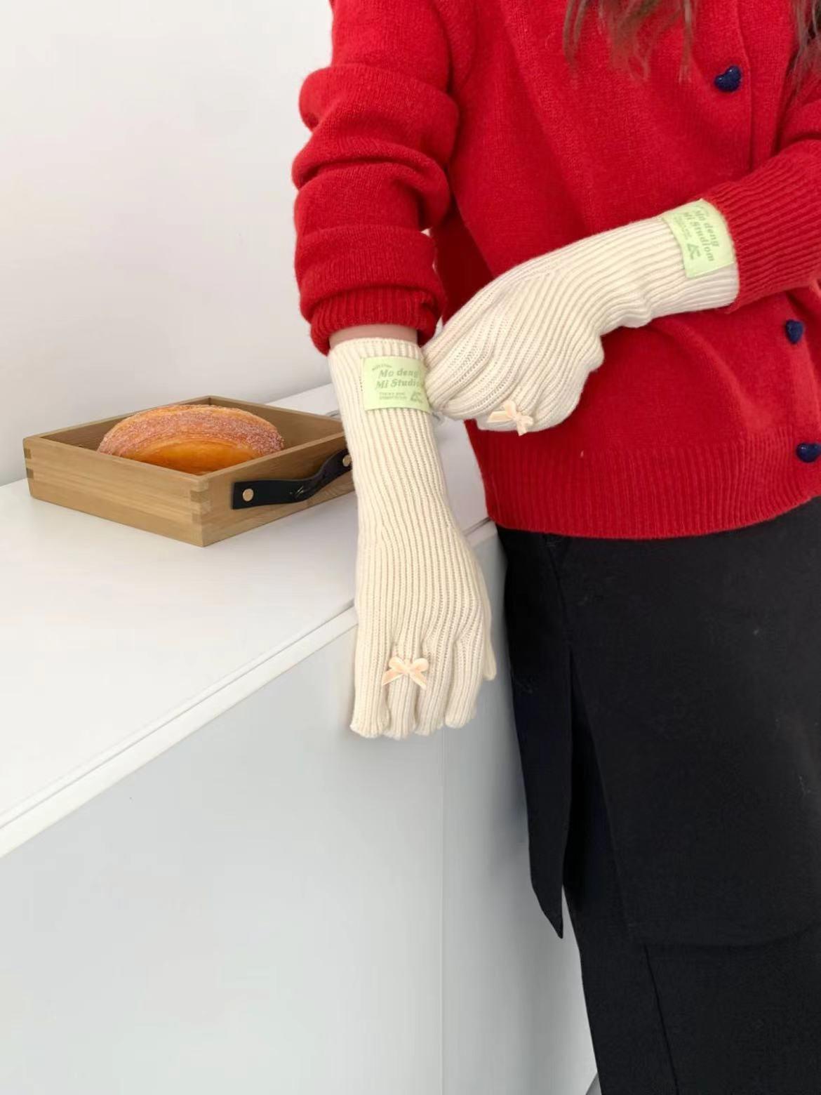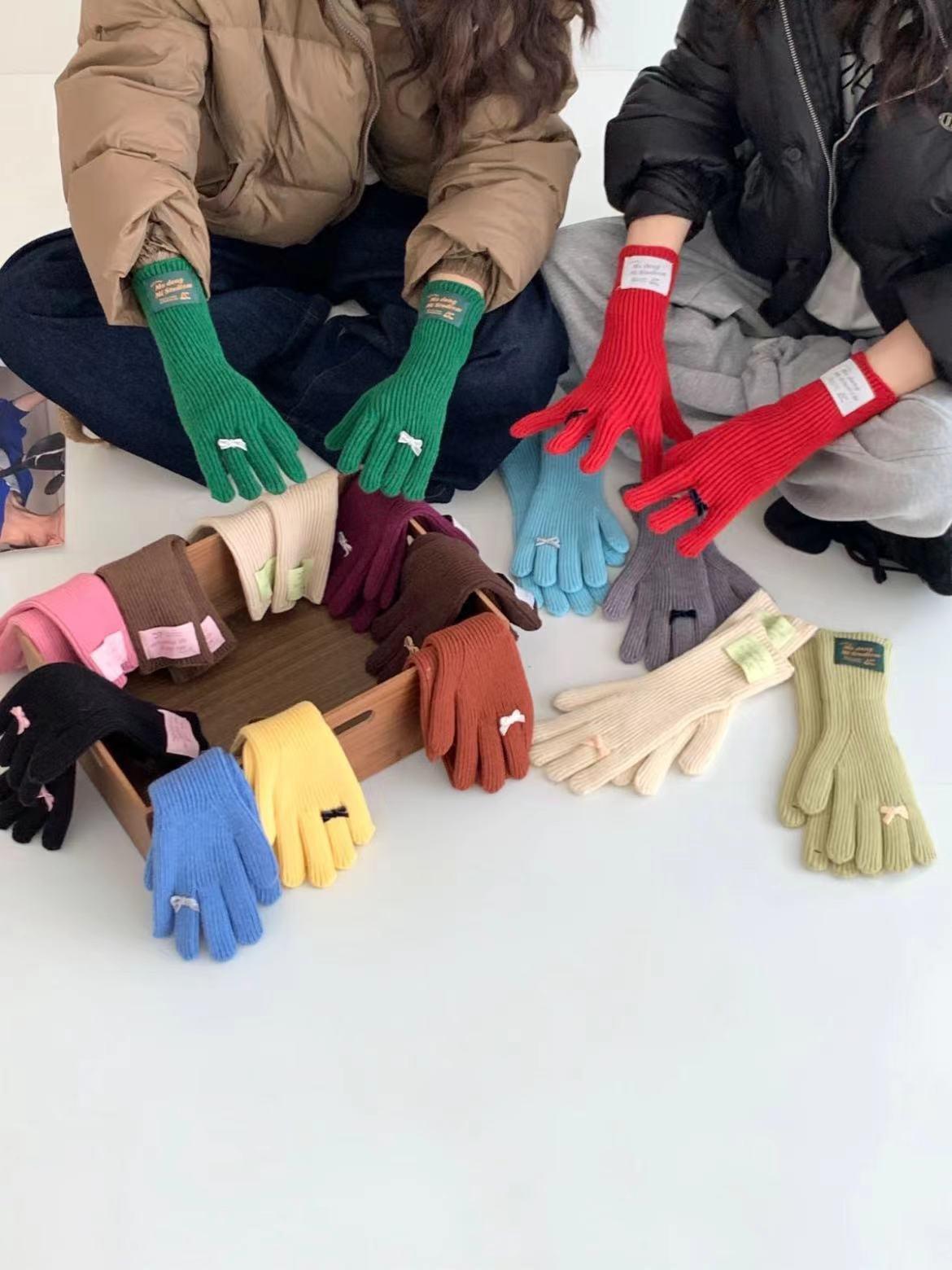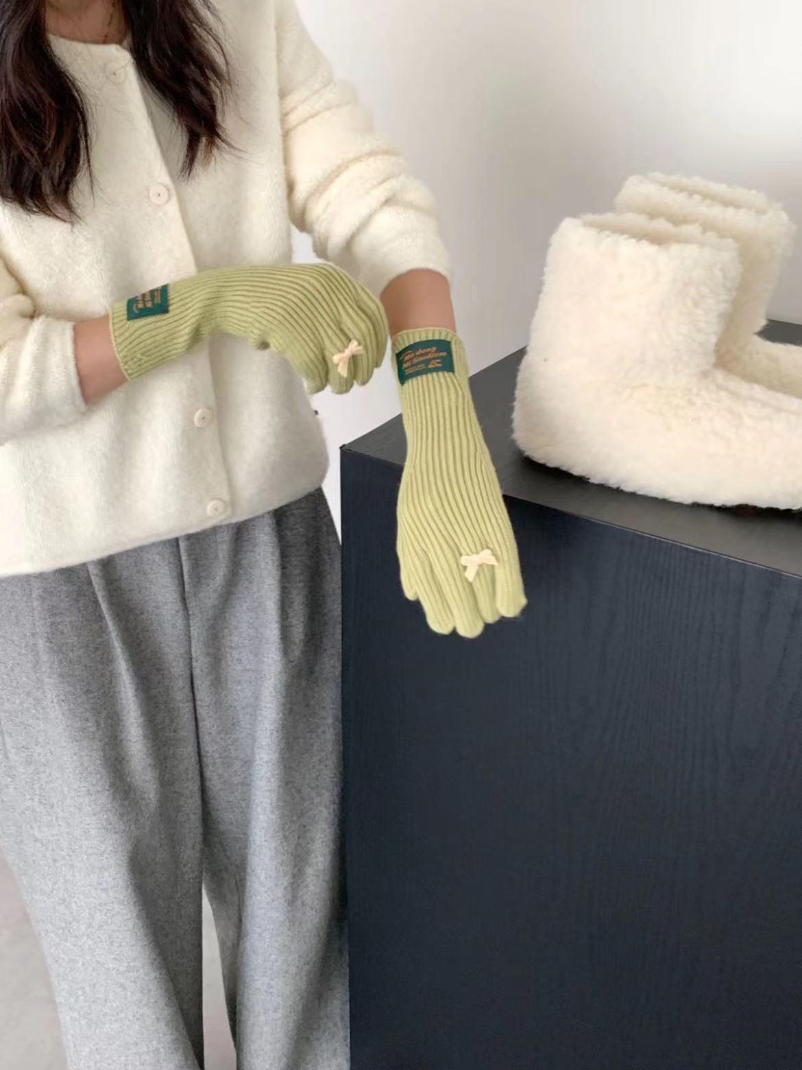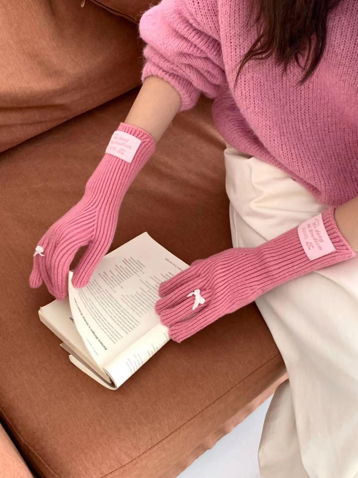 Guantes de lana de punto cálidos con cinco dedos, estilo coreano Miu, estilo dulce, con lazo largo y resistente al frío y pantalla táctil para mujer