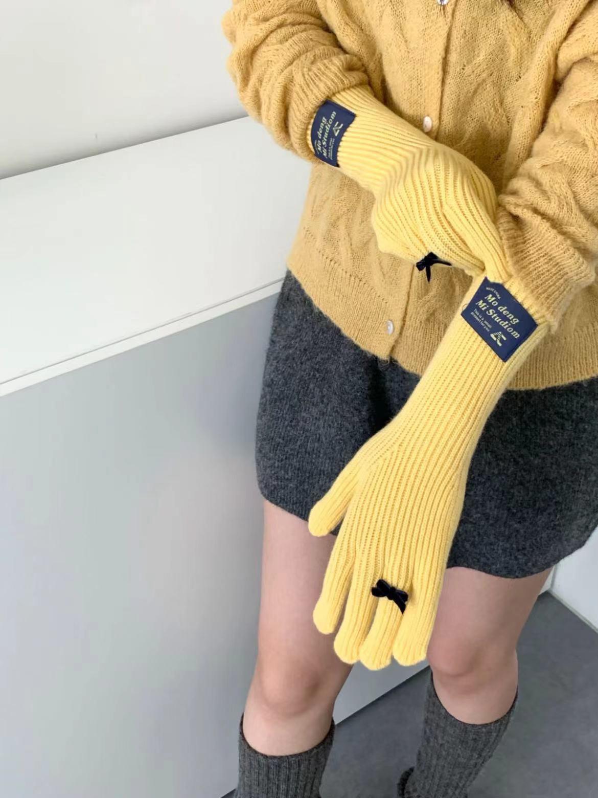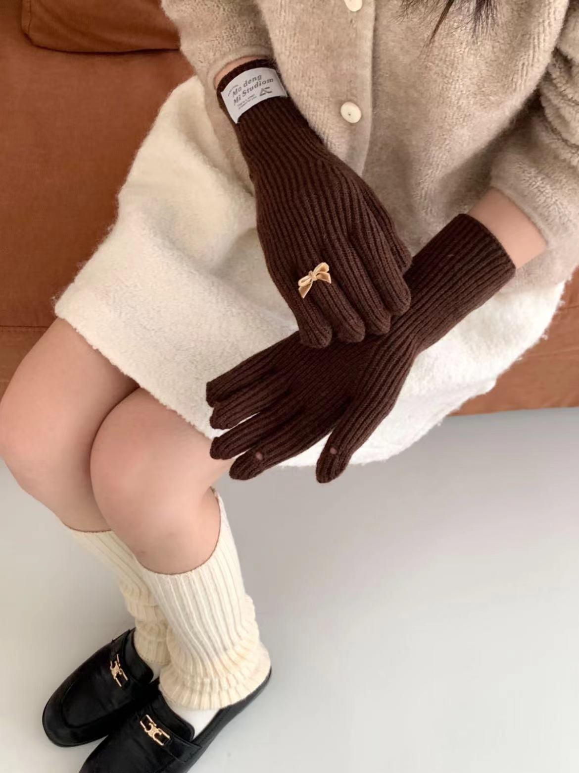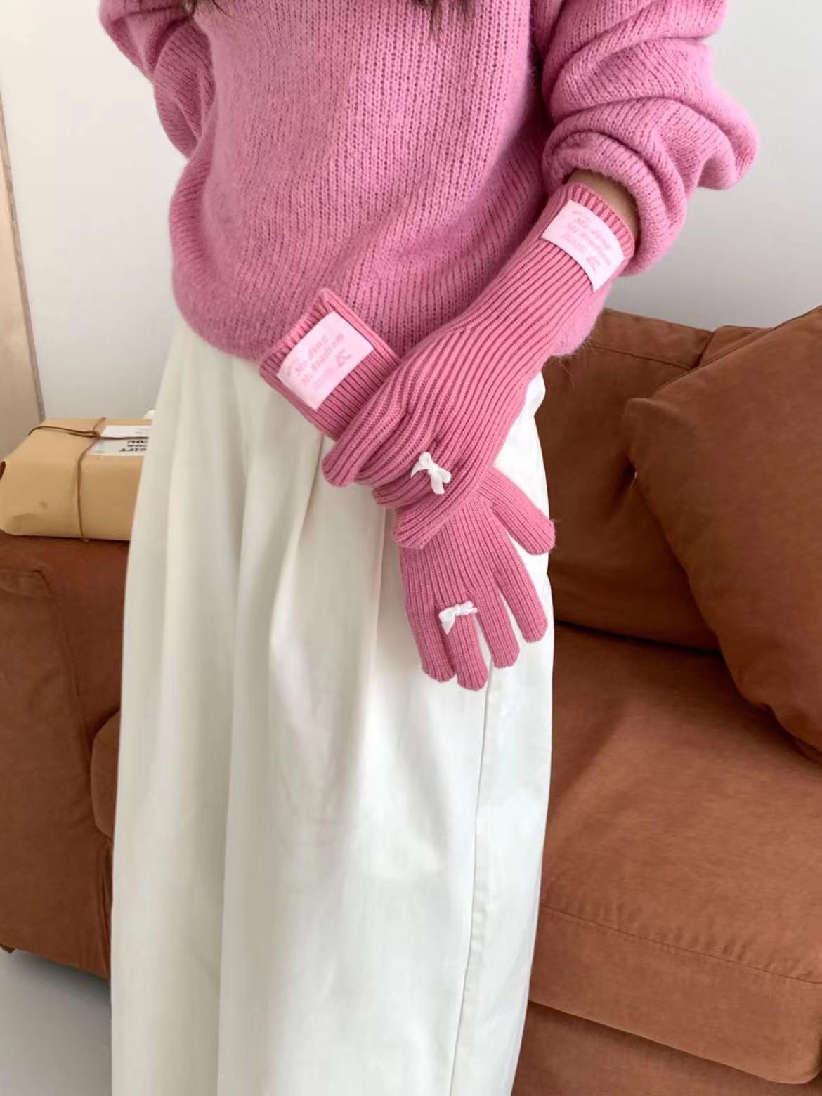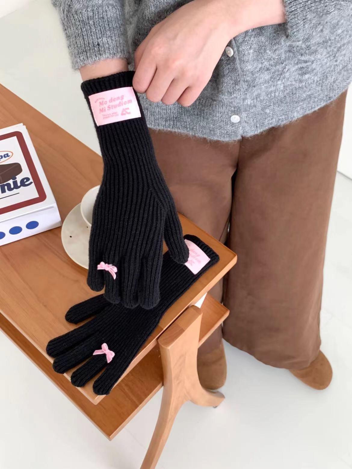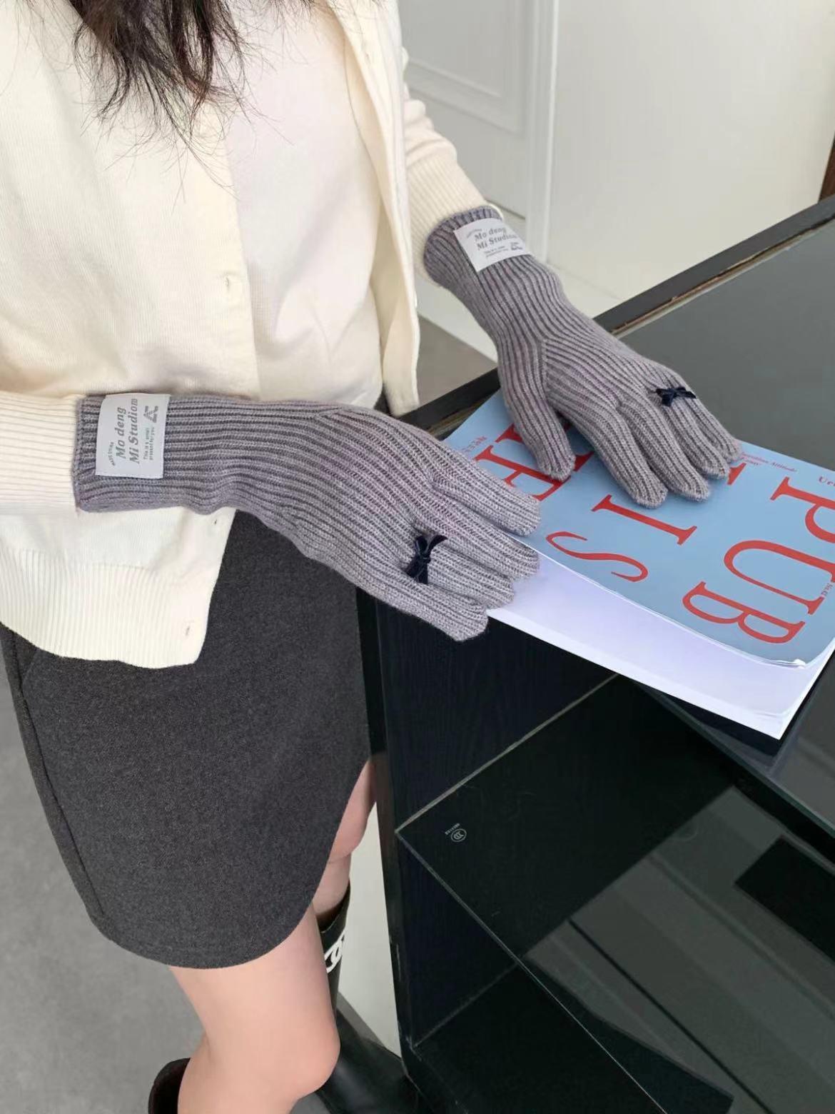 Guantes de lana de punto cálidos con cinco dedos, estilo coreano Miu, estilo dulce, con lazo largo y resistente al frío y pantalla táctil para mujer