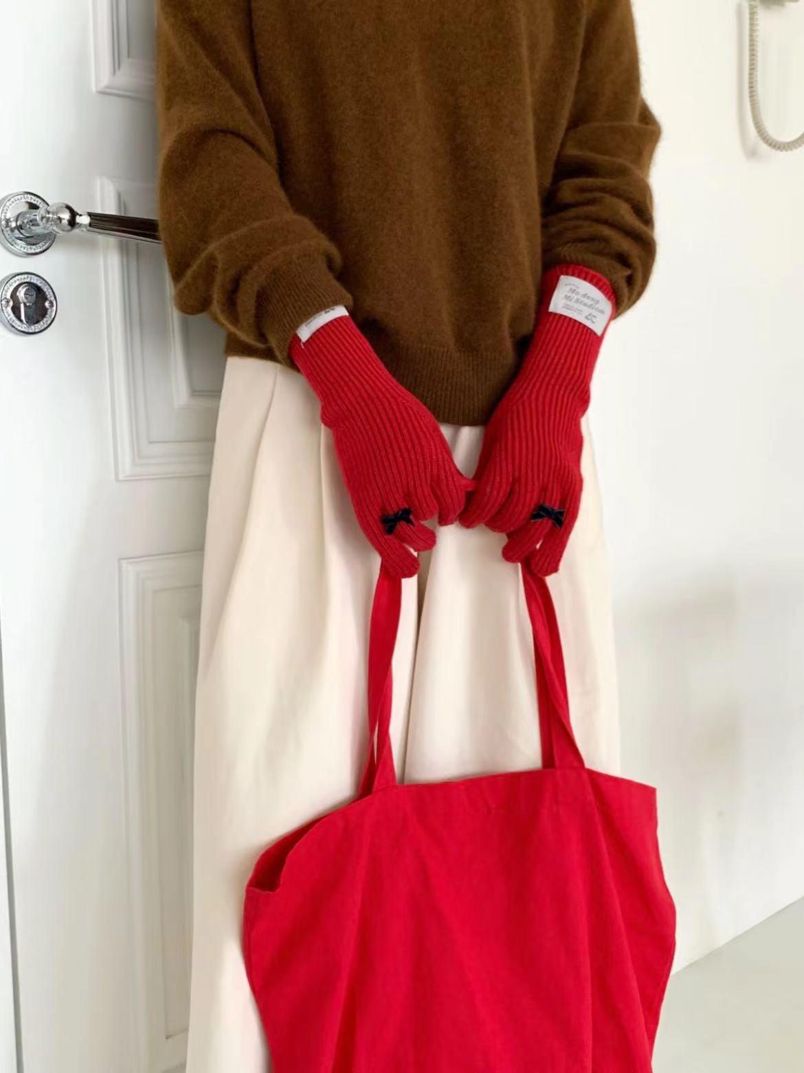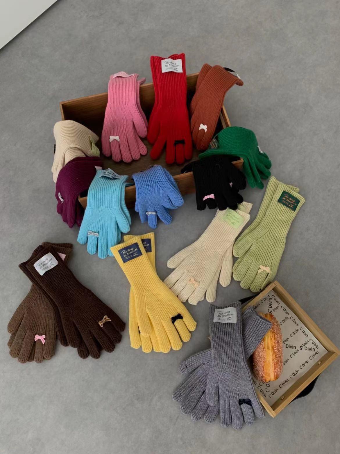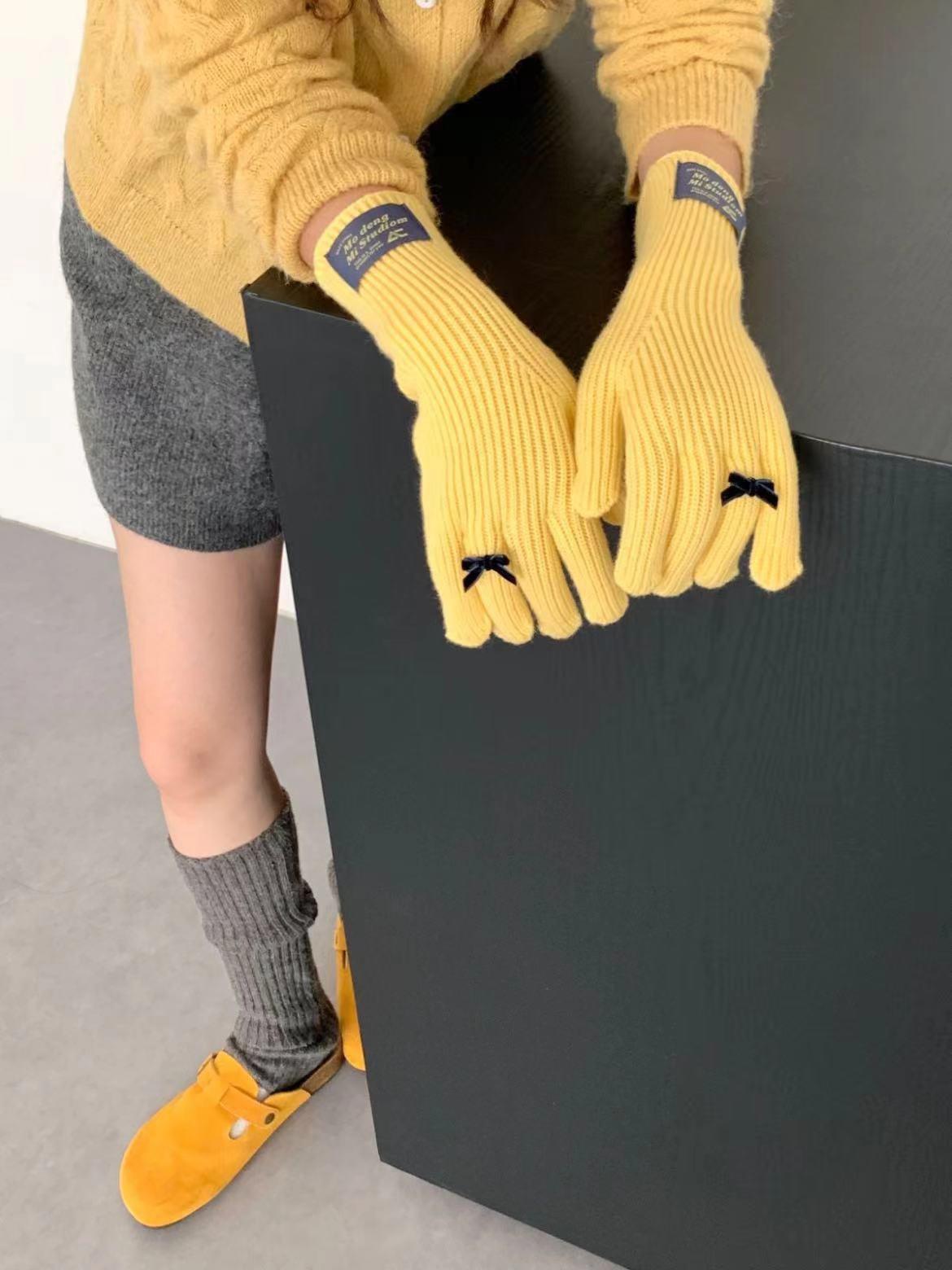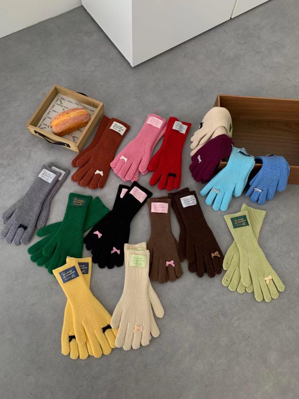 Guantes de lana de punto cálidos con cinco dedos, estilo coreano Miu, estilo dulce, con lazo largo y resistente al frío y pantalla táctil para mujer