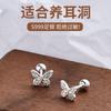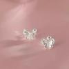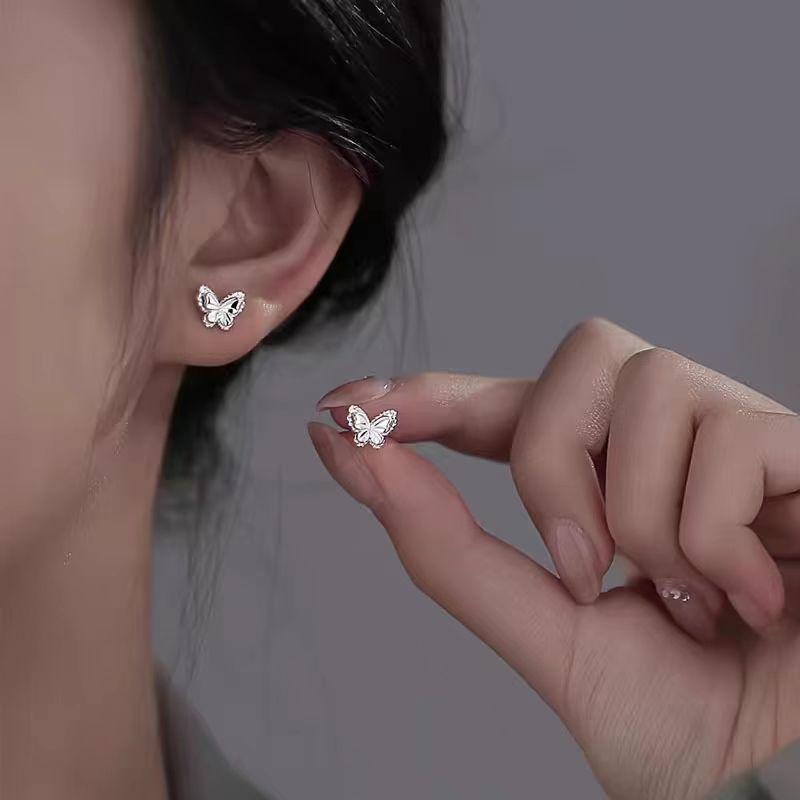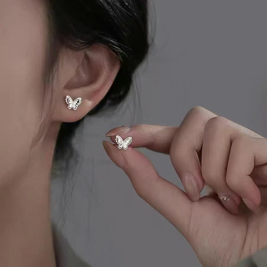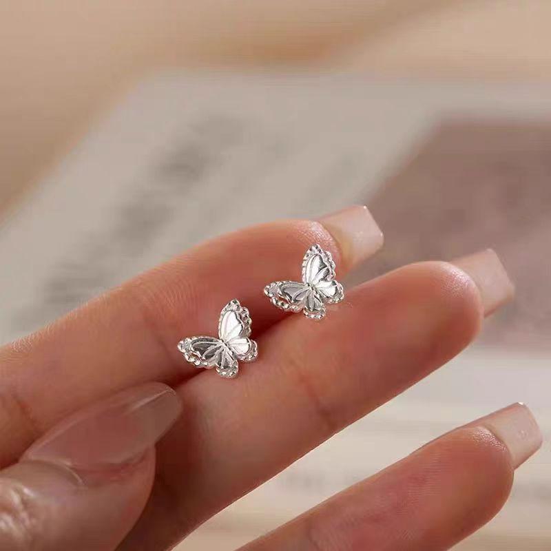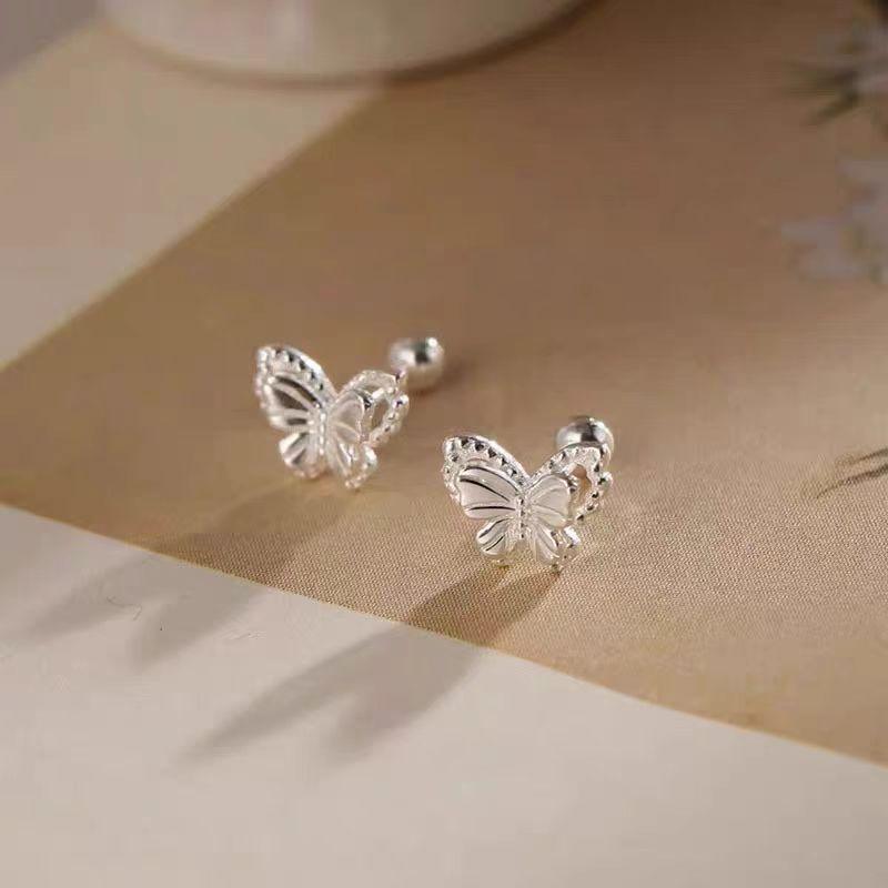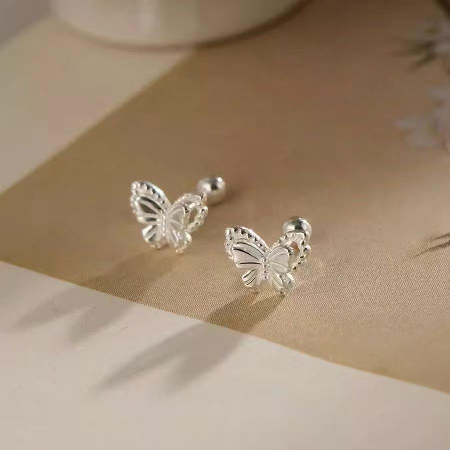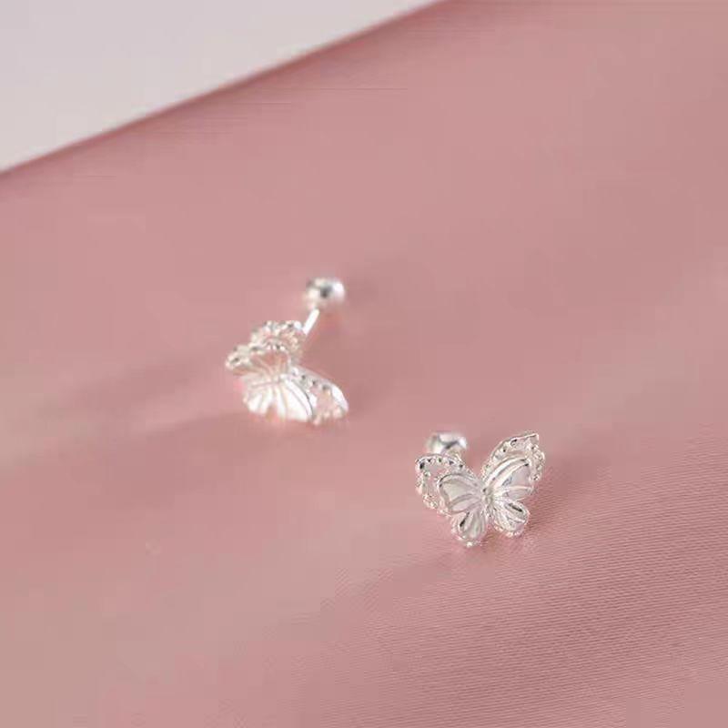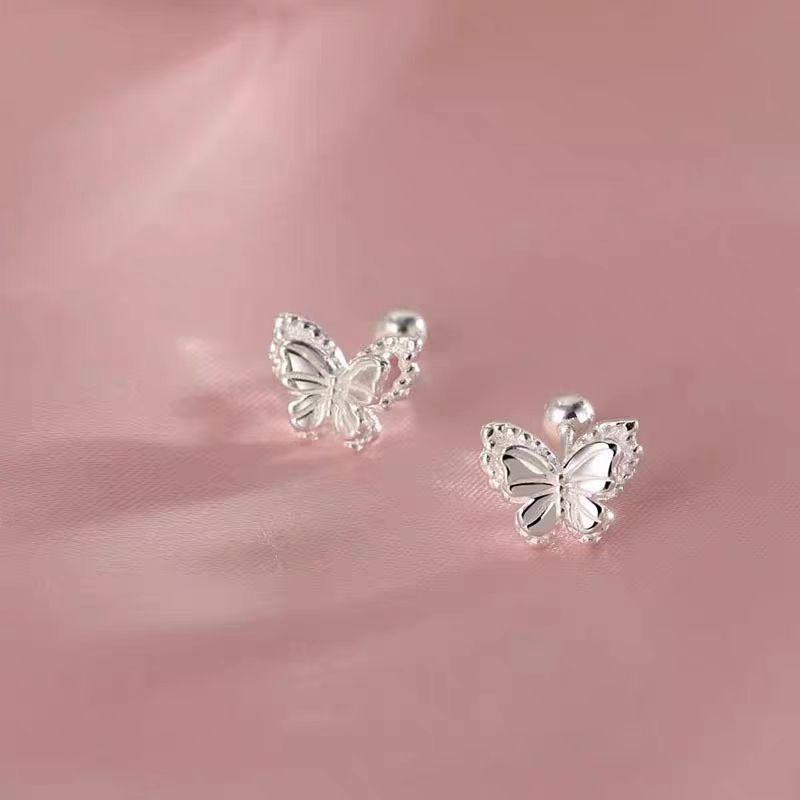 Pendientes de plata 990 con forma de mariposa y aguja para mujer, con agujeros en las orejas, diseño dulce y botón de tornillo, pequeños pendientes con forma de hueso en la oreja.