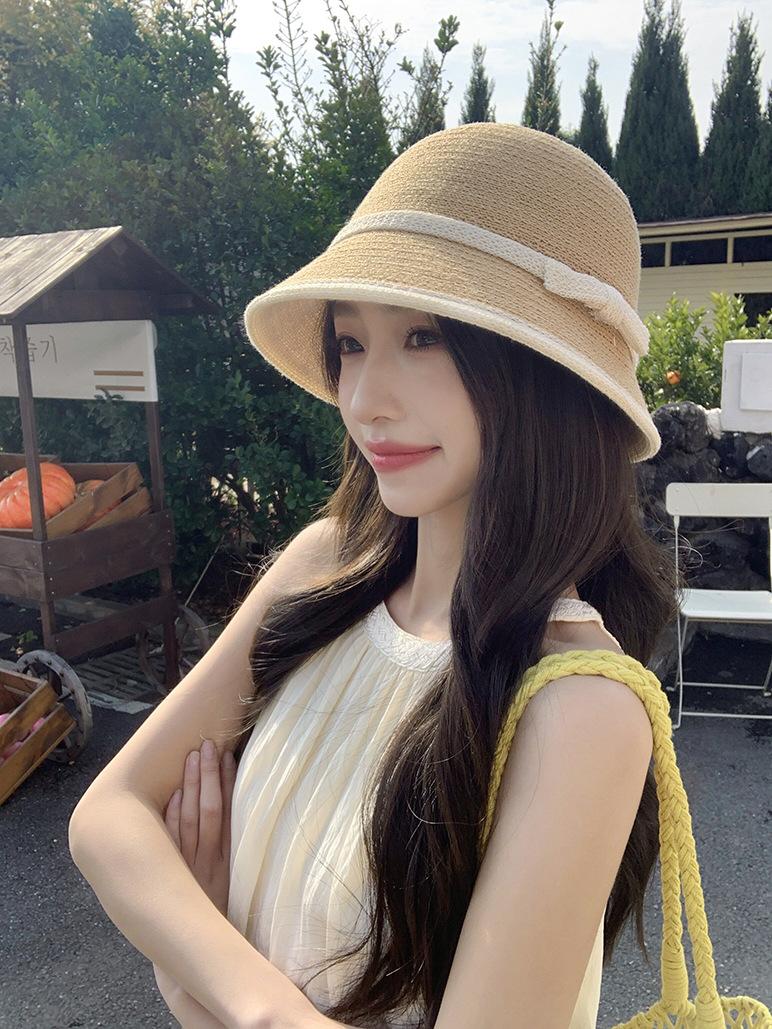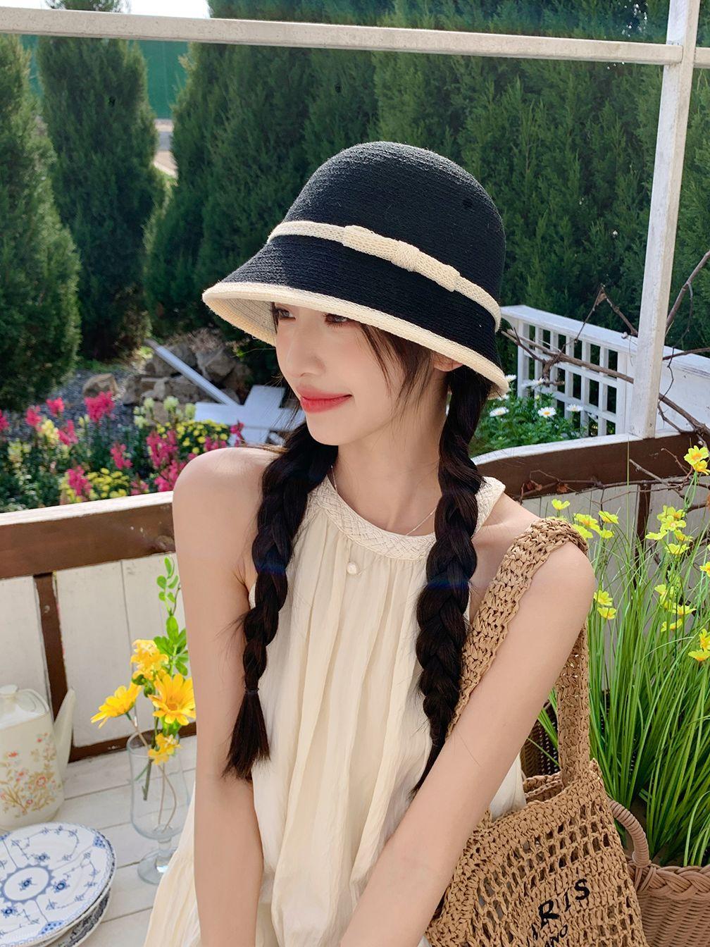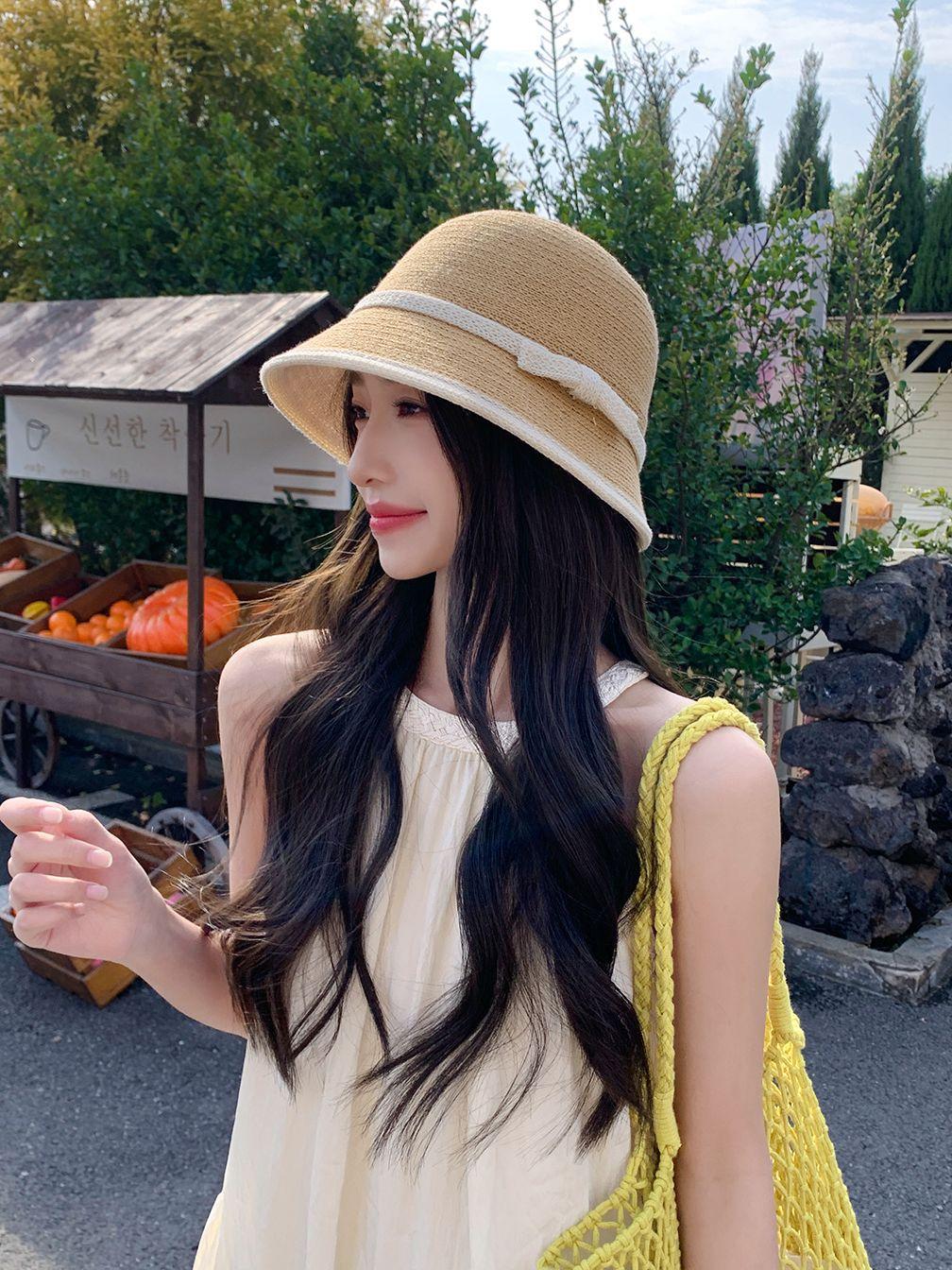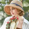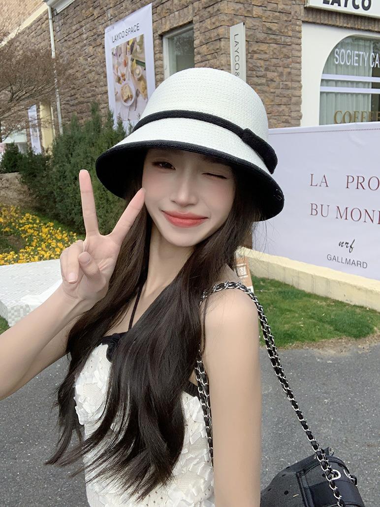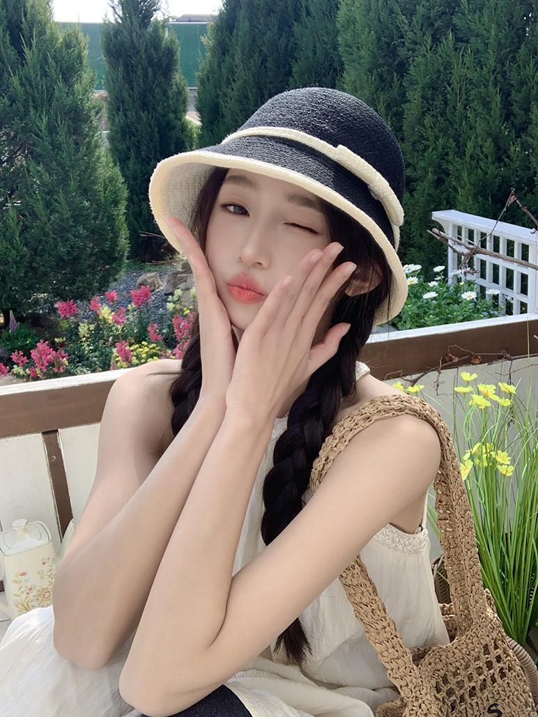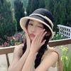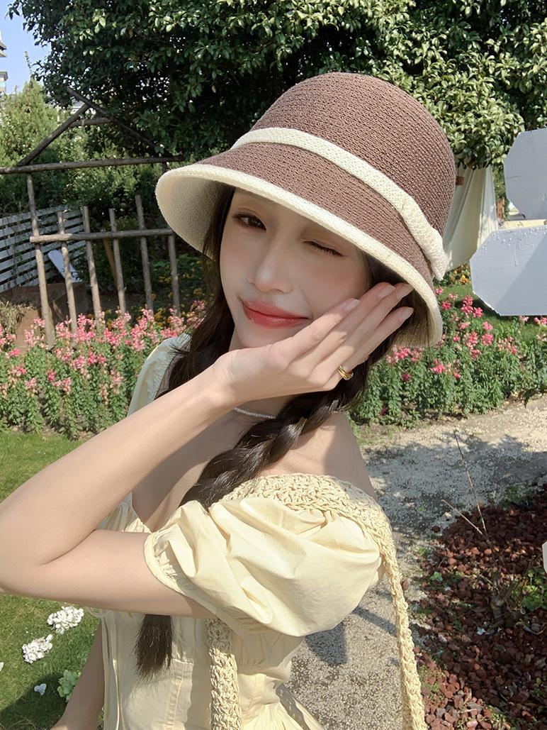 Sombrero de paja tejido estilo Hepburn francés para mujer, con lazo en contraste, ideal para uso en exteriores y vacaciones.