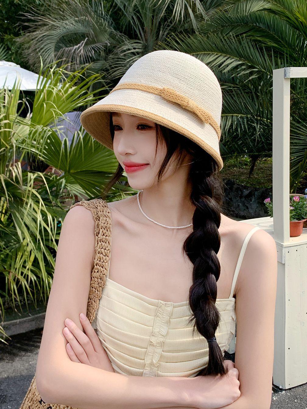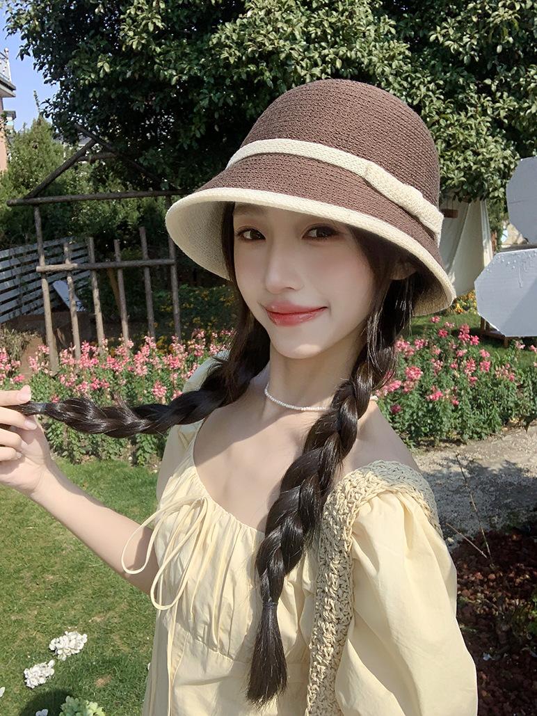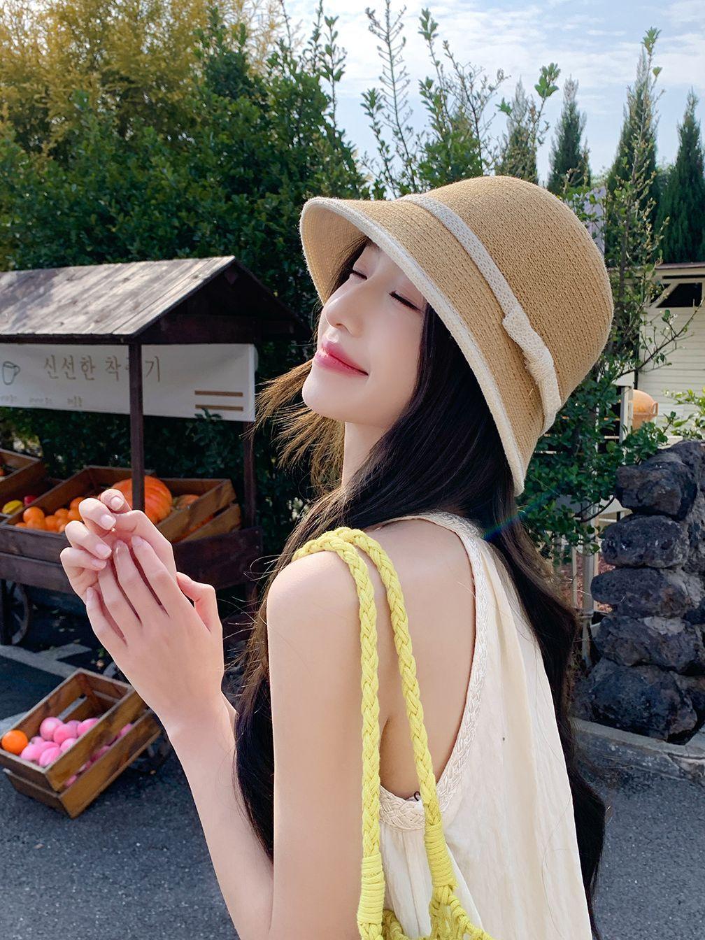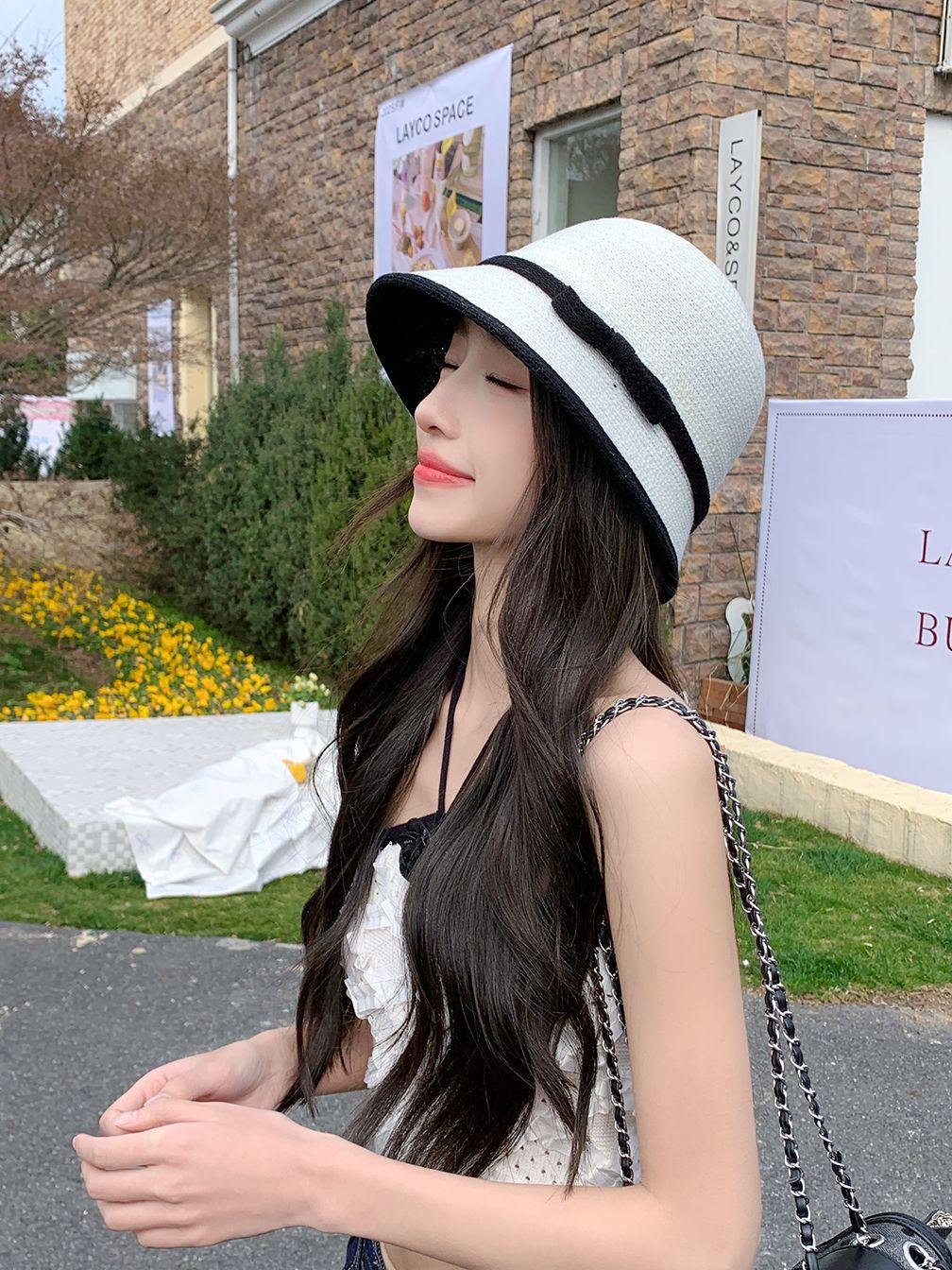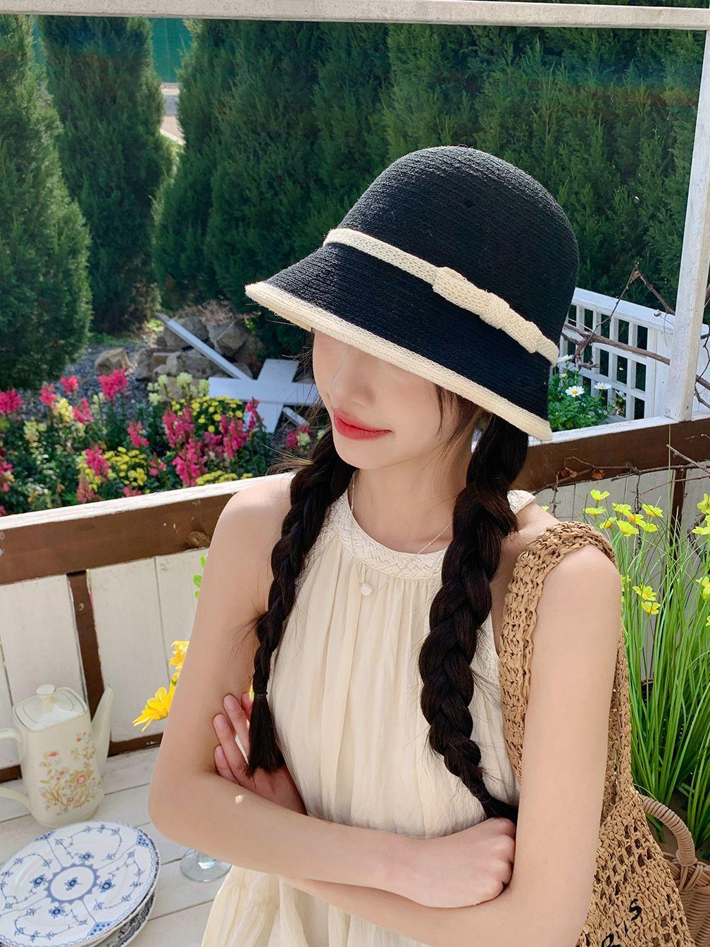 Sombrero de paja tejido estilo Hepburn francés para mujer, con lazo en contraste, ideal para uso en exteriores y vacaciones.