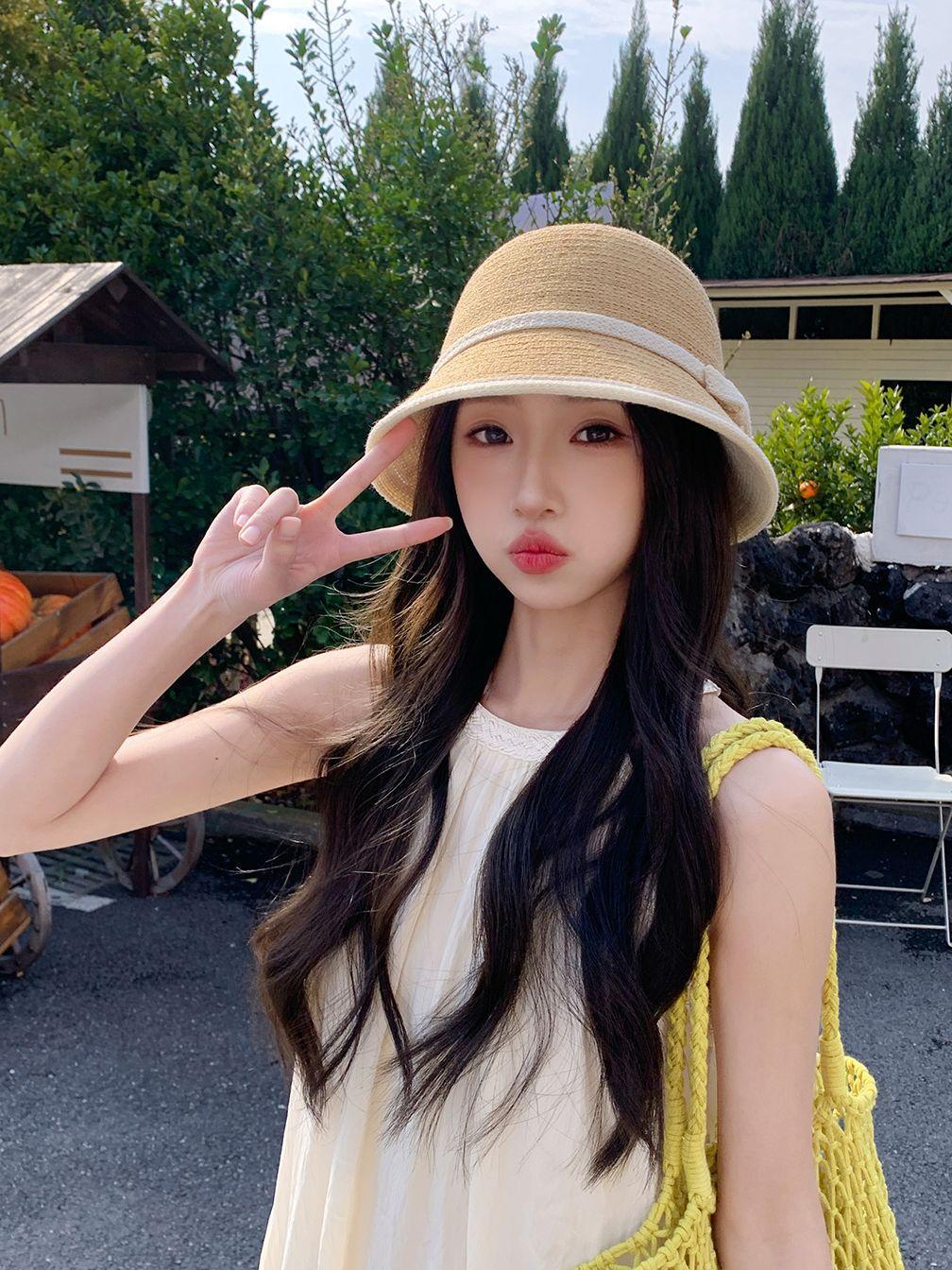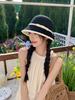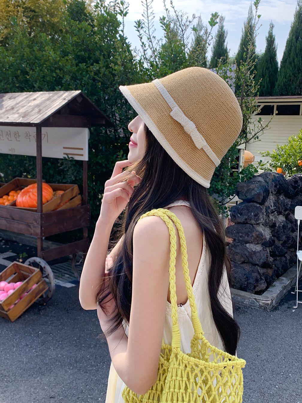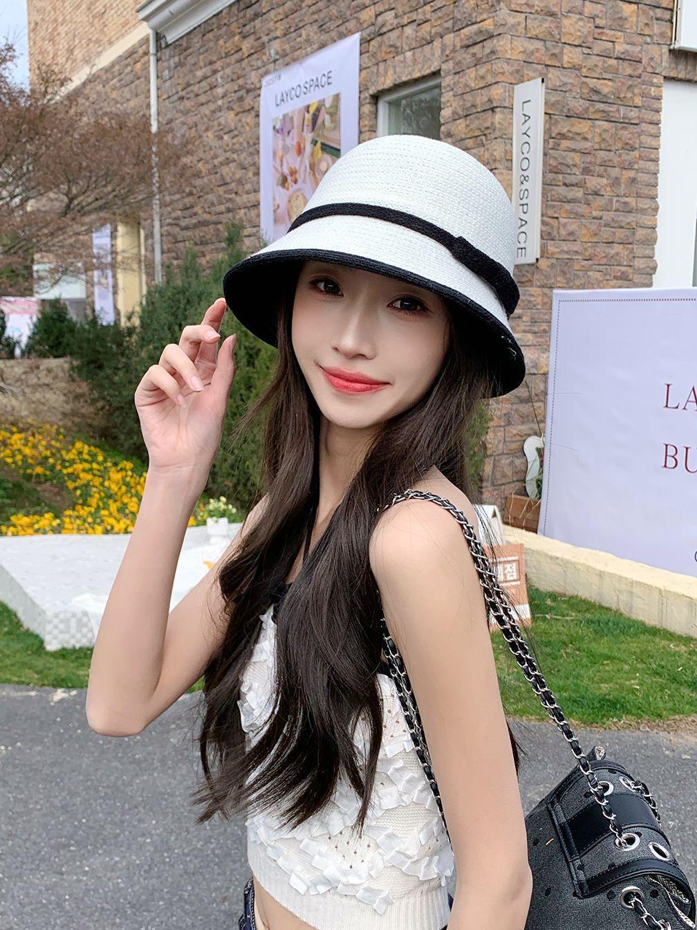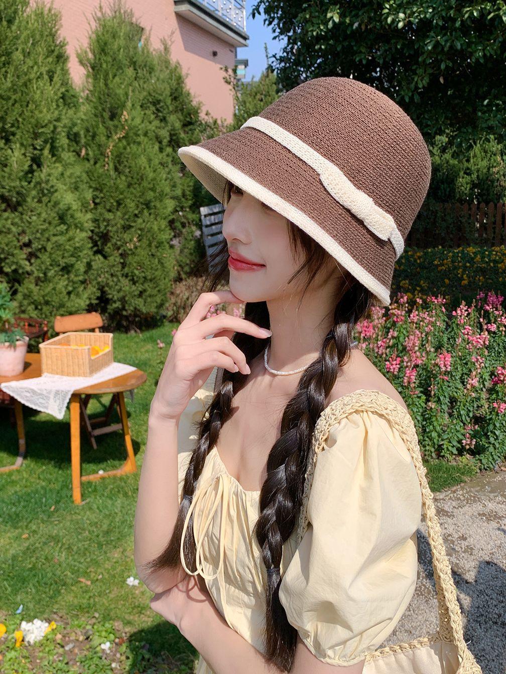 Sombrero de paja tejido estilo Hepburn francés para mujer, con lazo en contraste, ideal para uso en exteriores y vacaciones.