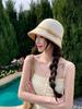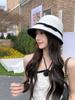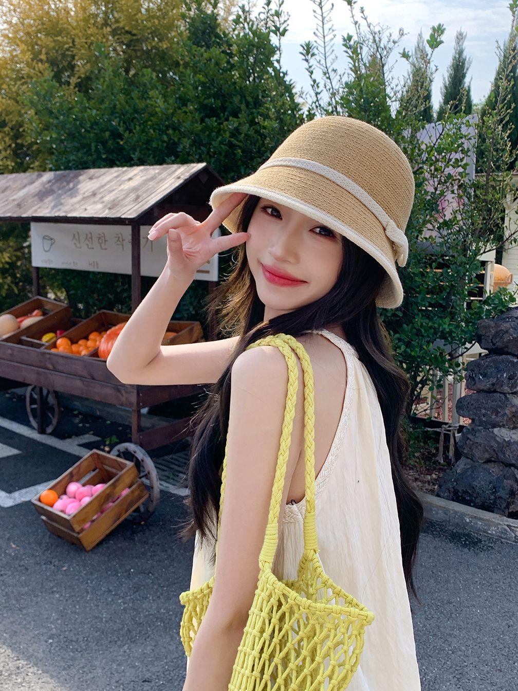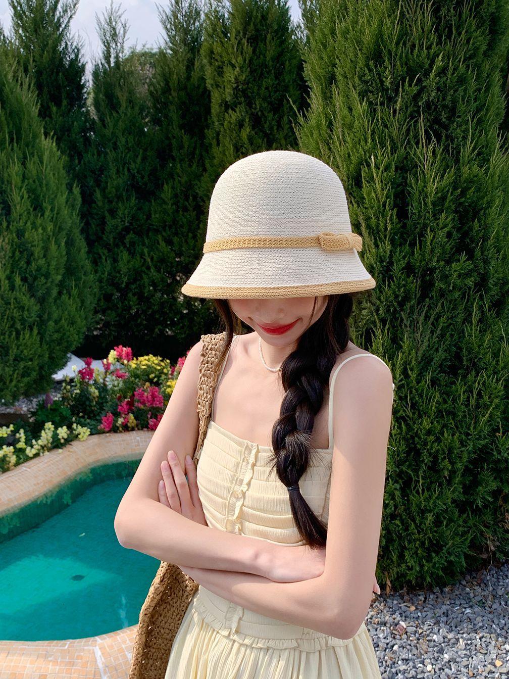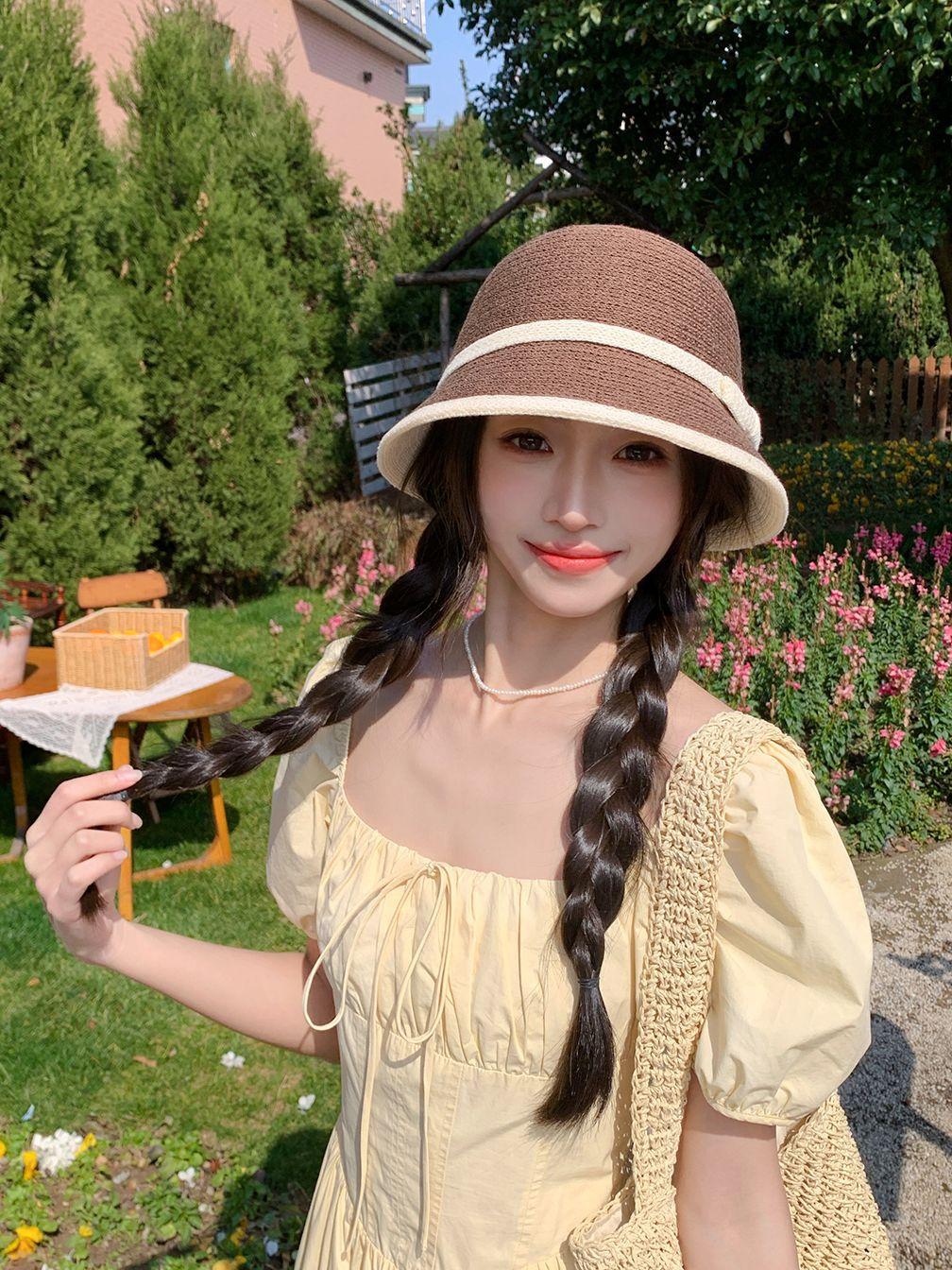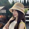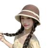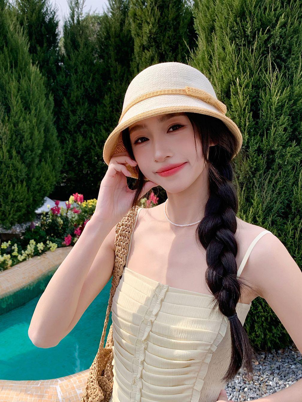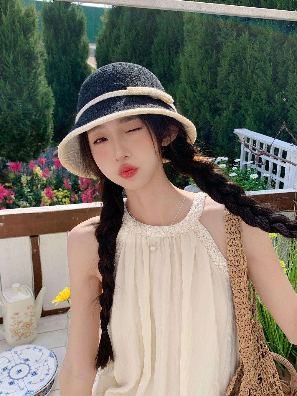 Sombrero de paja tejido estilo Hepburn francés para mujer, con lazo en contraste, ideal para uso en exteriores y vacaciones.