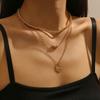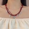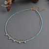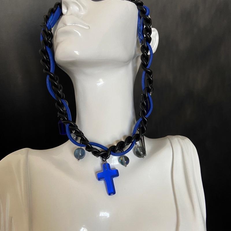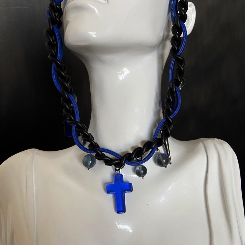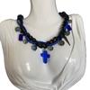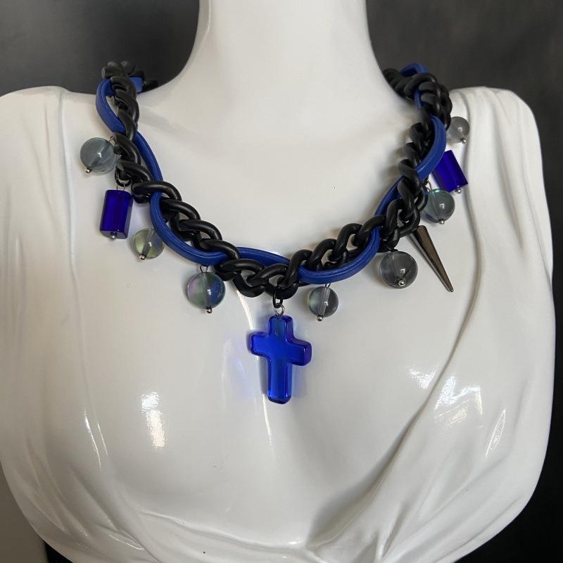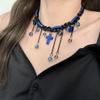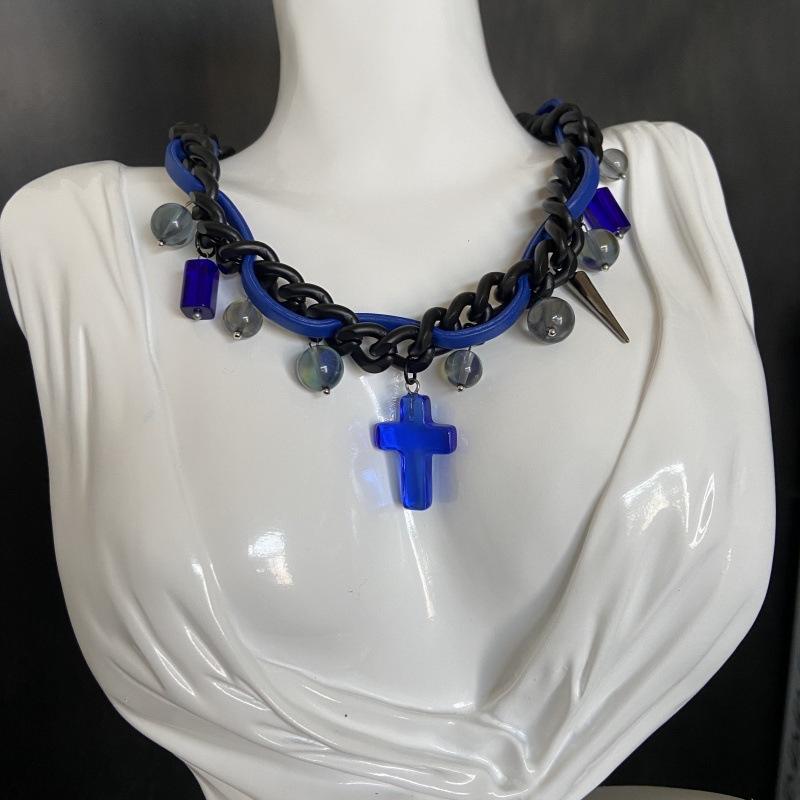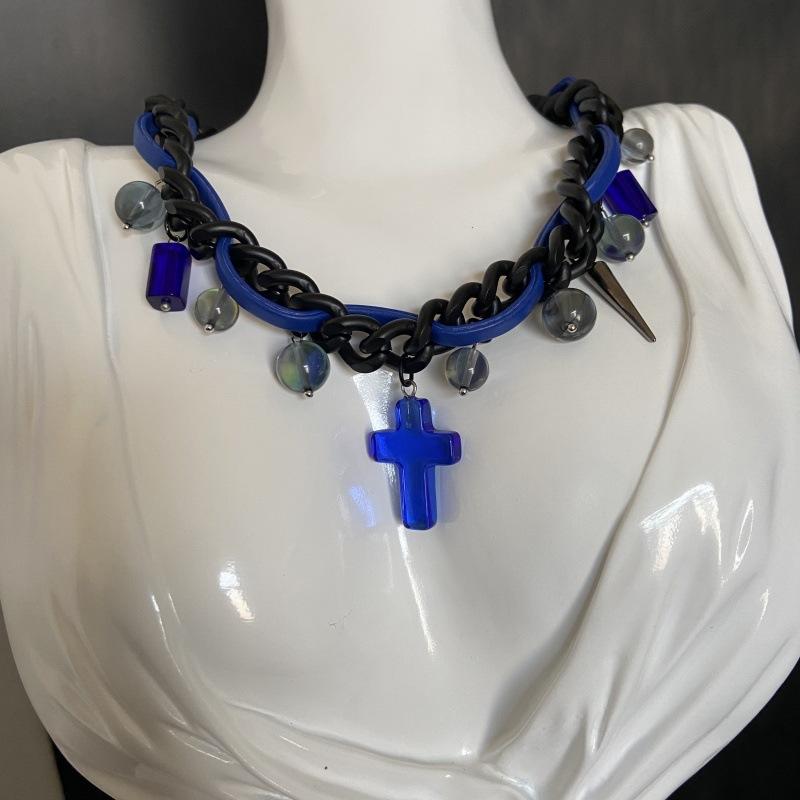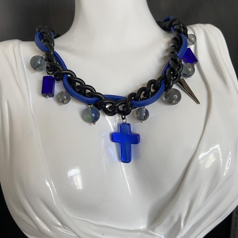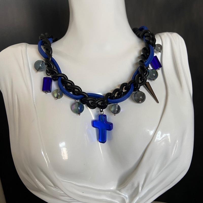 Collar de Moda Estilo Dulce Cool Spice para Mujer Cadena Azul con Costuras de Cuero Remaches Cruzados Cuentas de Vidrio Cadena Clavicular