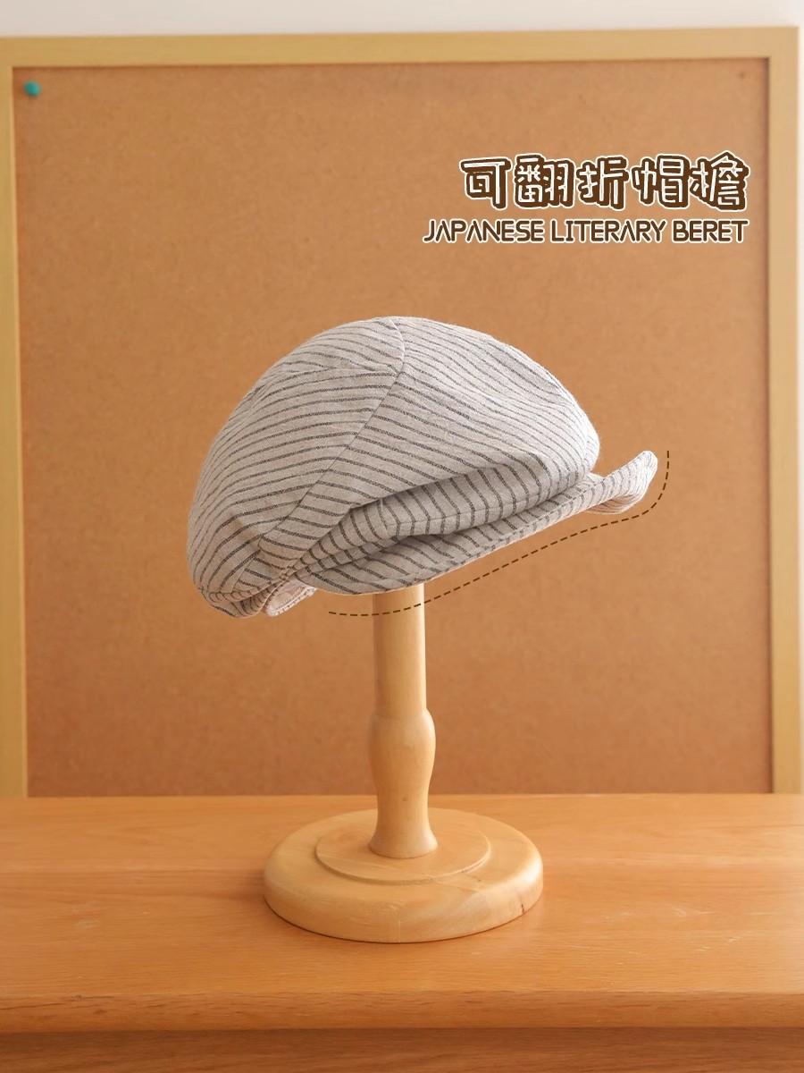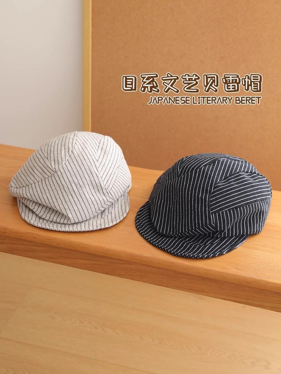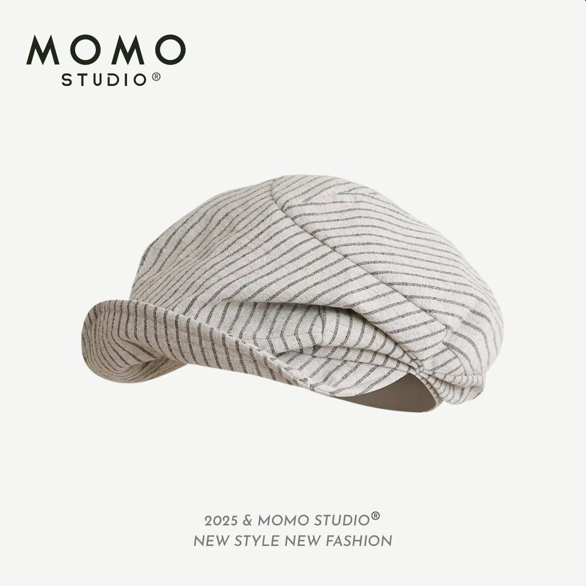 Gorra de Repartidor Rayada Vintage Japonesa Miss Mo Primavera y Verano Algodón Lino Transpirable Sombrero de Pintor Diseño Nicho Plisado Botón