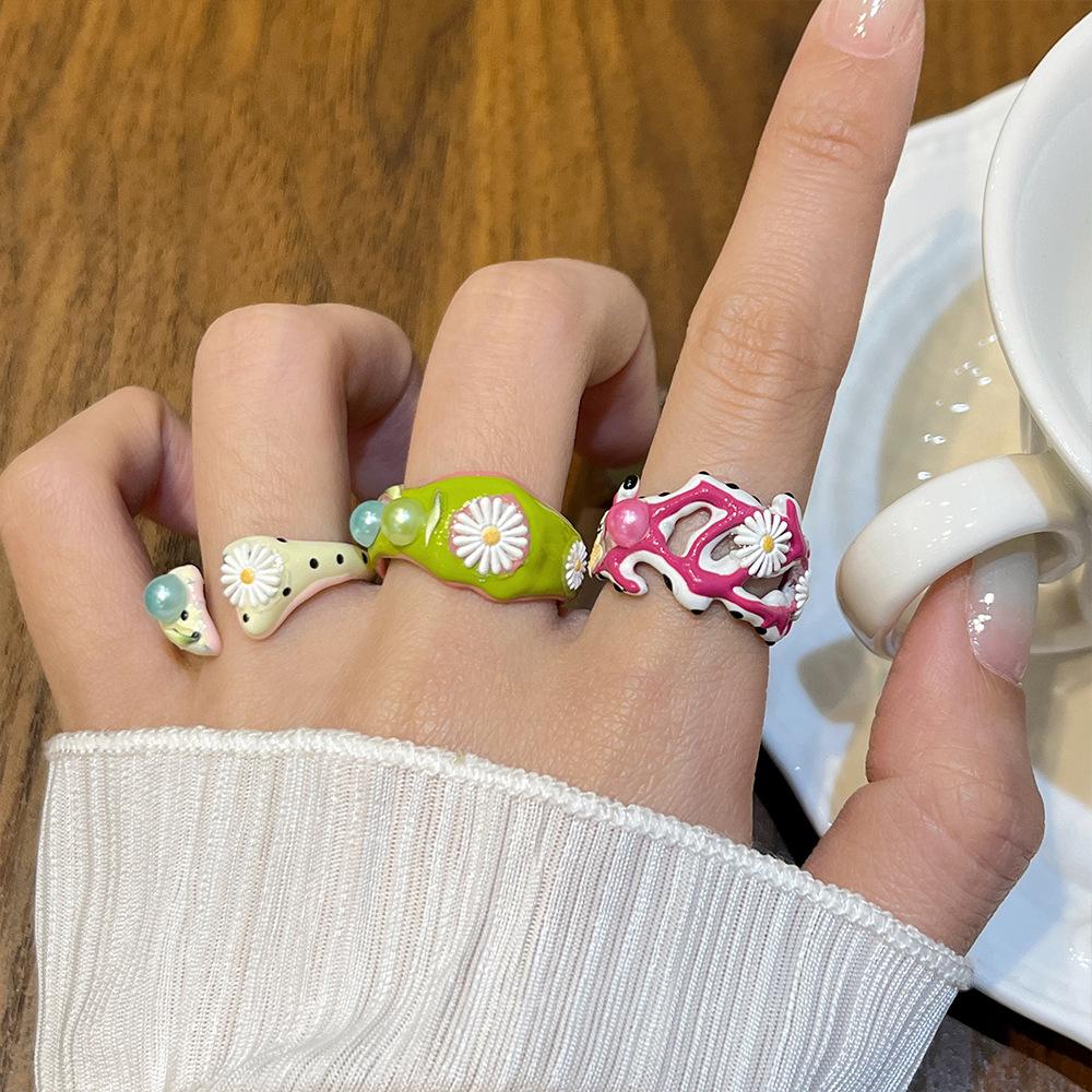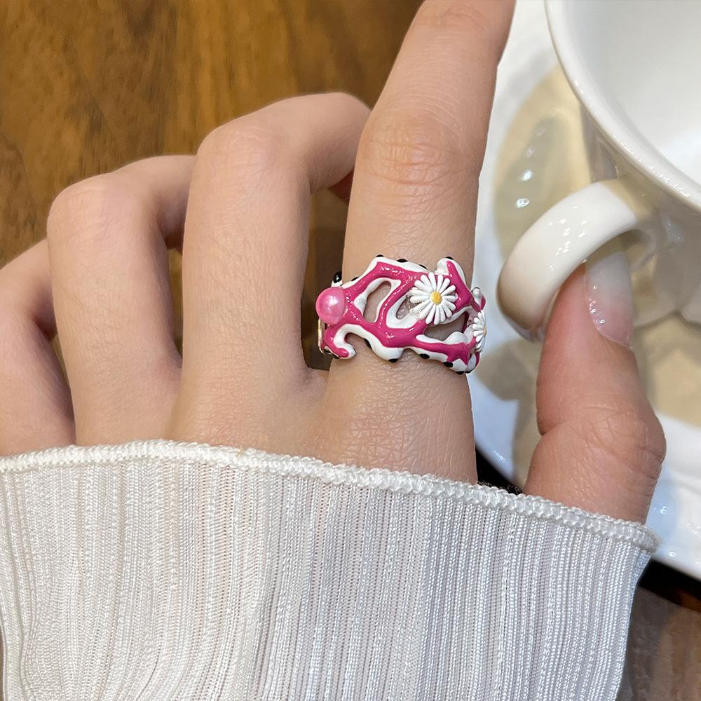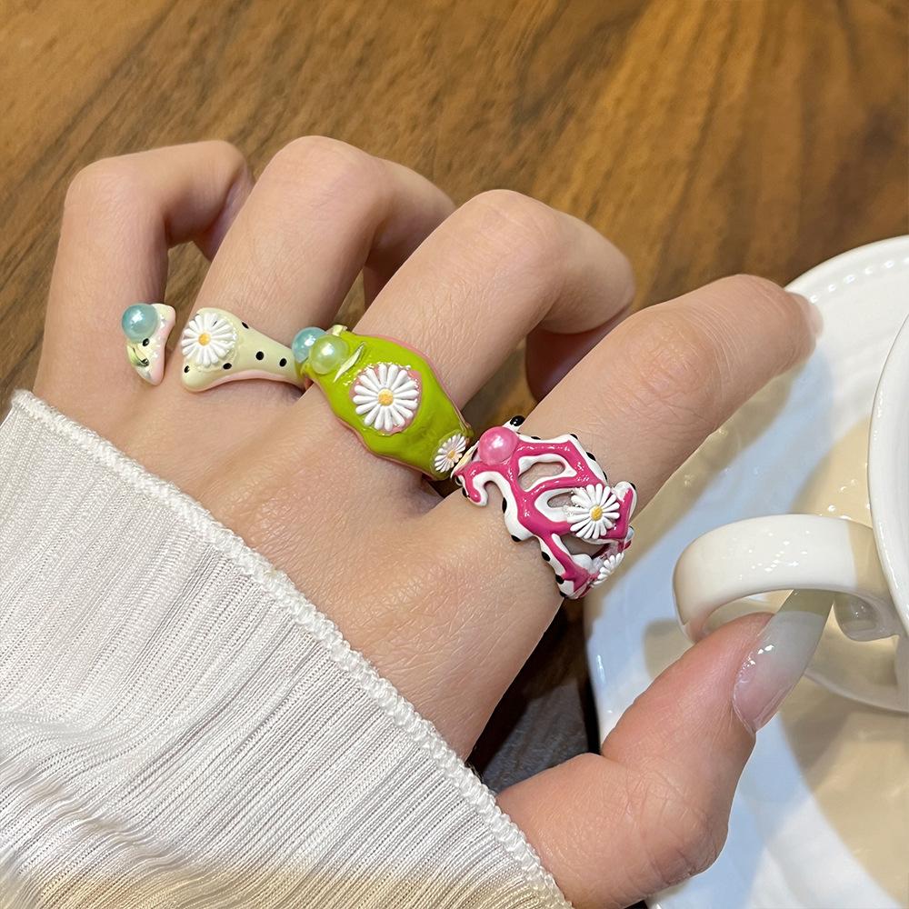 Anillo de Margarita Pintado Hecho a Mano con Goteo de Aceite para Mujer, Anillo de Dedo Índice Creativo Personalizado de Moda Hip-Hop Ins para Mujer