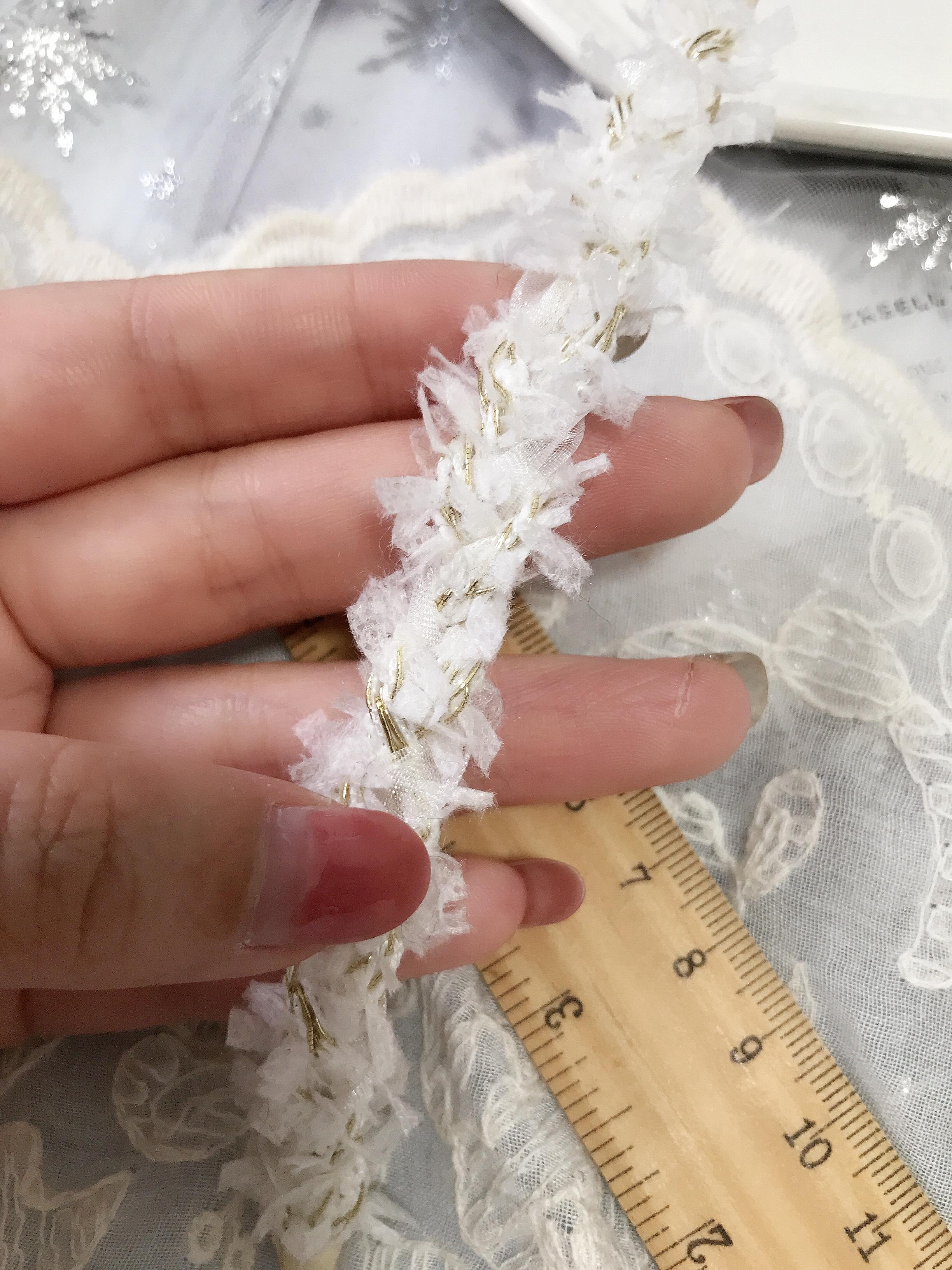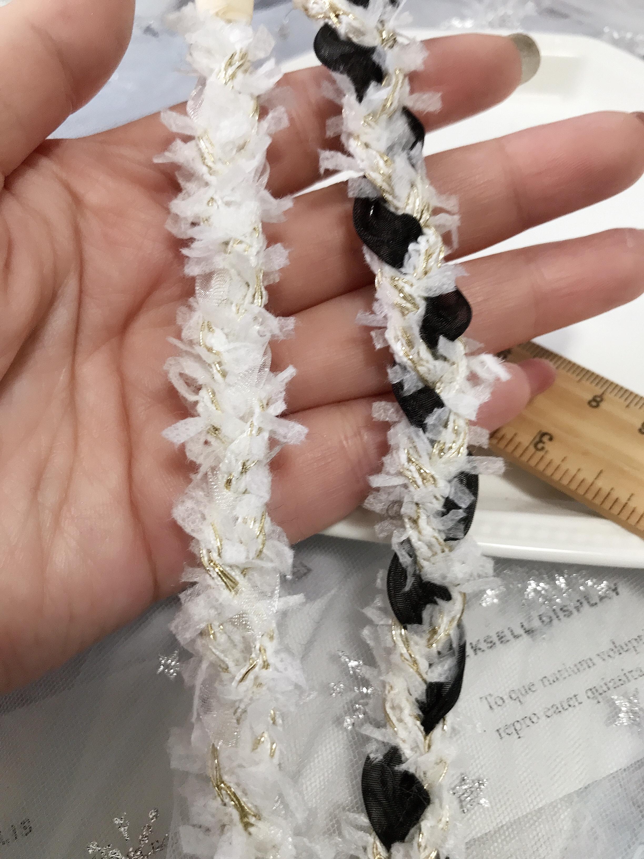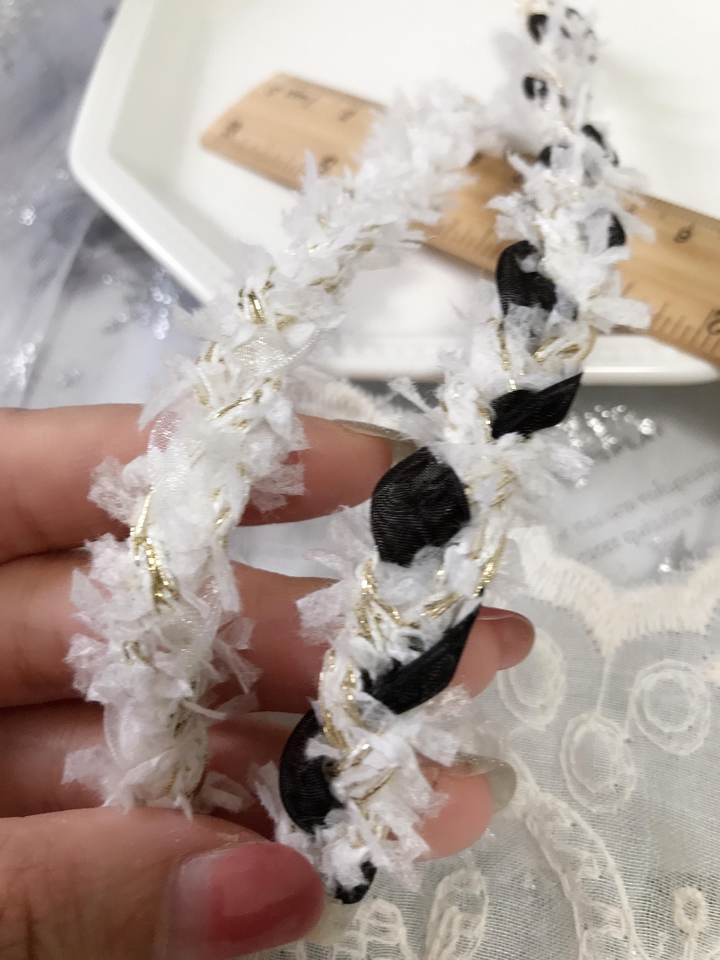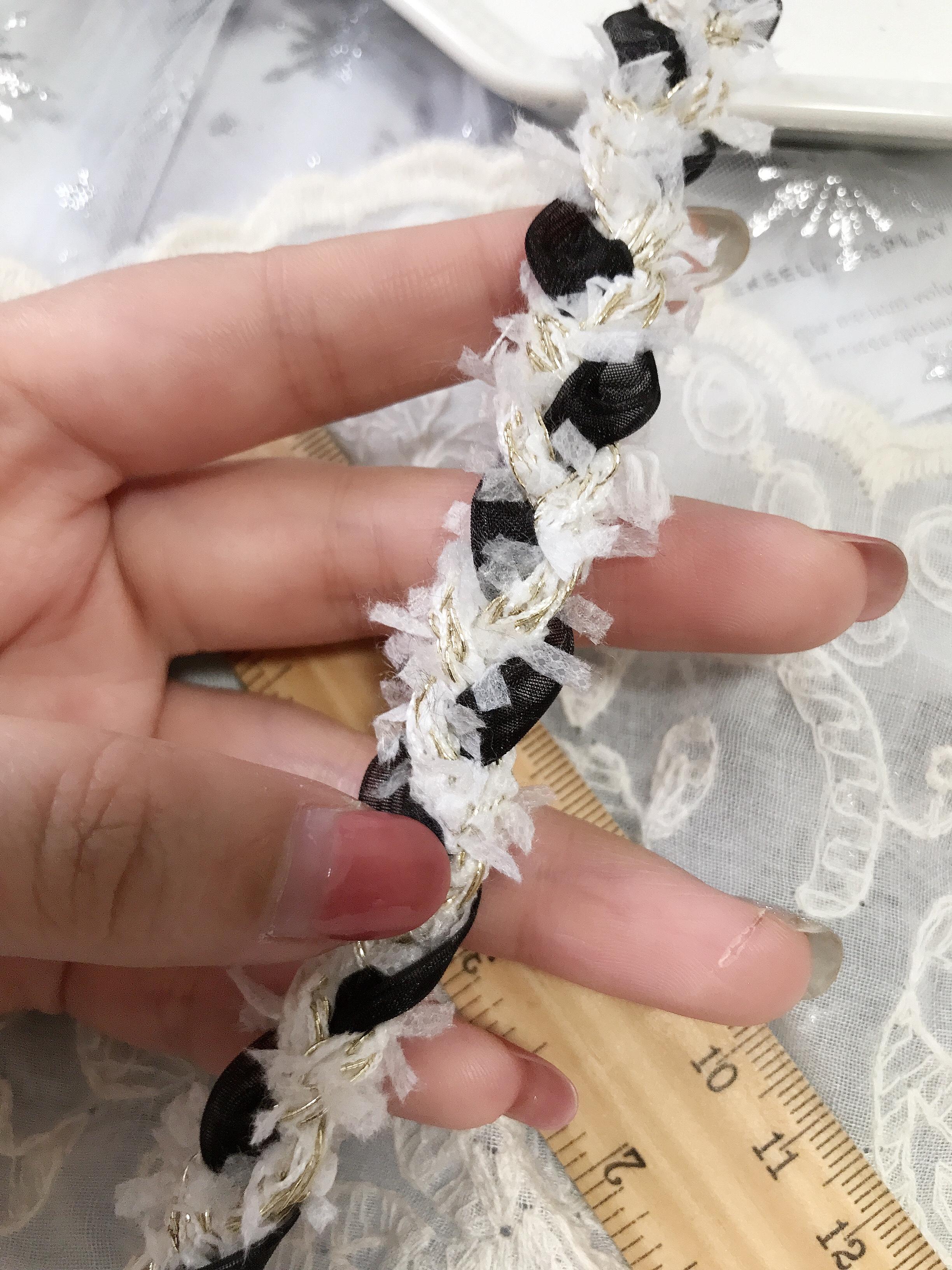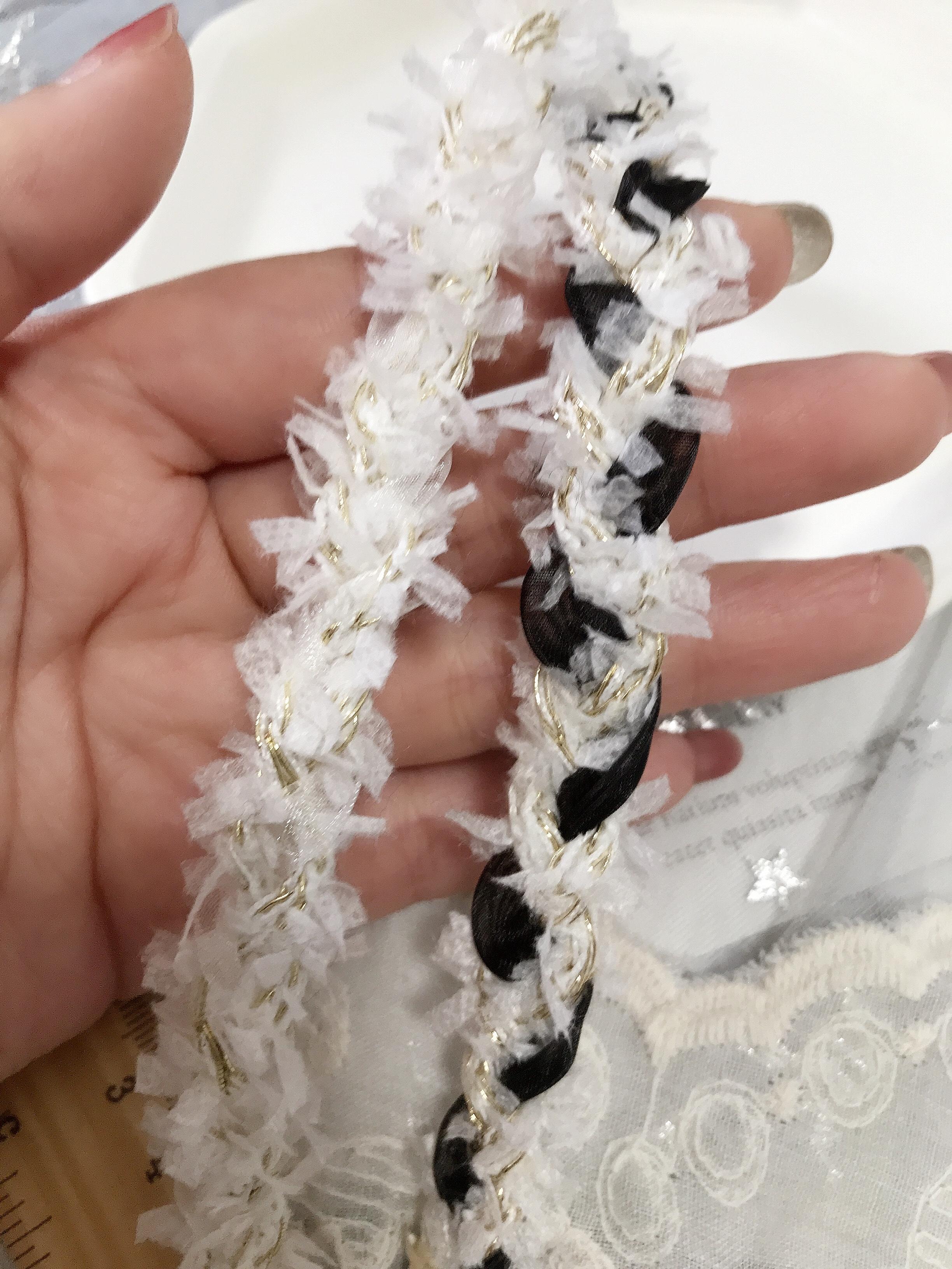 Venta al por mayor de gasa blanca y negra de 1,5 cm de ancho con rebaba de cepillo de dientes dorada, pequeño accesorio de ropa de encaje trenzado de estilo fragante