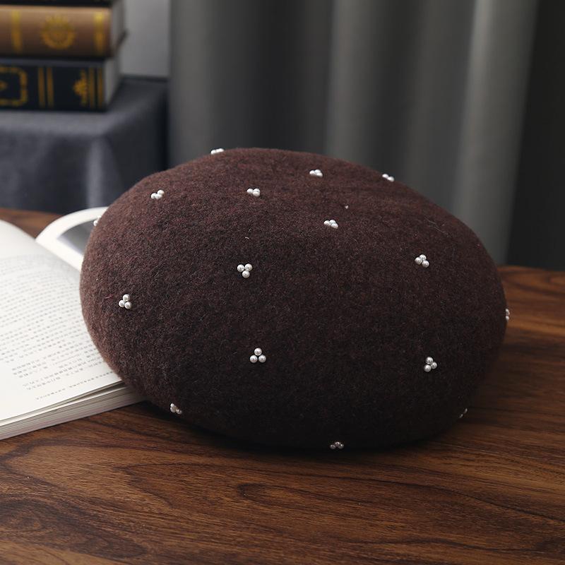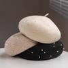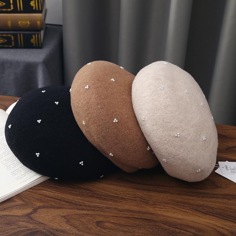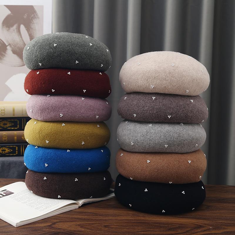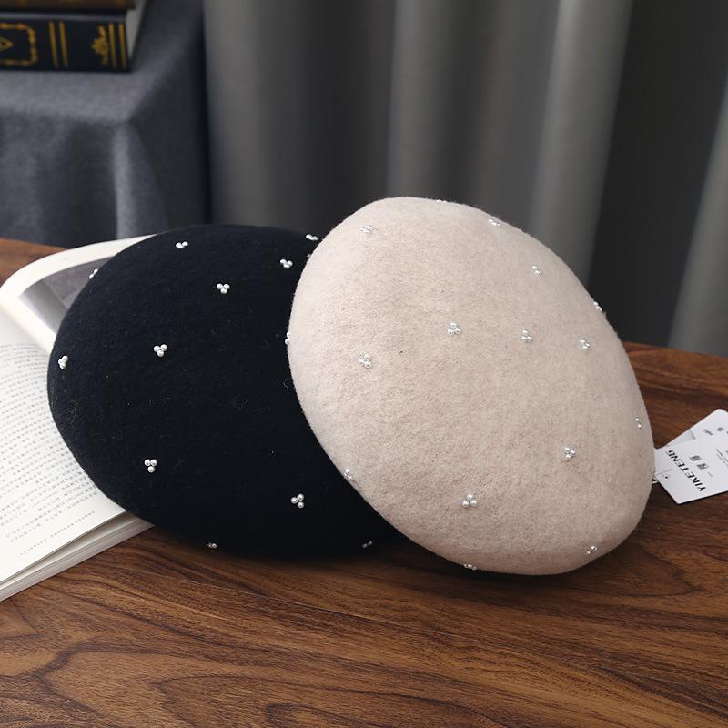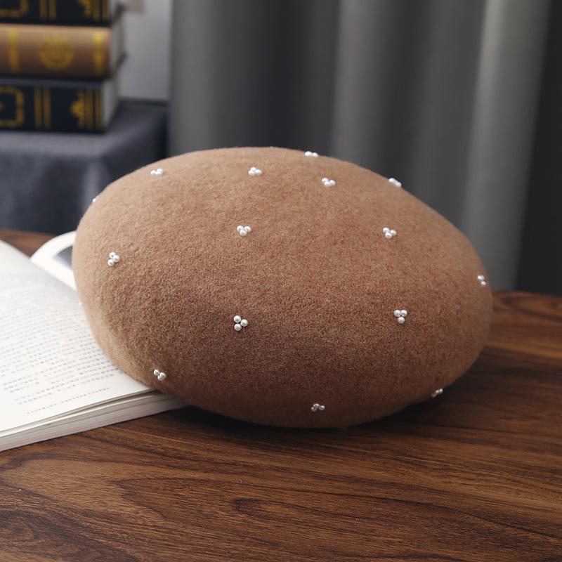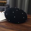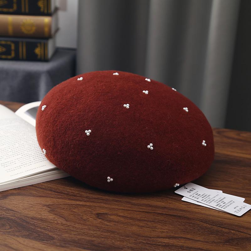 Boina de lana perlada estilo japonés estilo rojo de red para mujer, gorro de pintor cálido retro de invierno, elegante y elegante gorro de calabaza a la moda.
