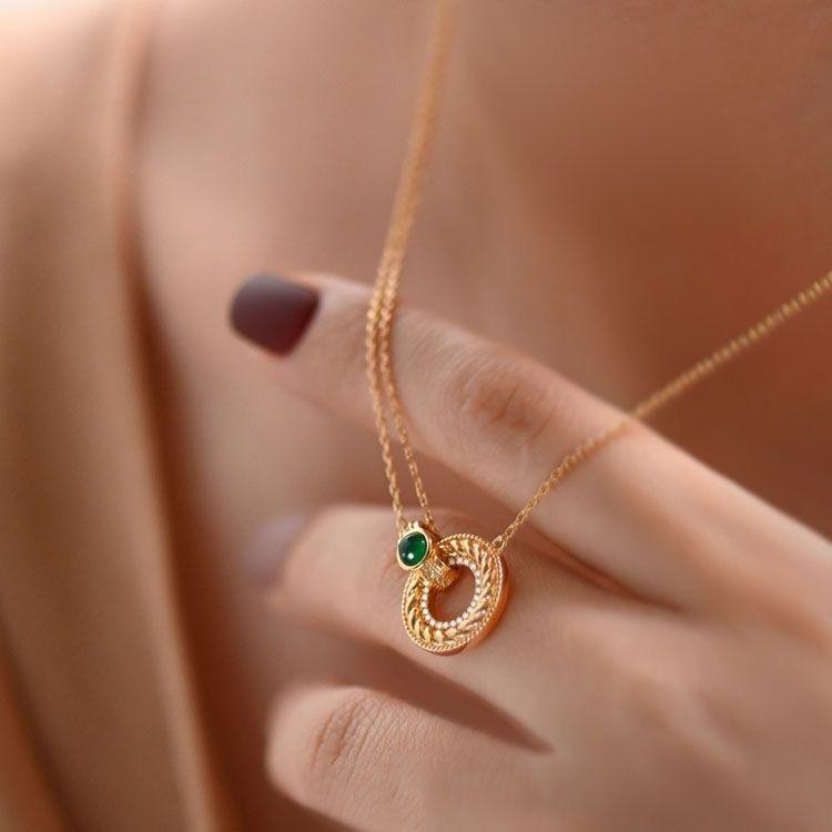 Collar Vintage "Dona Matcha" de Ágata Verde Chapado en Oro con Colgante Trenzado Estilo Francés Nuevo Brújula Cielo Estrellado