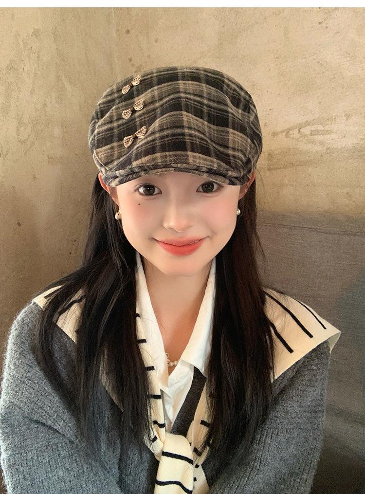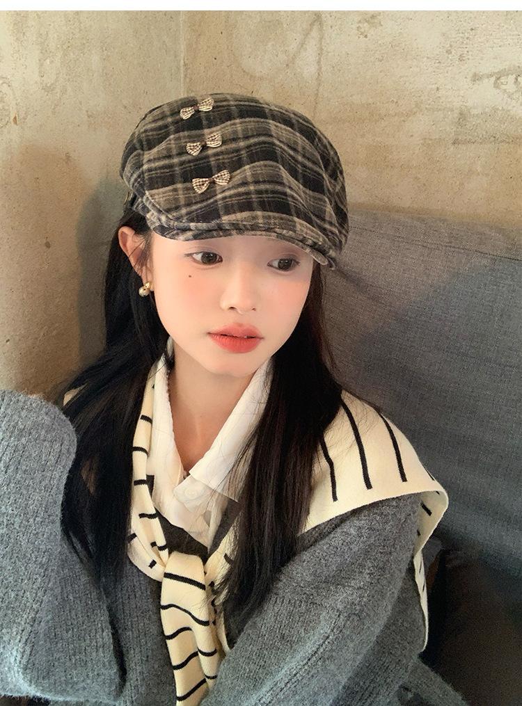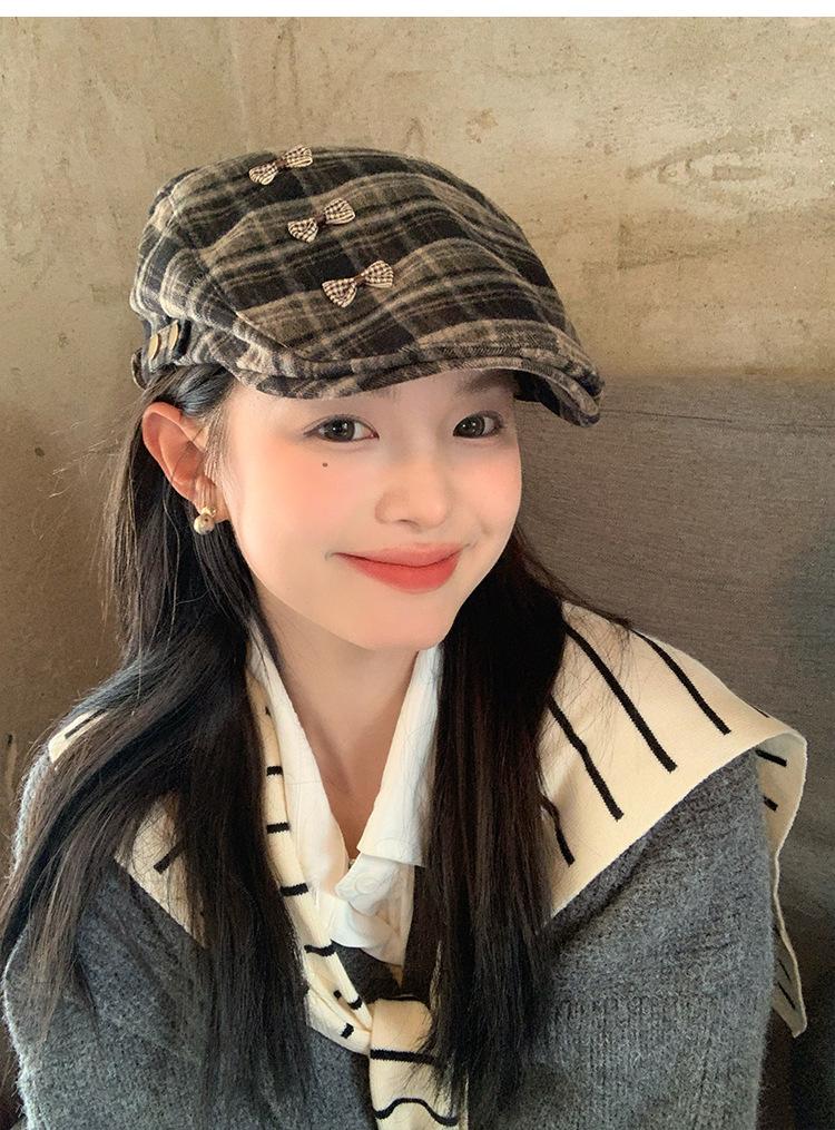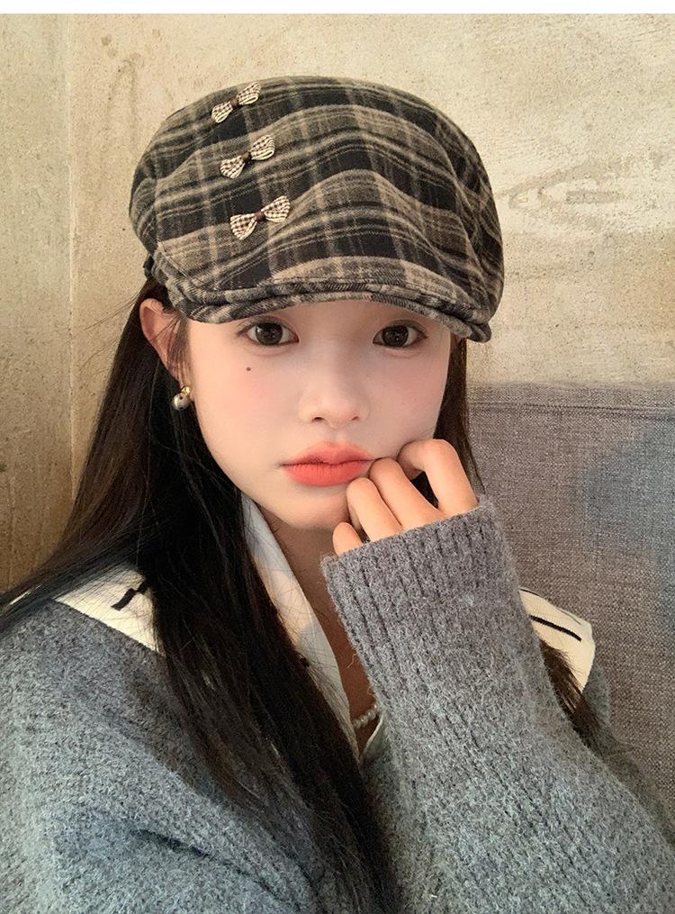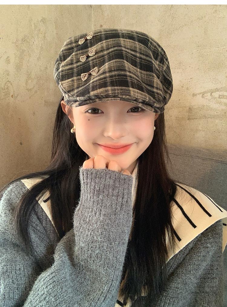 Otoño e Invierno DIY Lazo a Cuadros Gorra Plana para Mujer 2024 Nuevo Versátil Antirostro Boina Pequeña Nicho