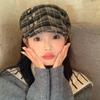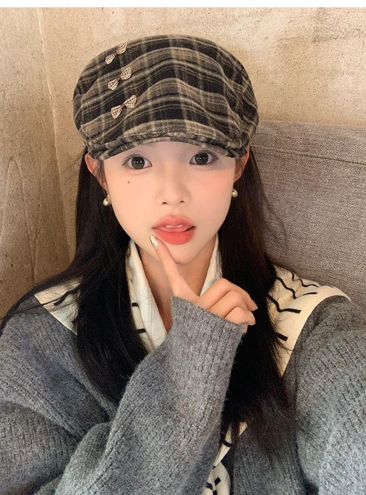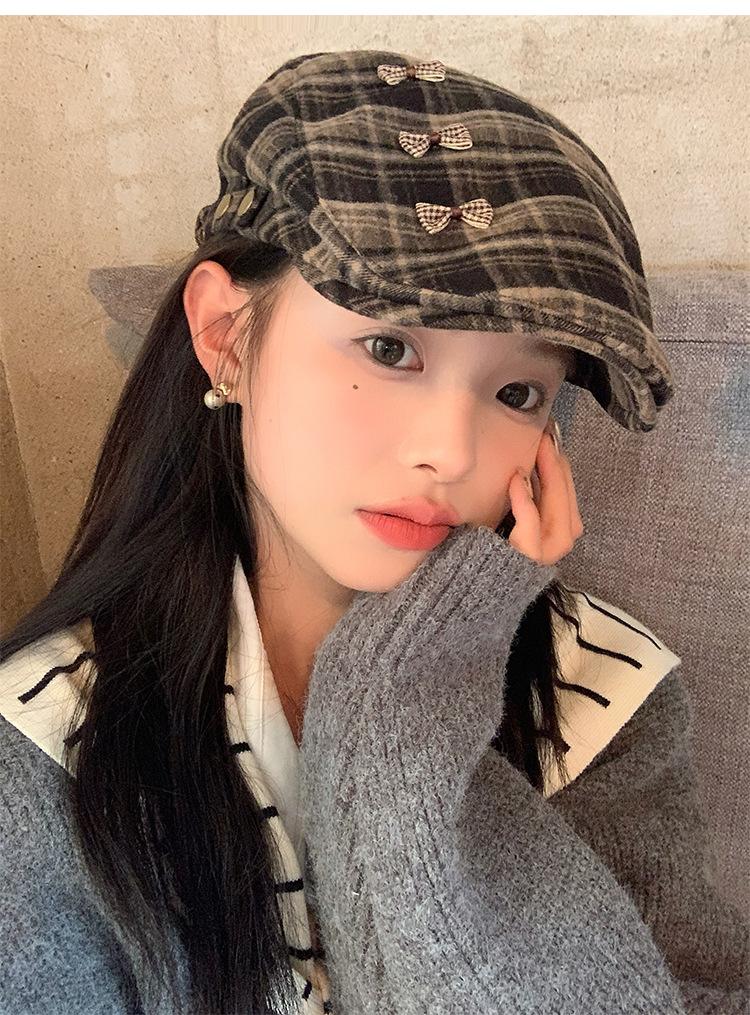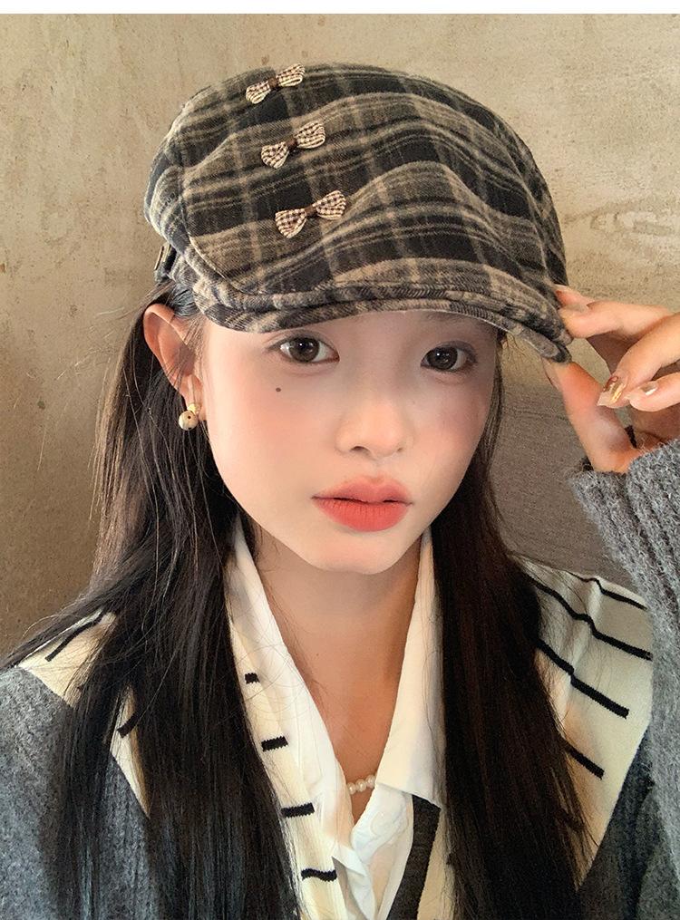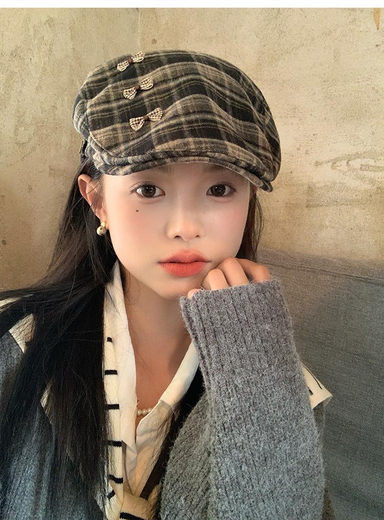Otoño e Invierno DIY Lazo a Cuadros Gorra Plana para Mujer 2024 Nuevo Versátil Antirostro Boina Pequeña Nicho
