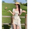 Vestido estilo francés retro azul con cordones y estampado floral para niña, falda estilo fiesta de corte A con cintura ajustada y adelgazante.