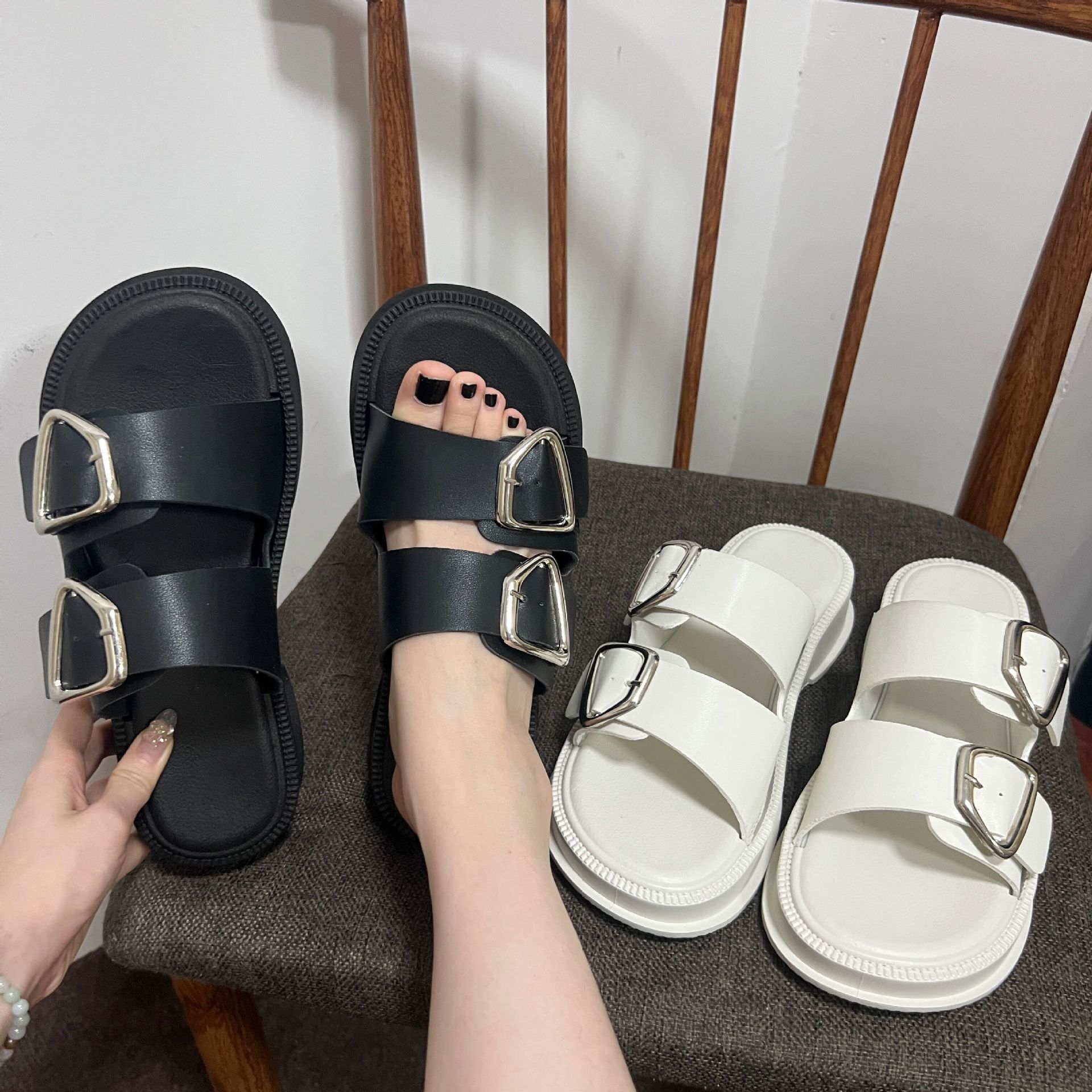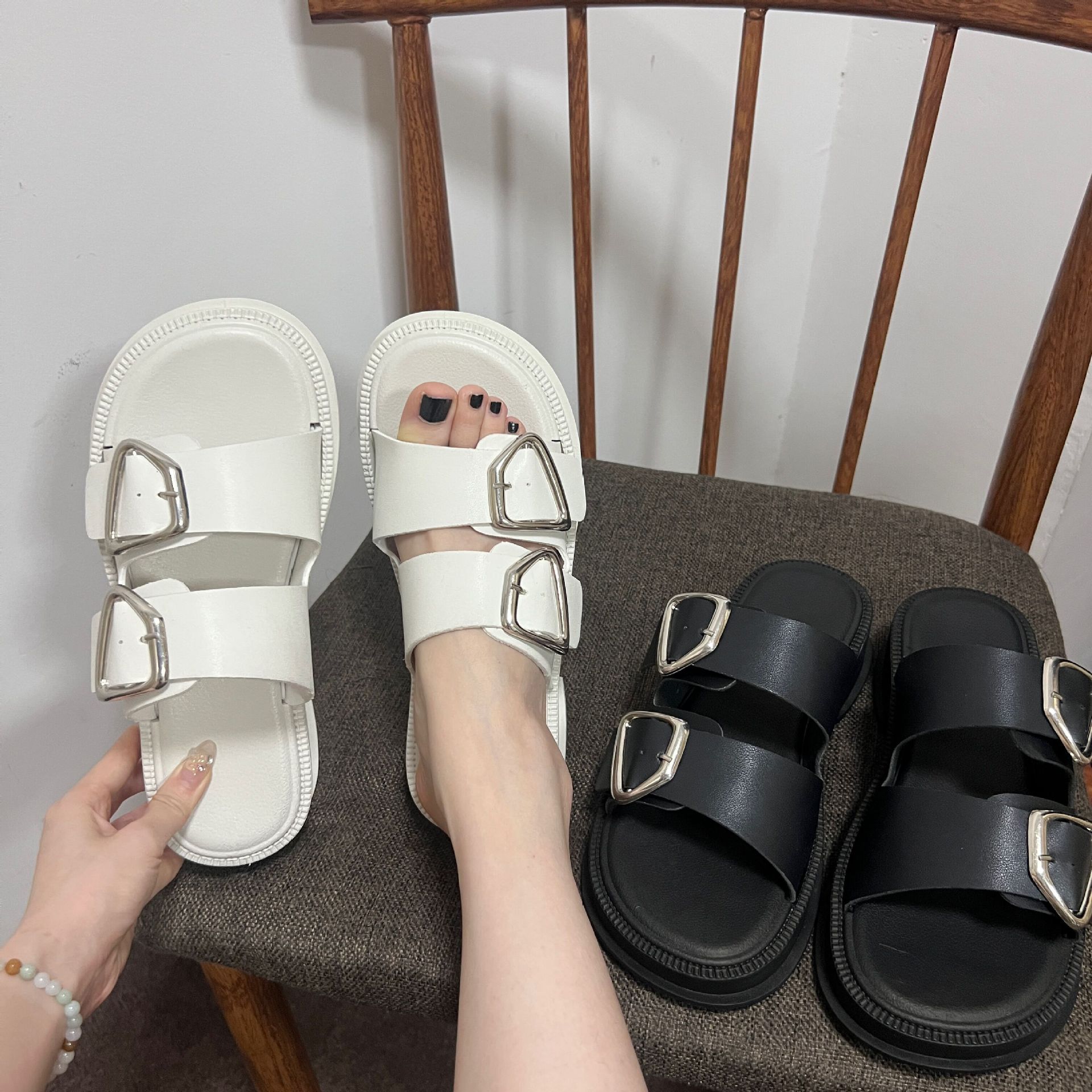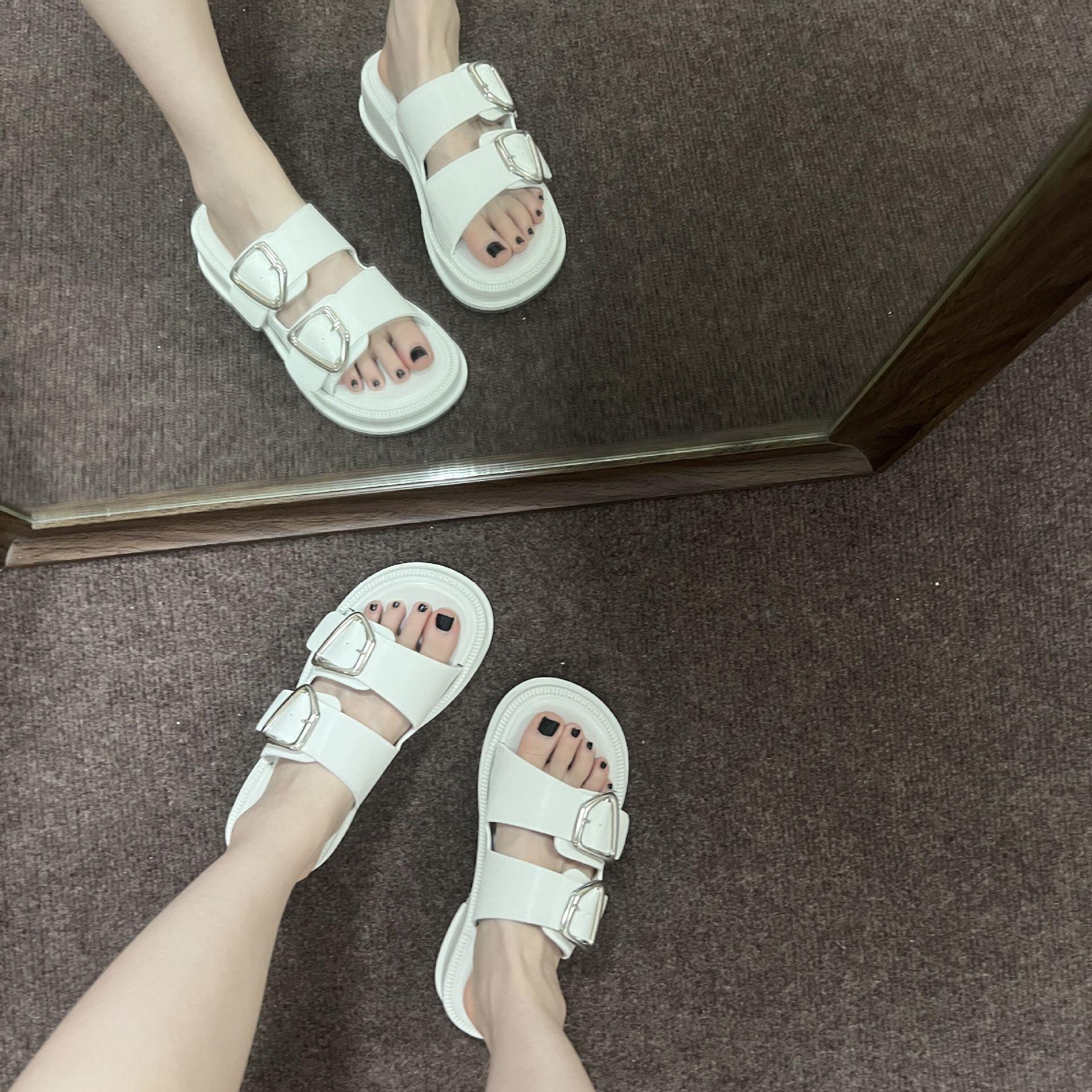 Black-Double Slippers with Four Buckle, White-Double Slippers with Four Buckle