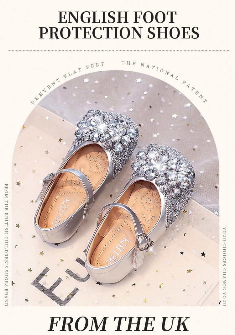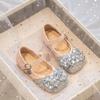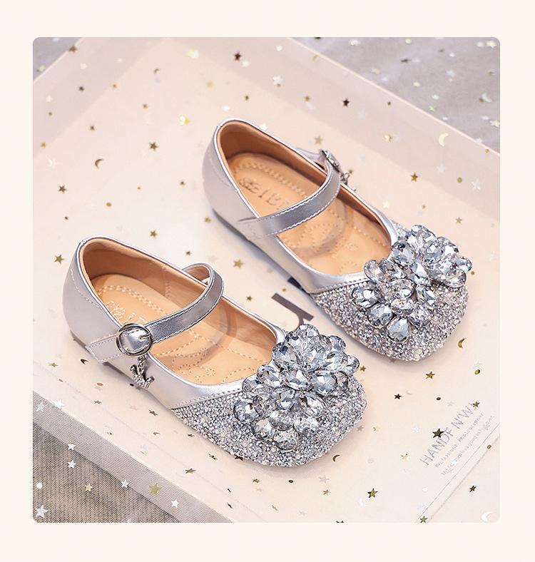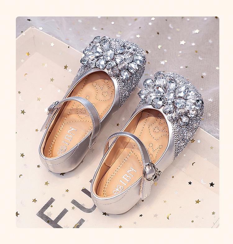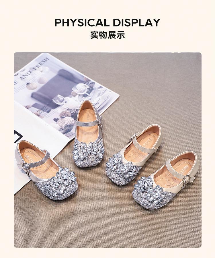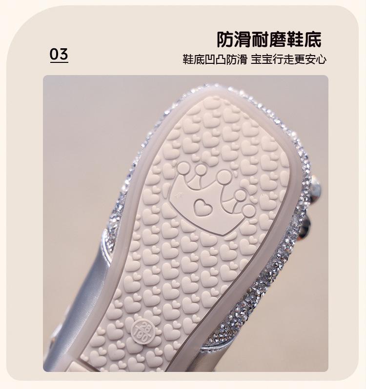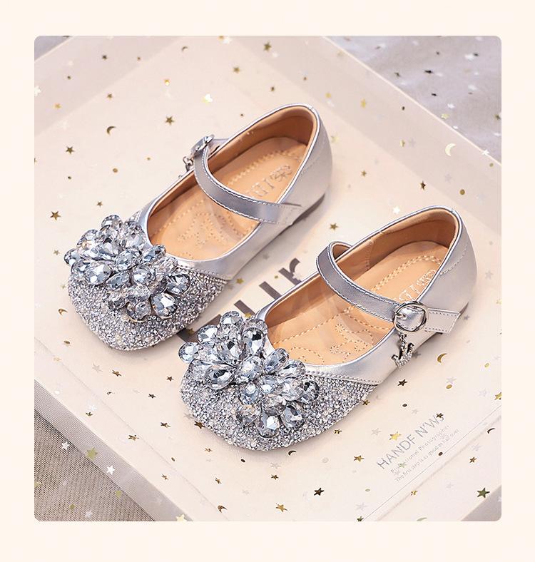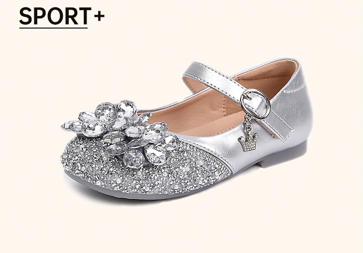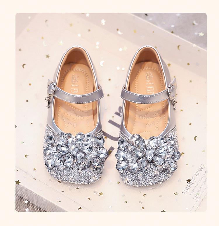 Zapatos de princesa para niñas, zapatos de princesa Elsa para niños, novedad de verano y otoño de 2025, zapatos de suela suave de cuero con cristales plateados.